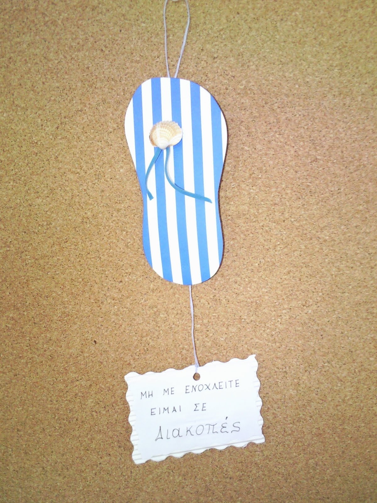 Καλησπέρα κ’ Χρόνια Πολλά. Είμαστε 2 δασκάλες-φίλες Α’ τάξης και σκεφτόμαστε να κάνουμε ένα δωράκι για το καλοκαίρι στους μαθητές μας:την σαγιονάρα!! Πώς σου ακούγεται σαν ιδέα? Μήπως μπορείς να μας βοηθήσεις με το πατρόν? Εσύ ως νηπιαγωγός, μήπως έχεις καμιά άλλη ιδέα για δωράκι? (εύκολο κ’ κυρίως οικονομικό!!!!!) Φιλιά: ΣΟΥΛΑ-ΝΙΚΗ