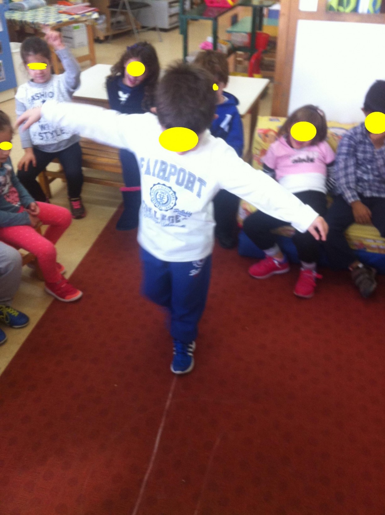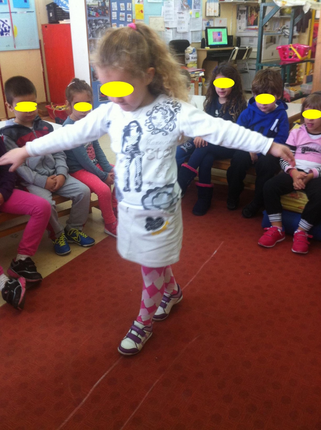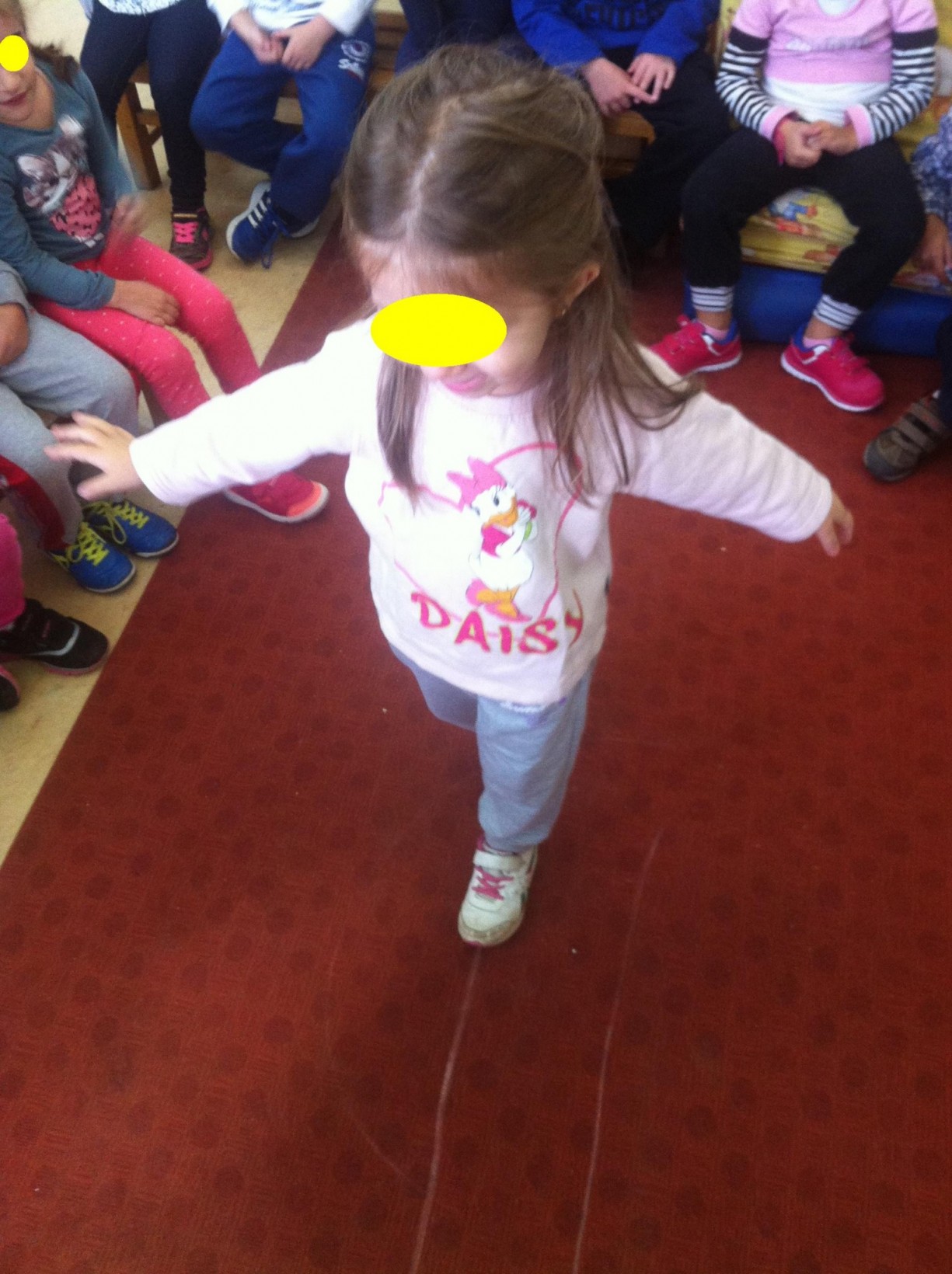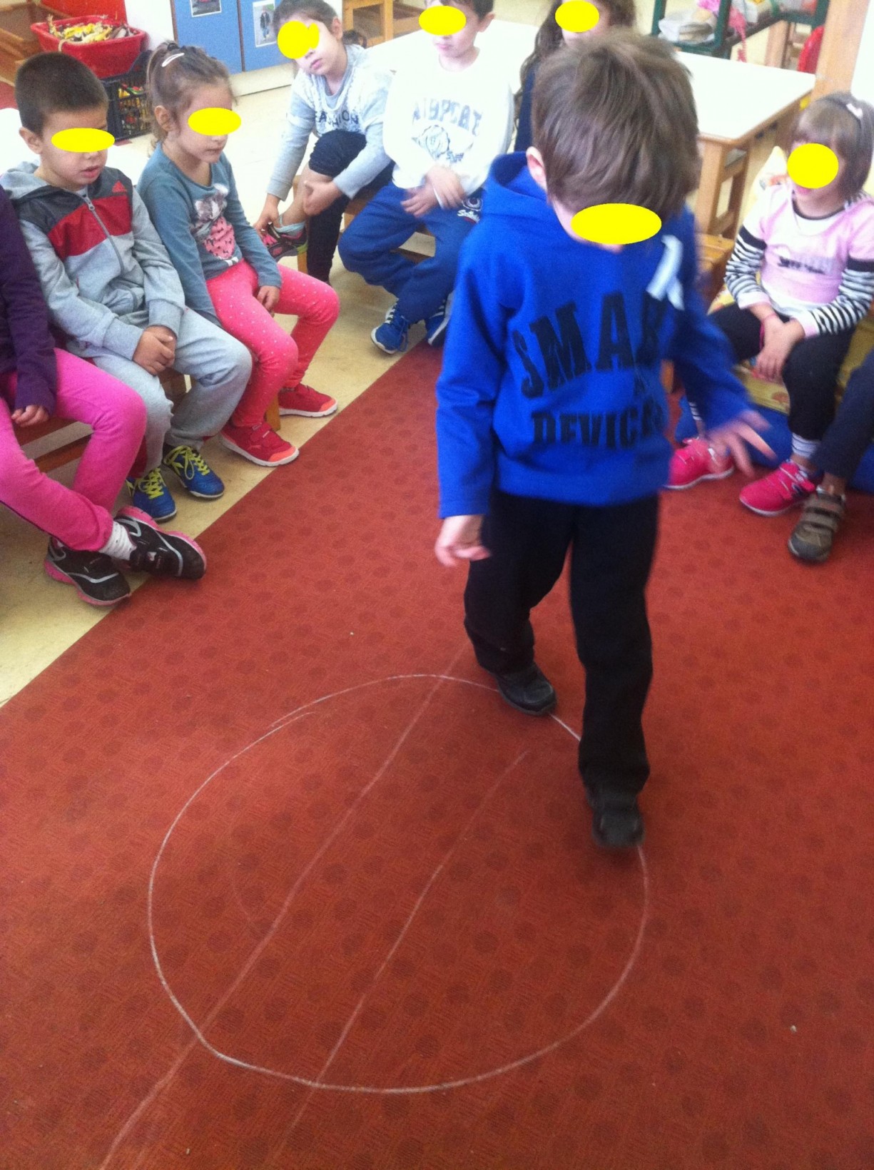 Μιλάμε για τα σχήματα και γινόμαστε σχοινοβάτες τσίρκου. Περπατάμε σε ευθεία γραμμή που έχουμε σχεδιάσει με κιμωλία στην μοκέτα μας. Βλέπουμε και σχεδιάζουμε κύκλους..Όταν ο κύκλος γίνεται στερεό λέγεται σφαίρα..Μιλάμε για αθλήματα που χρησιμοποιούν τη σφαίρα και θυμόμαστε το ποδόσφαιρο, το βόλεϋ, το τένις, το μπάσκετ, το μπόουλινγκ, το πόλο, το χάντμπολ.. Λέμε και τις Ελληνικές ονομασίες μερικών αθλημάτων από αυτά..(Χάντμπολ=χειροσφαίριση, μπάσκετ=καλαθοσφαίριση, βόλεϋ= πετοσφαίριση, ποδόσφαιρο..)