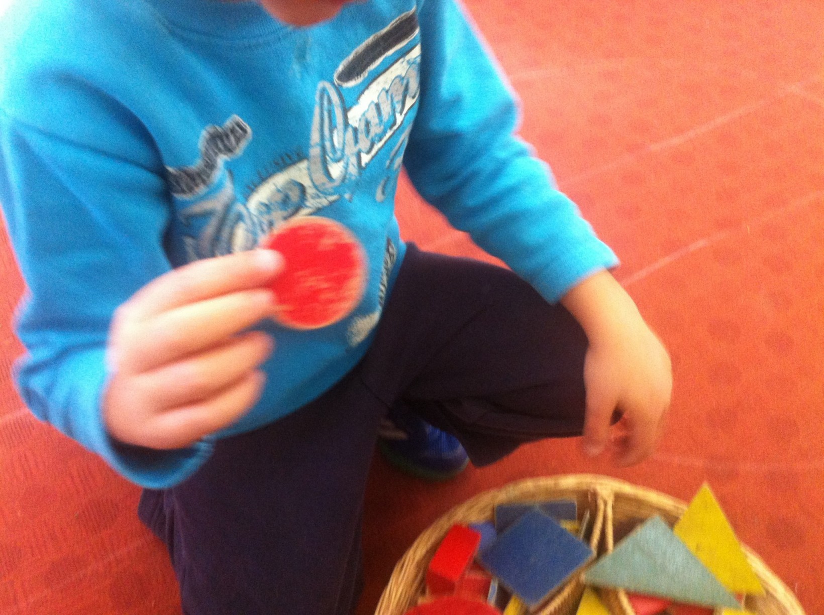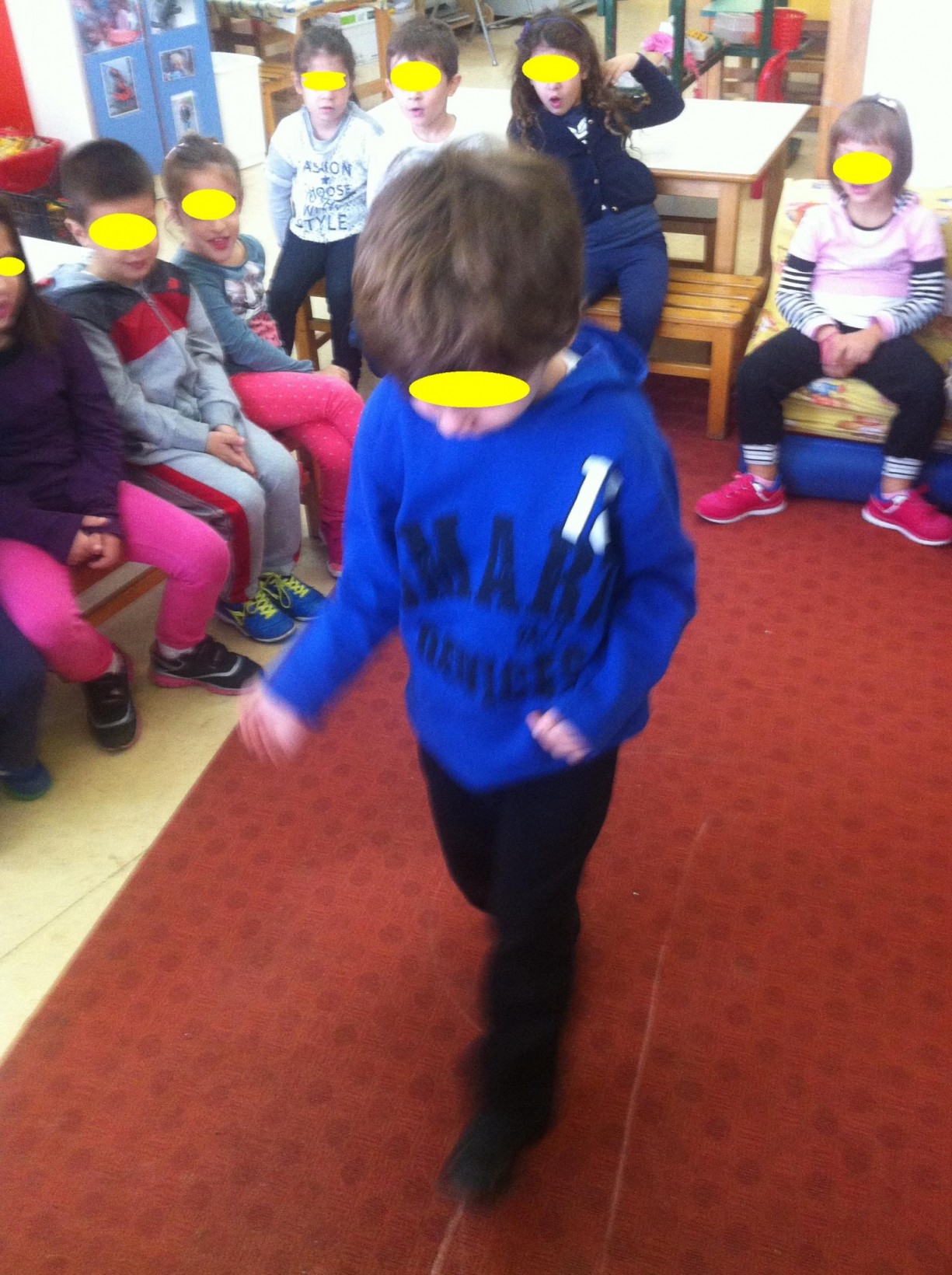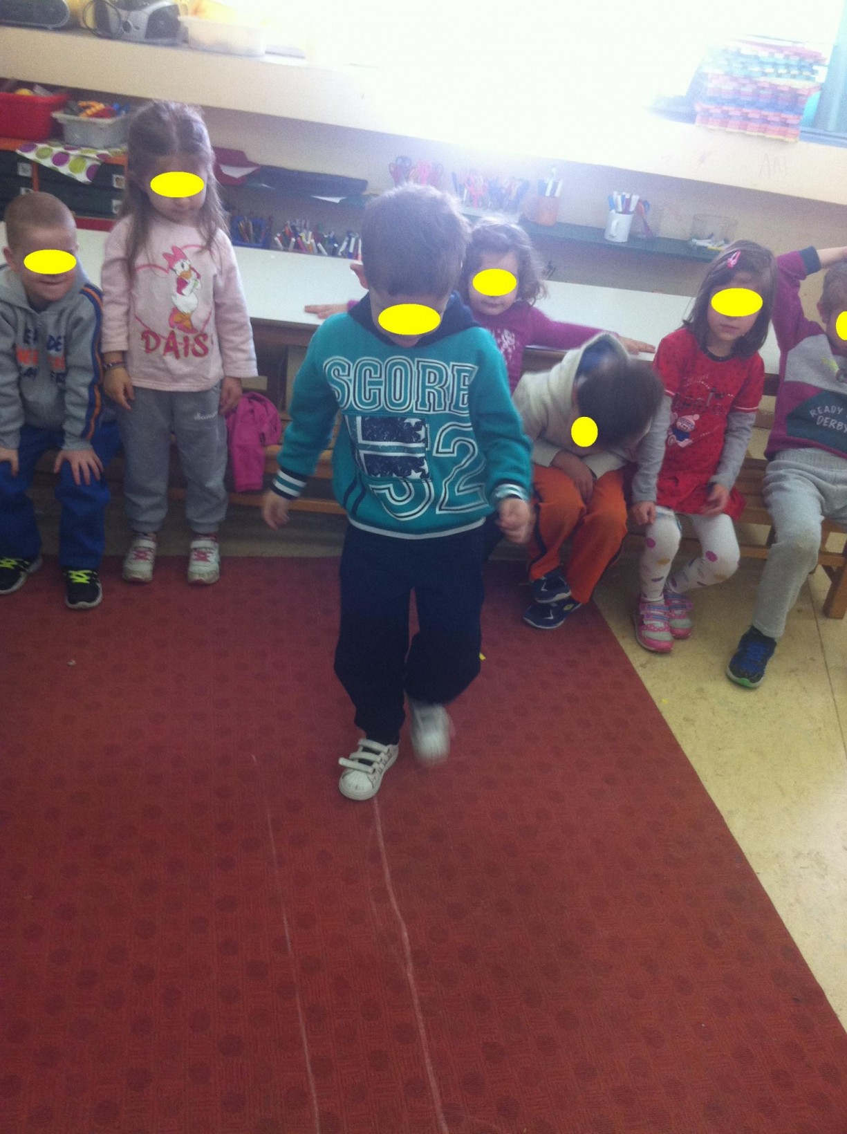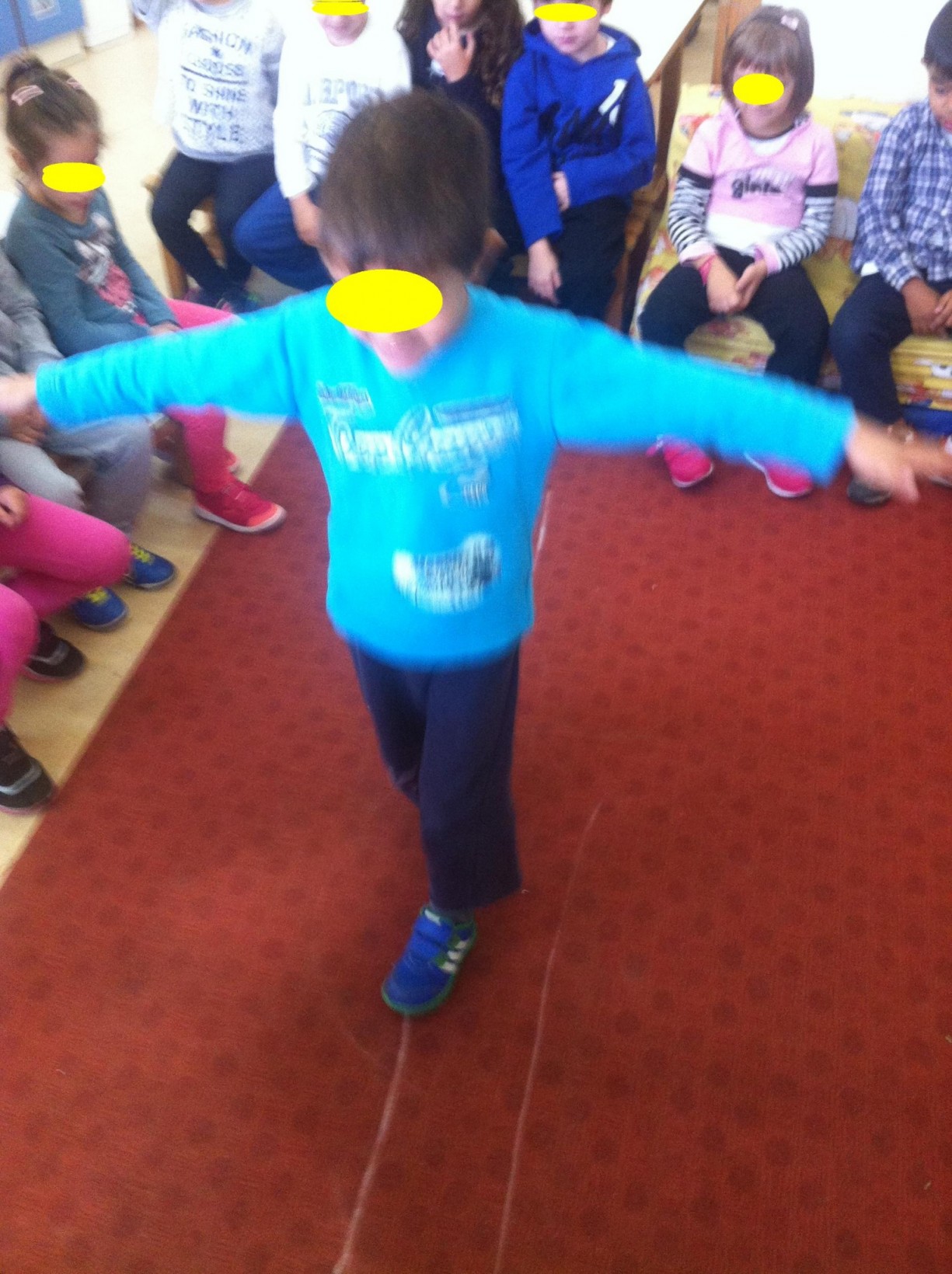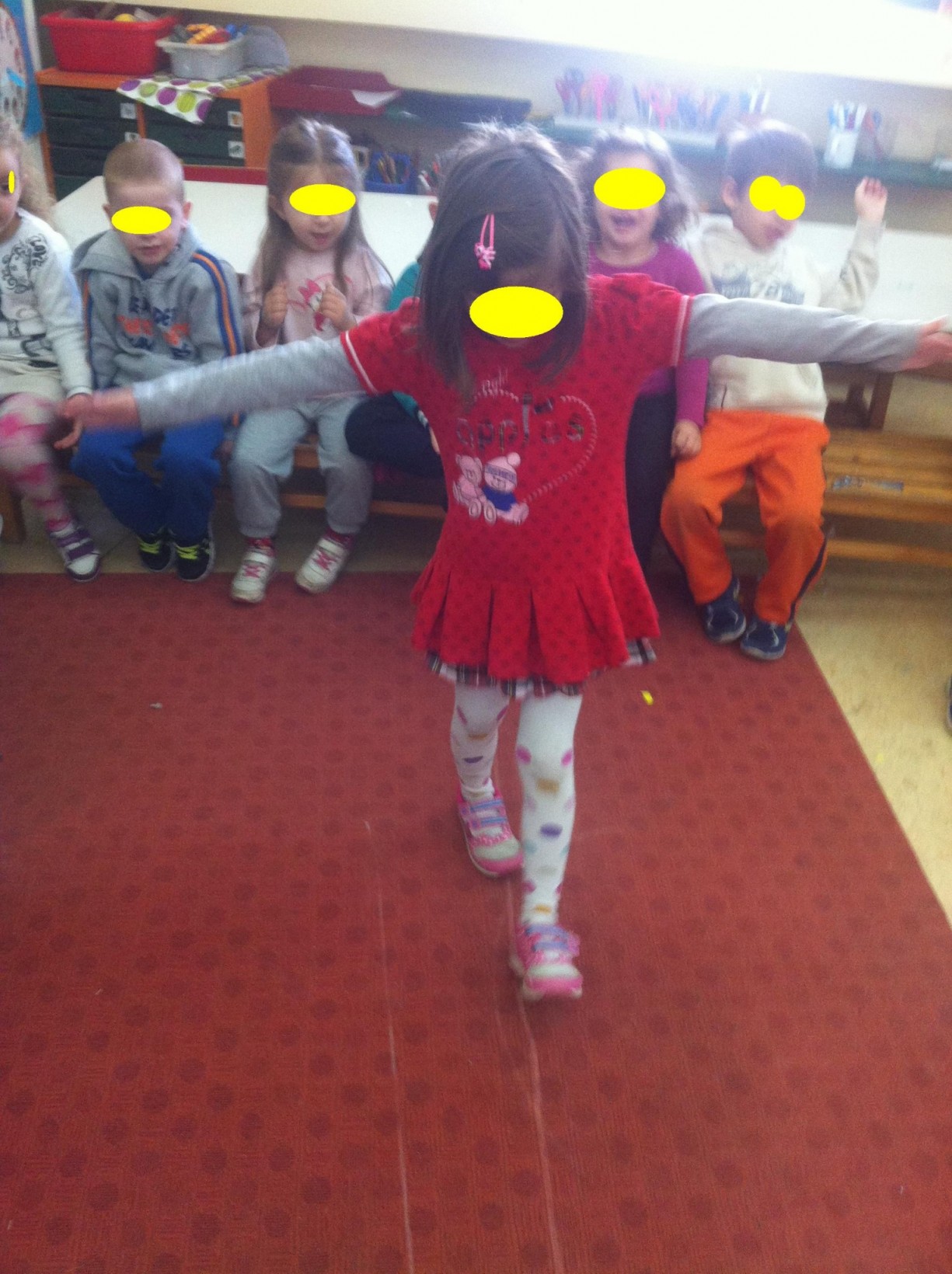 Μιλάμε για τα σχήματα και γινόμαστε σχοινοβάτες τσίρκου. Περπατάμε σε ευθεία γραμμή που έχουμε σχεδιάσει με κιμωλία στην μοκέτα μας. Βλέπουμε και σχεδιάζουμε κύκλους..Όταν ο κύκλος γίνεται στερεό λέγεται σφαίρα..Μιλάμε για αθλήματα που χρησιμοποιούν τη σφαίρα και θυμόμαστε το ποδόσφαιρο, το βόλεϋ, το τένις, το μπάσκετ, το μπόουλινγκ, το πόλο, το χάντμπολ.. Λέμε και τις Ελληνικές ονομασίες μερικών αθλημάτων από αυτά..(Χάντμπολ=χειροσφαίριση, μπάσκετ=καλαθοσφαίριση, βόλεϋ= πετοσφαίριση, ποδόσφαιρο..)