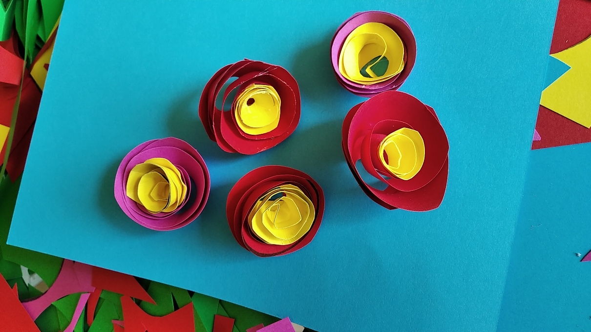 11. Κόβουμε μικρά κυκλάκια από κίτρινο χαρτί στο μέγεθος των 5 λεπτών και φυλλαράκια από χρωματιστό χαρτί. Αυτά θα είναι τα πέταλα των λουλουδιών μας.
