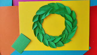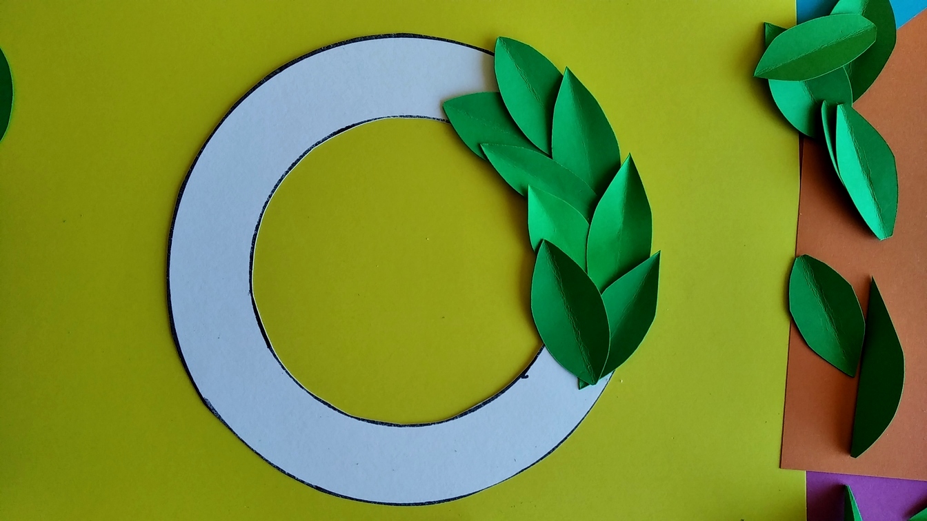9. Συνεχίζουμε να κολλάμε τα φύλλα προσέχοντας να σχηματίζουν έναν όμορφο, χοντρό, πράσινο κύκλο.
