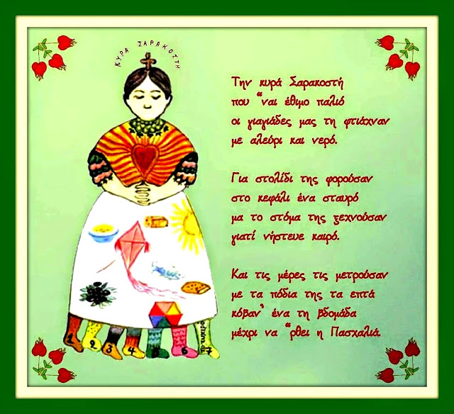 Τα παλιά χρόνια οι άνθρωποι είχαν ένα έθιμο, μια συνήθεια δηλαδή. Αμέσως μετά τις απόκριες έκαναν μια χάρτινη ζωγραφιά ή μια φιγούρα από ψημένο ζυμάρι, την Κυρά-Σαρακοστή. Ήταν μια γυναίκα με σταυρωμένα χέρια, γιατί προσευχόταν, χωρίς στόμα, γιατί έκανε νηστεία και με εφτά πόδια, ένα πόδι για κάθε μία από τις επτά εβδομάδες της Μεγάλης Σαρακοστής.