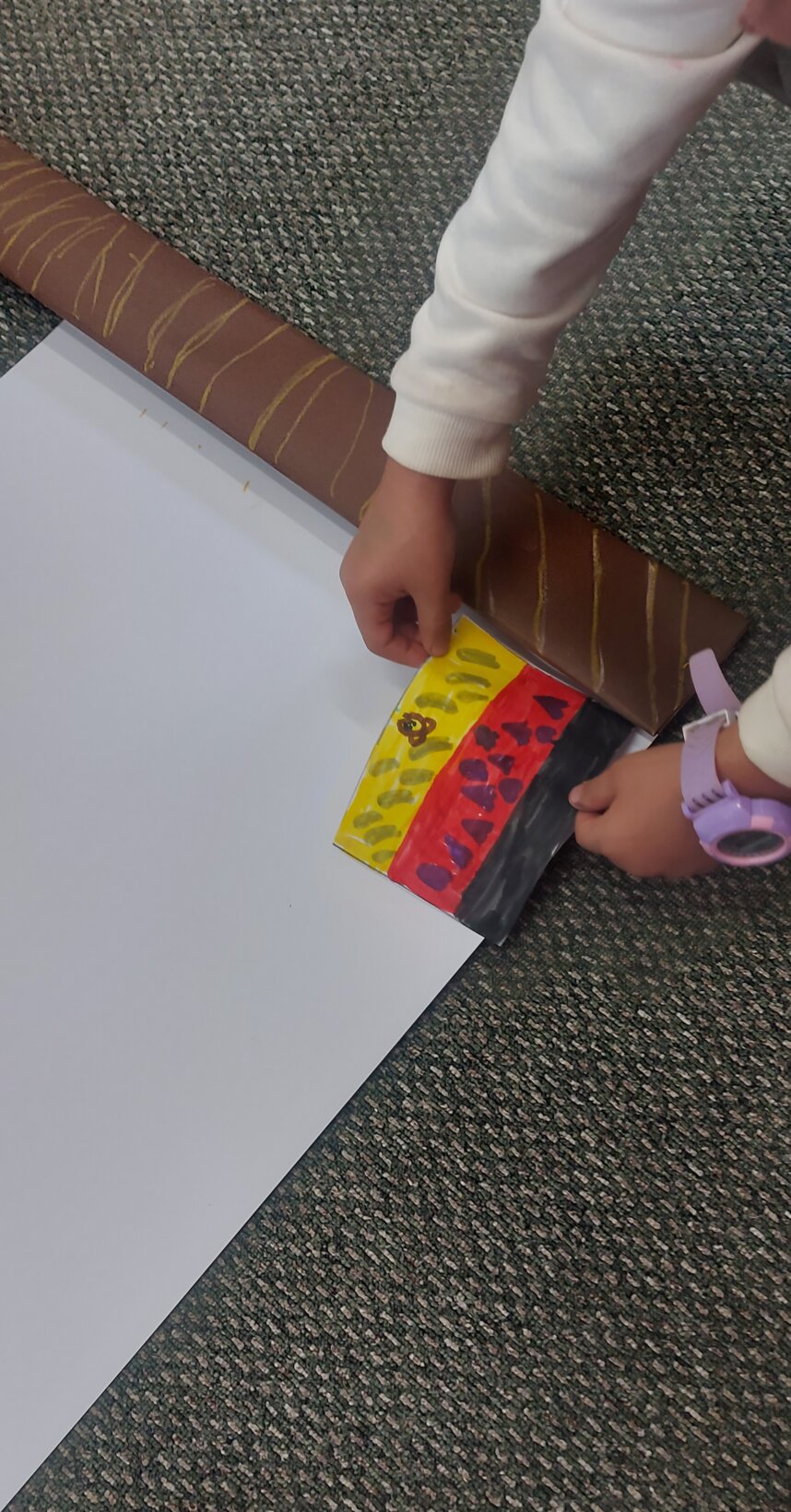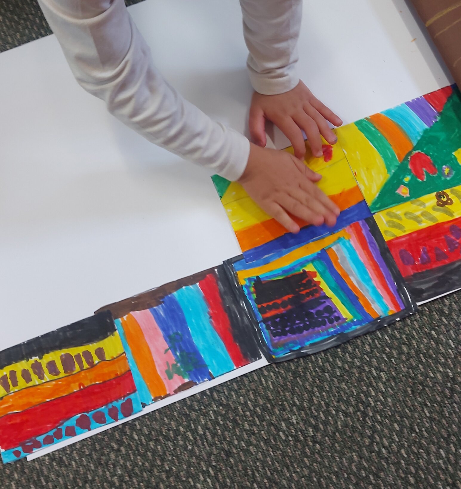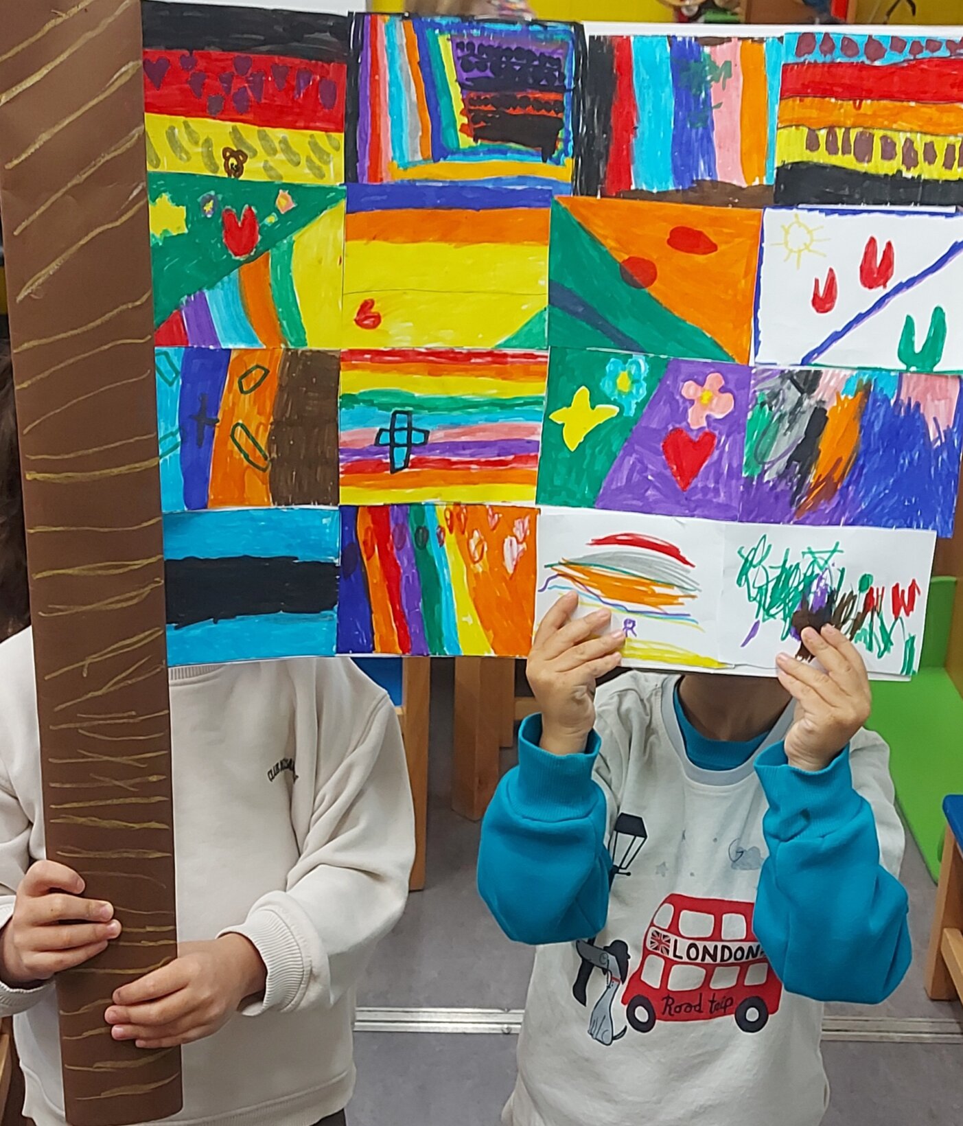 Στη συνέχεια αφού παρατηρήσαμε σημαίες από όλο τον κόσμο,αποφασίσαμε να δημιουργήσουμε την ξεχωριστή σημαία της τάξης μας. Μέσα από την τεχνική του καταιγισμού ιδεών το κάθε παιδί αποφάσισε να ζωγραφίσει όπως θέλει τη σημαία του και τέλος ενώσαμε όλες τις σημαίες μας φτιάχνοντας τη μοναδική σημαία της τάξης μας, που συμβολίζει την ενότητα της ομάδας μας.