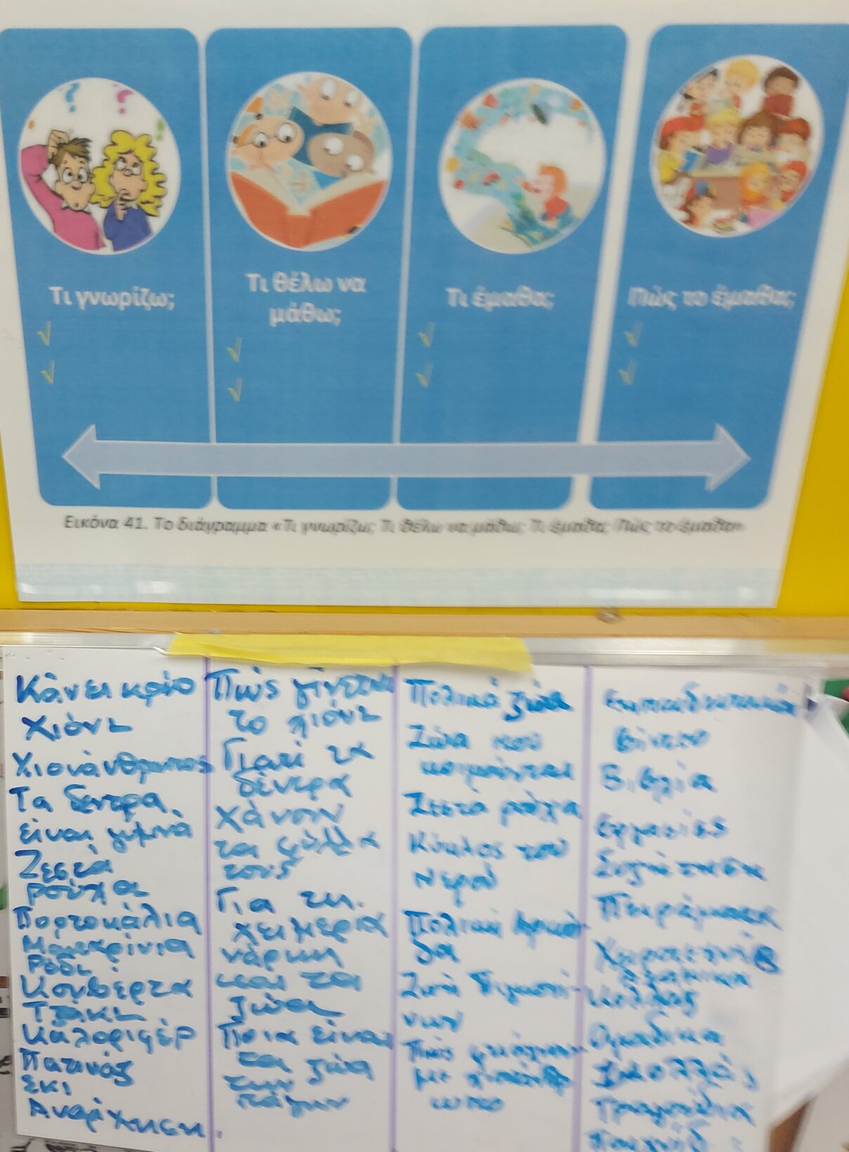 Ξεκινήσαμε διερευνώντας τις προυπάρχουσες γνώσεις των παιδιών για το χειμώνα συμπληρώνοντας σταδιακά το διάγραμμα K W L H(Τι ξέρω,τι θέλω να μάθω,τι έμαθα,πώς το έμαθα)