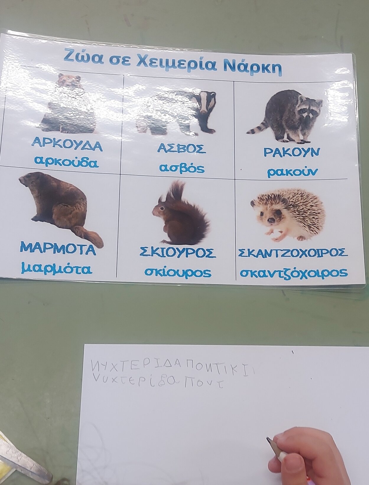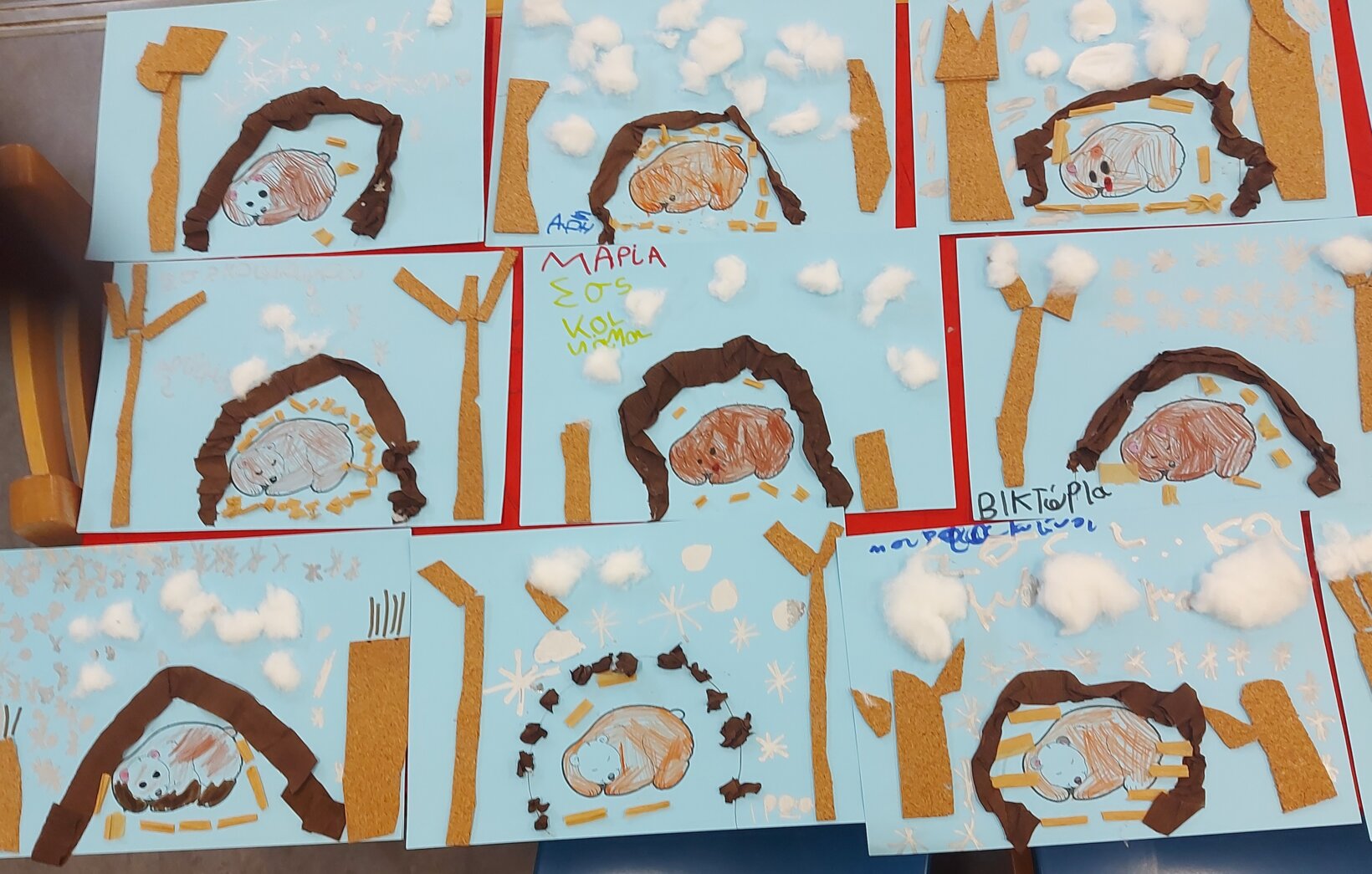 Μάθαμε για τα ζωάκια που πέφτουν σε χειμερία νάρκη μέσα από βίντεο ,εικόνες,και παιχνίδια που παίξαμε,Γράψαμε τα ονόματά τους και δημιουργήσαμε ατομικά την σπηλιά που κοιμάται η καφέ αρκουδίτσα με απλά υλικά (φελλό,γκοφρέ, βαμβάκι,μαρκαδόρους)