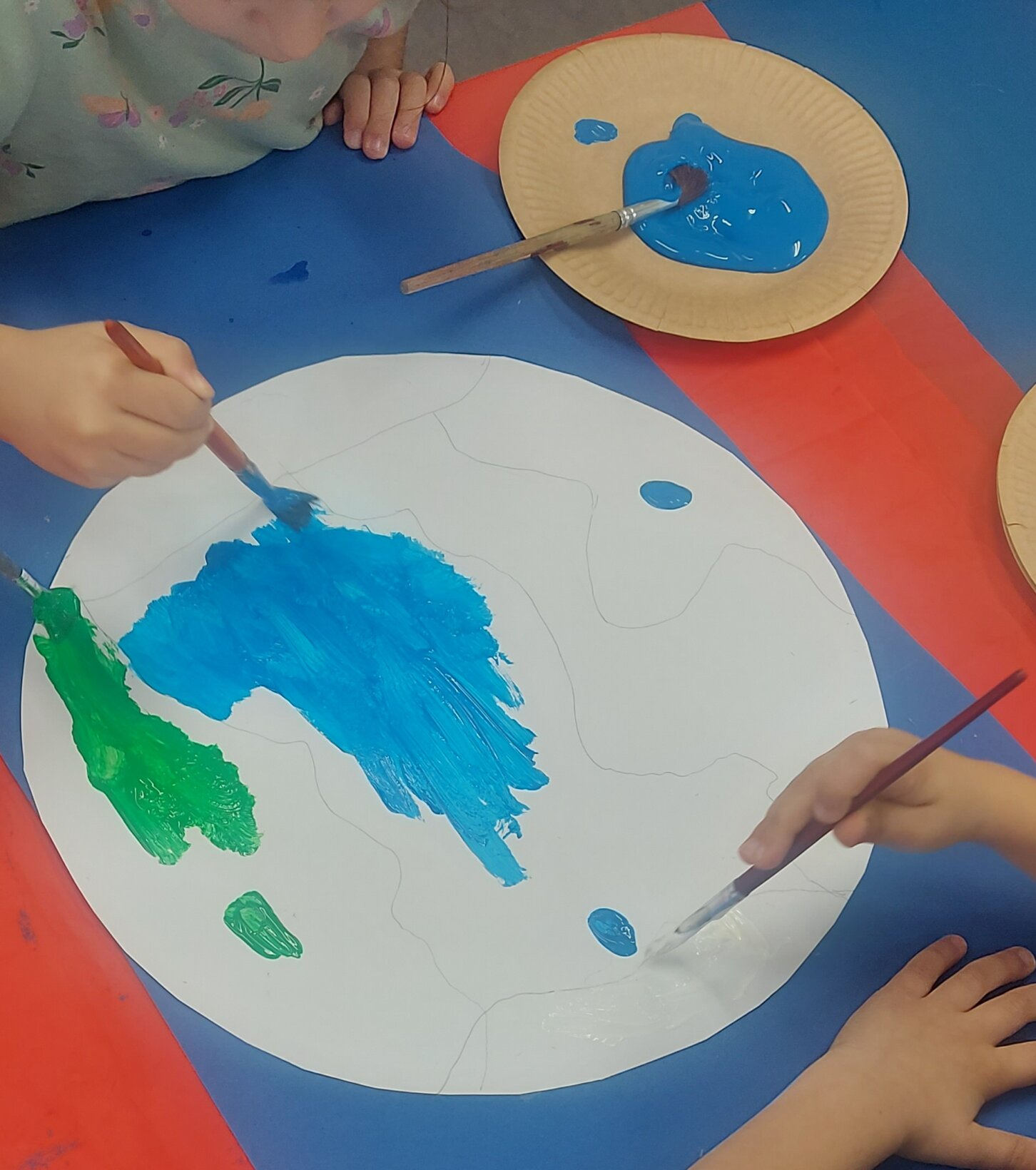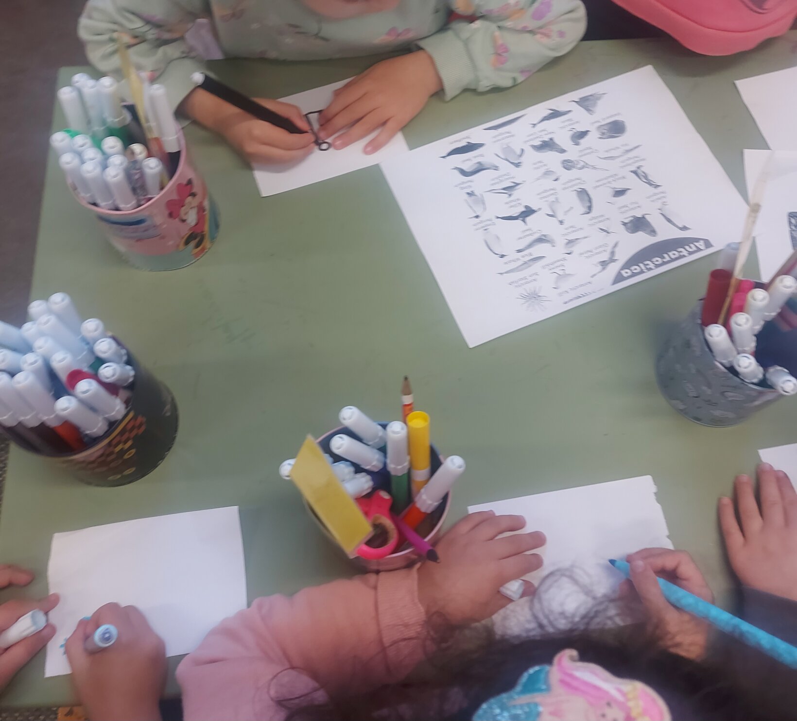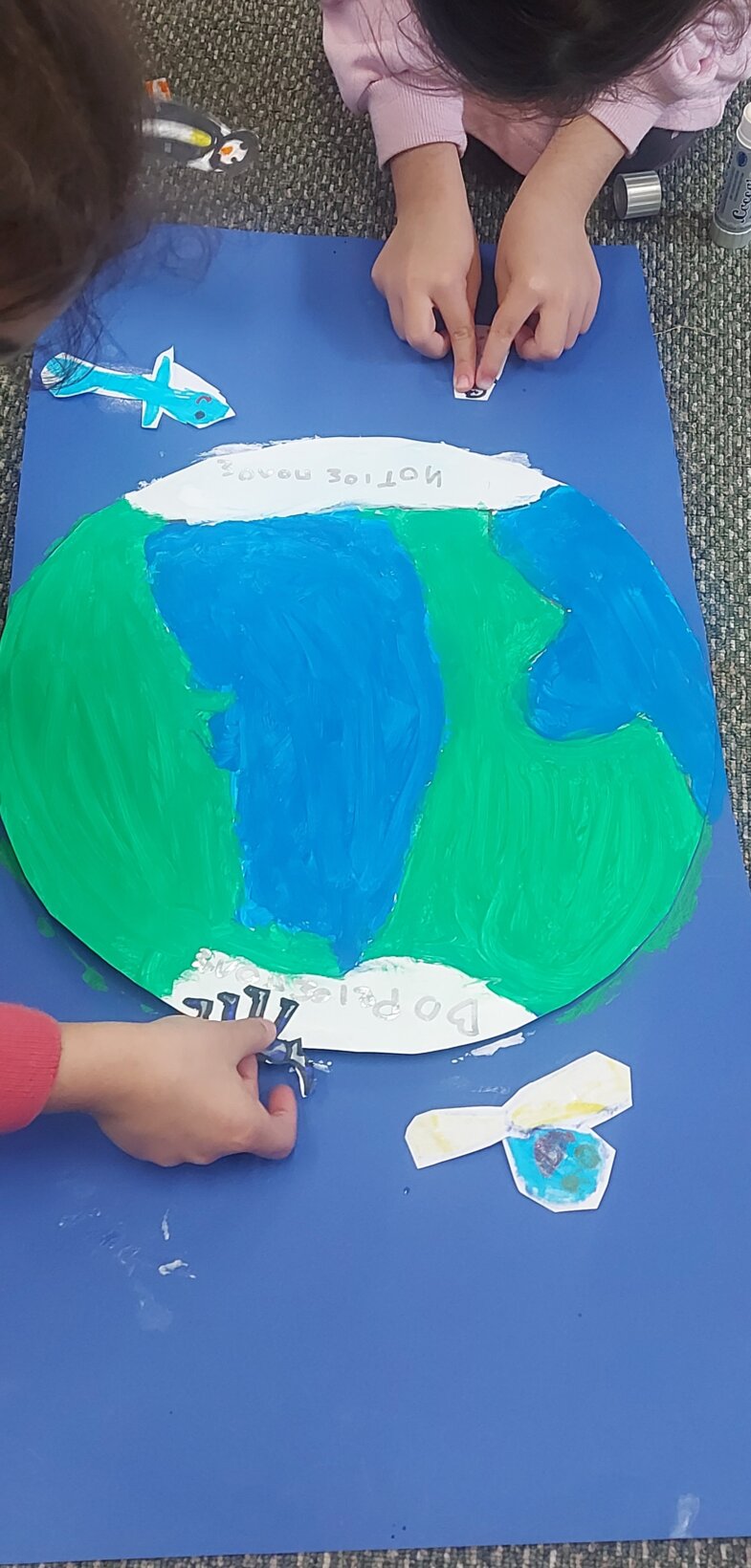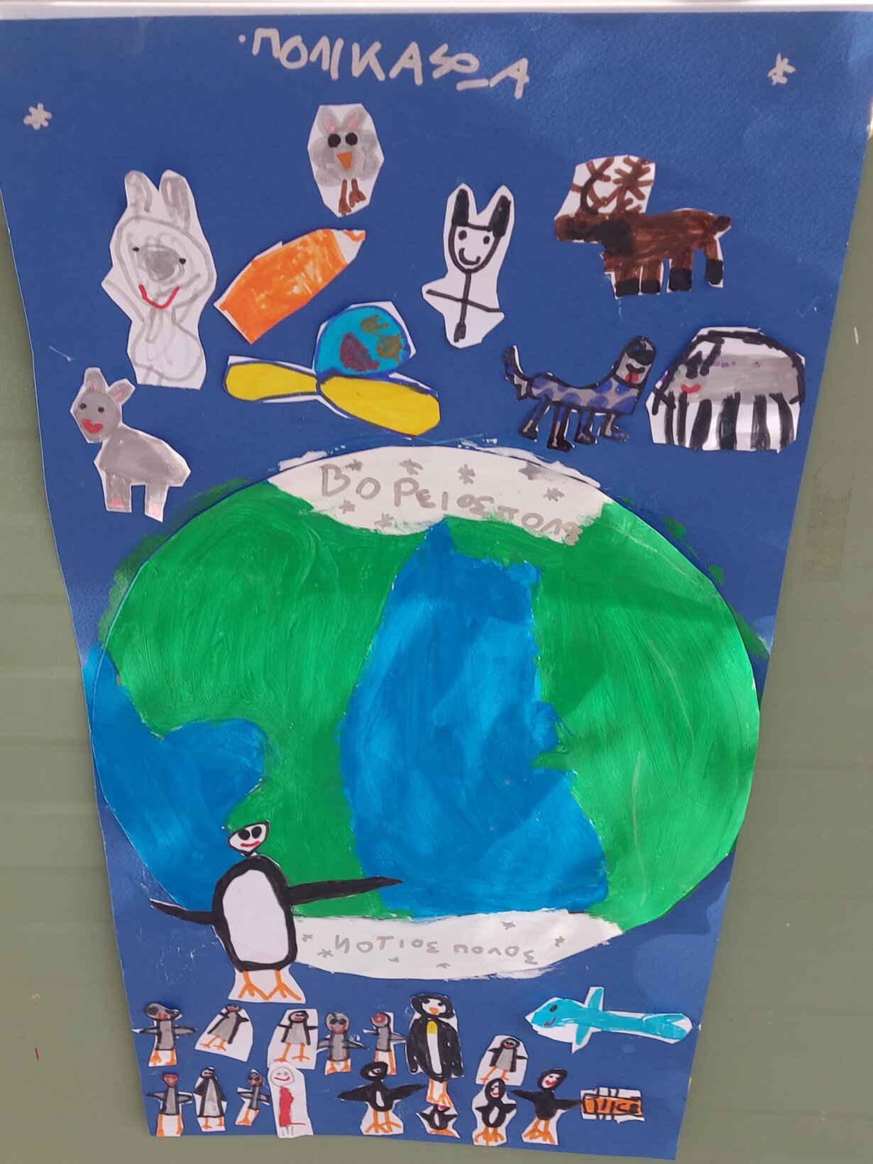 Στη συνέχεια συνεργαστήκαμε και φτιάξαμε ομαδική εργασία με τίτλο: ¨ΠΟΛΙΚΑ ΖΩΑ” Χωριστήκαμε σε δύο ομάδες .Η μία ομάδα ζωγράφισε ζώα που ζουν στο Βόρειο Πόλο και η άλλη ζώα που ζούν στο Νότιο Πόλο .Ζωγραφίσαμε τον πλανήτη μας τη Γη,ξεχωρίσαμε τους δύο πόλους της και η κάθε ομάδα κόλλησε τα ζώα της στο αντίστοιχο μέρος που ζουν. Πολικές αρκούδες,αρκτικοί λάγοί,αρτική αλεπού,χάσκι,φάλαινες και πιγκουίνοι βρήκαν τον τόπο κατοικίας τους.