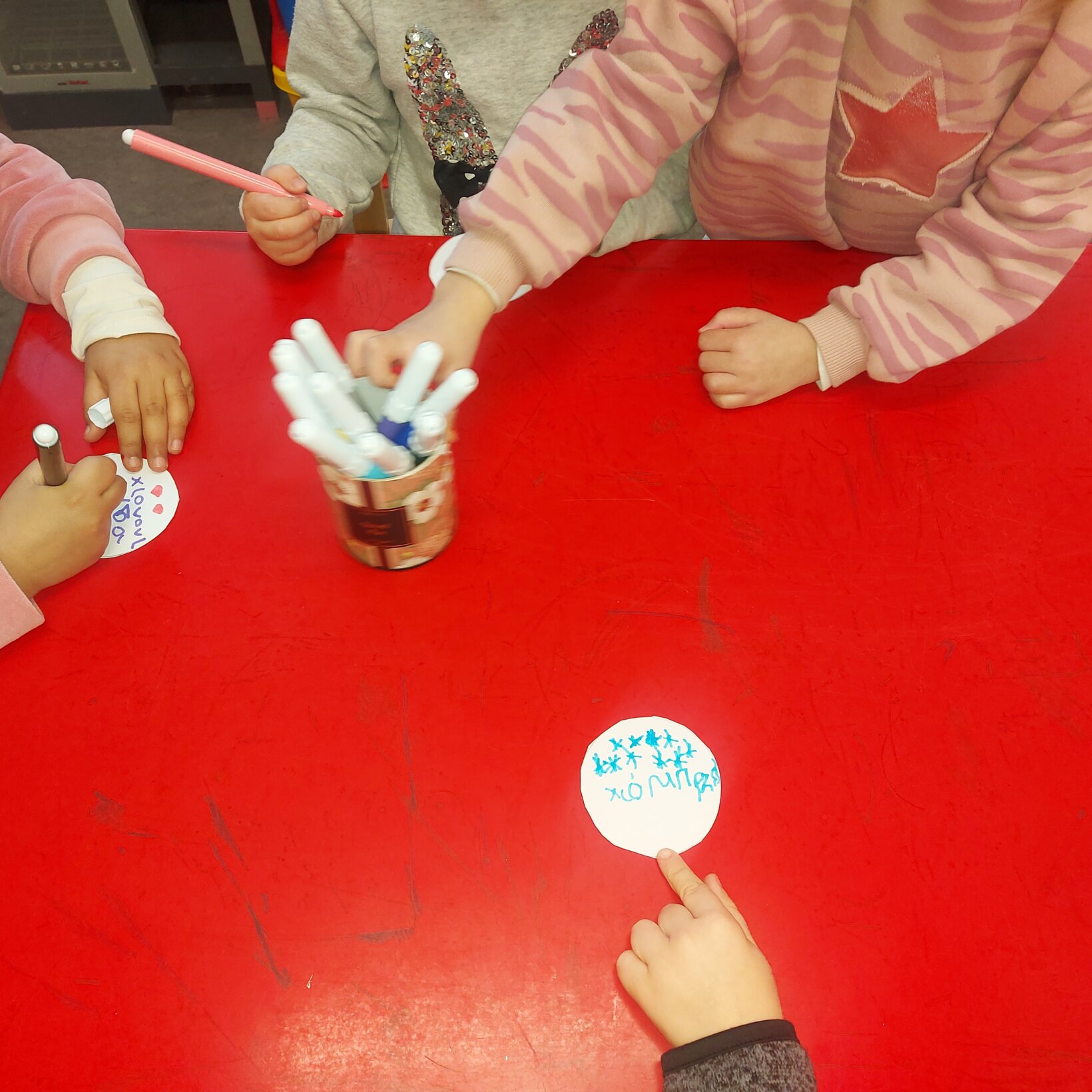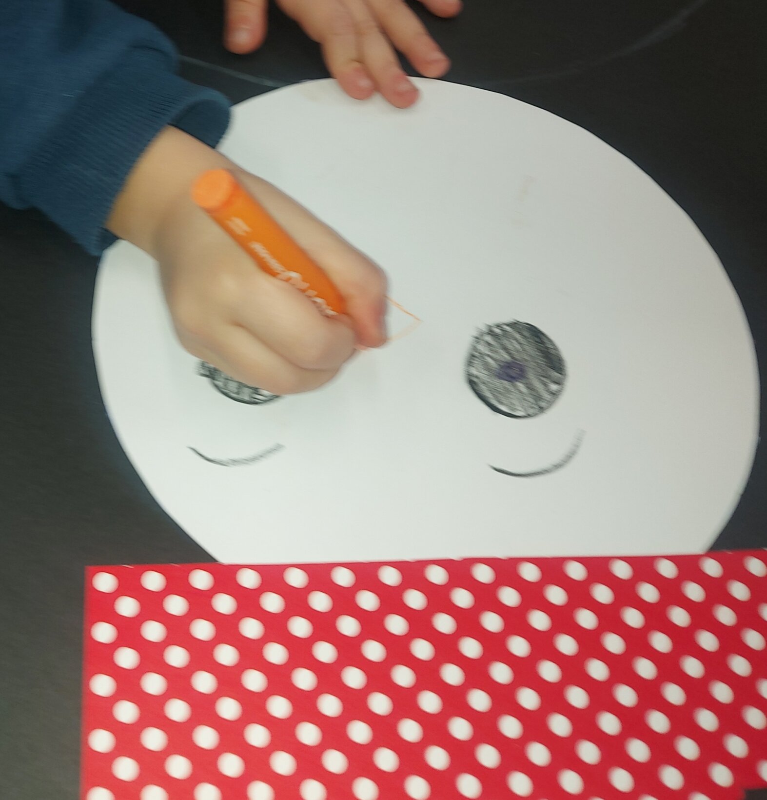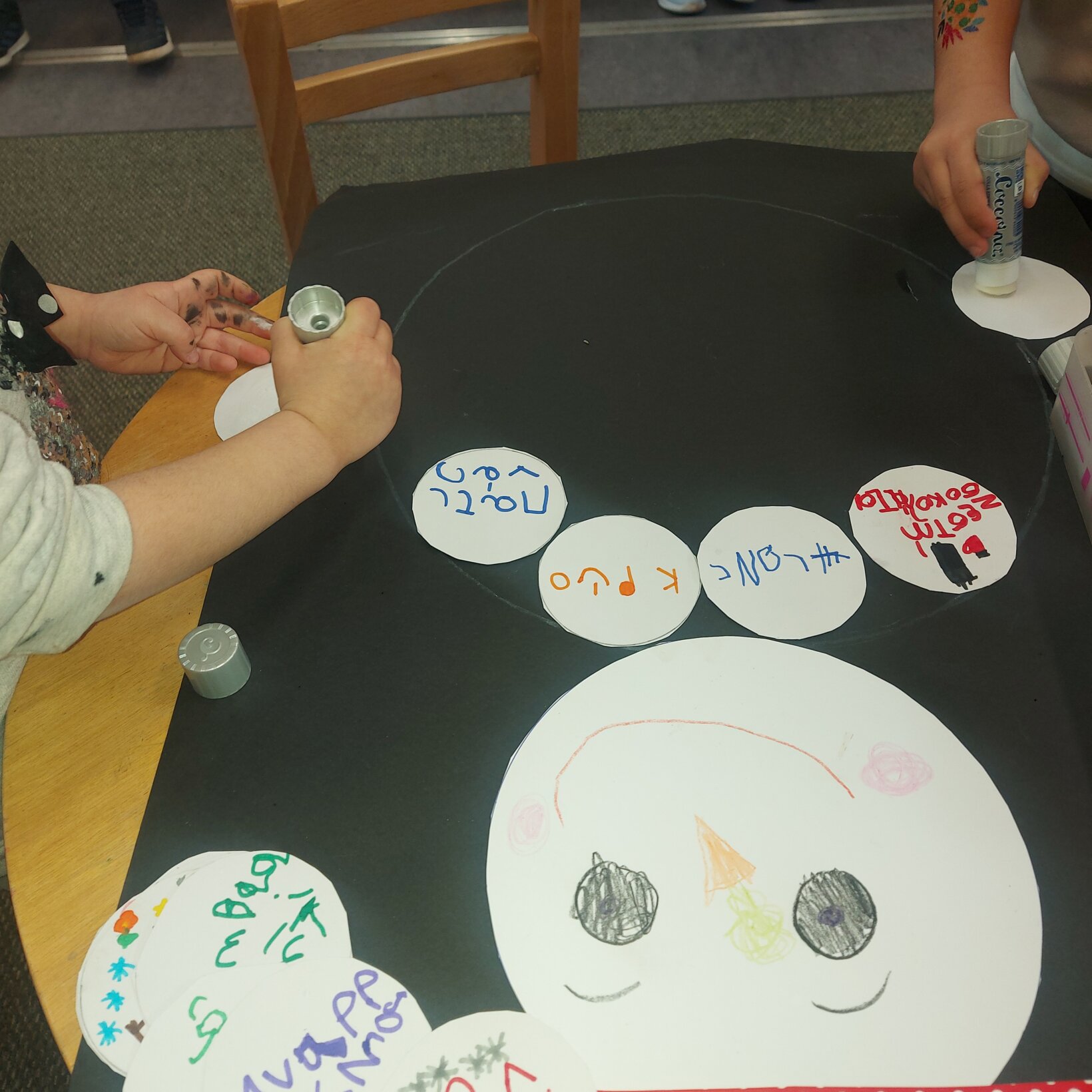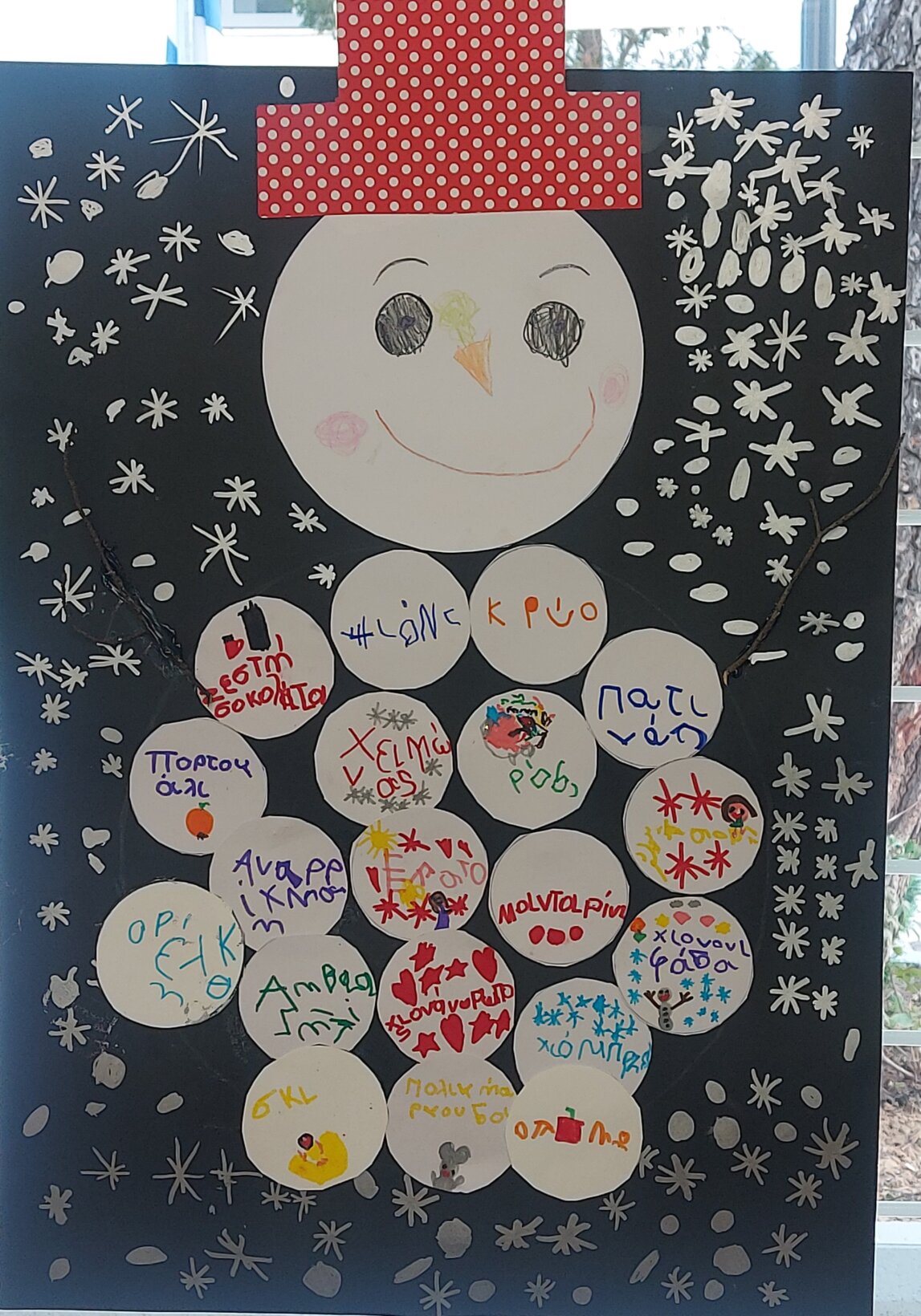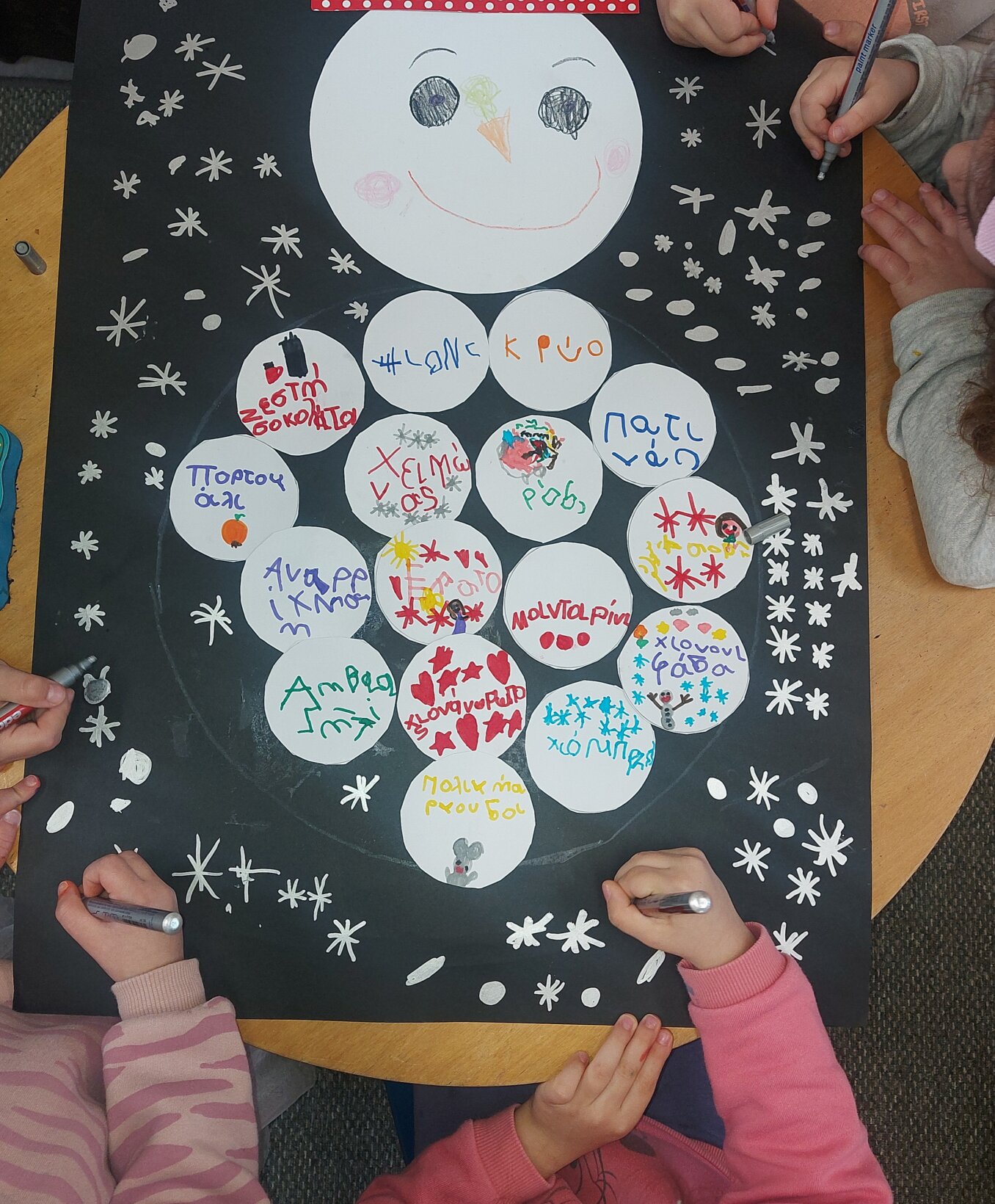 Αποφασίσαμε να συνεργαστούμε και να δημιουργήσουμε το Χιονάνθρωπο της τάξης μας με σώμα από χιονονιφάδες χειμωνιάτικων λέξεων