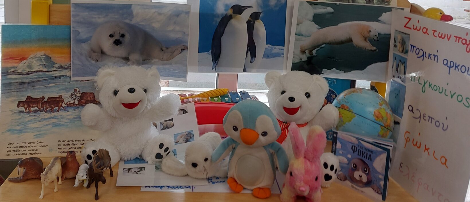 Υπήρξε μεγάλο ενδιαφέρον από τα περισσότερα παιδιά για τα Ζώα των Πάγων.Μάθαμε μέσα από εκπαιδευτικά βίντεο για το Βόρειο και το Νότιο Πόλο ,τα ζώα που ζουν εκεί και τους κατοίκους τους, Συγκεντρώσαμε υλικό (εικόνες,παραμύθια,ζωάκια πλαστικά και χνουδωτά, υδρόγειος σφαίρα)και δημιουργήσαμε τη γωνιά των πάγων.