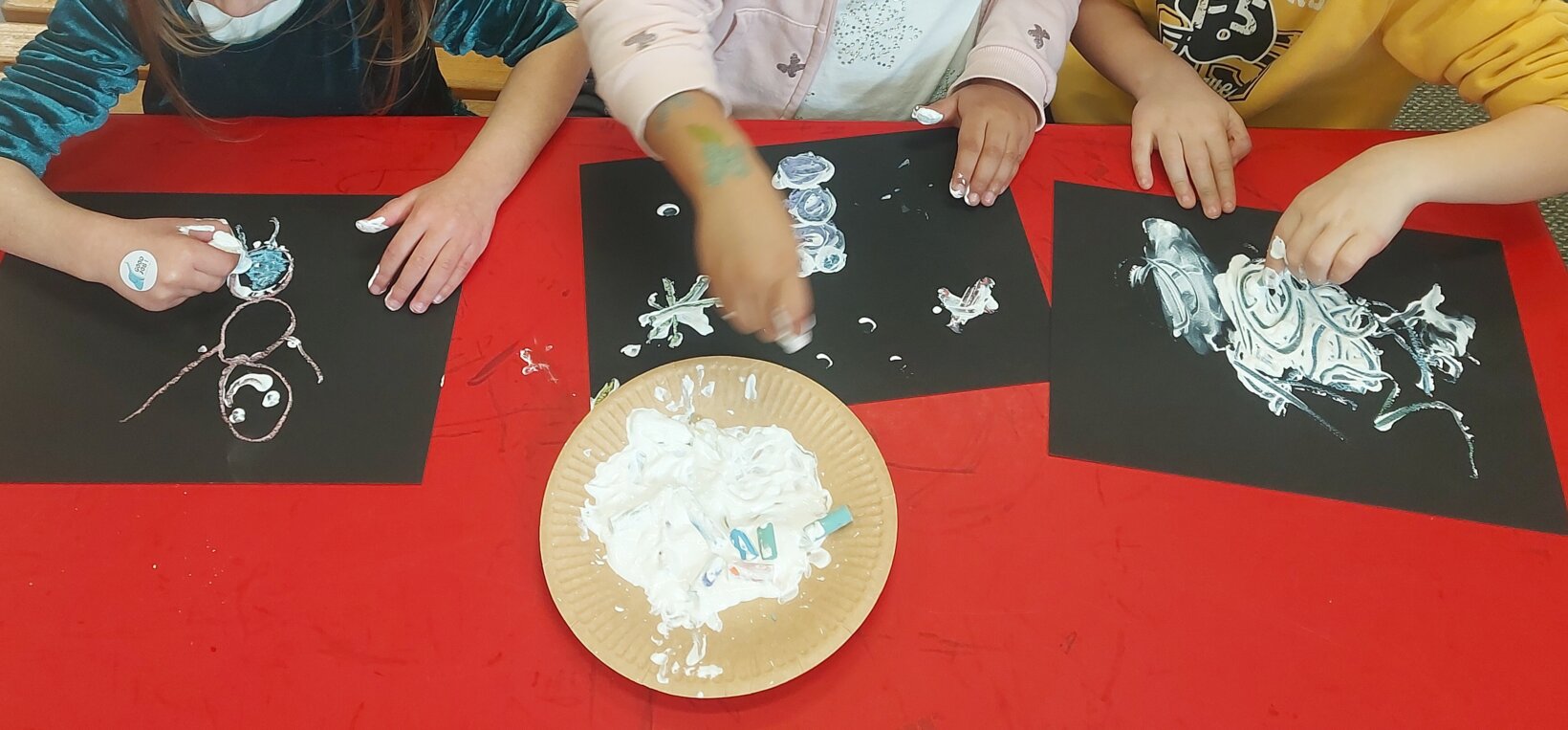 Φιάξαμε τα χειμωνιάτικα τοπία μας με χρωματιστές κιμωλίες ανακατεμένες με λευκή μπογιά,Το κάθε παιδί δημιούργησε το δικό του μοναδικό τοπίο (χιονάνθρωποι,χιονοθύελλα,χιονισμένα σπίτια)