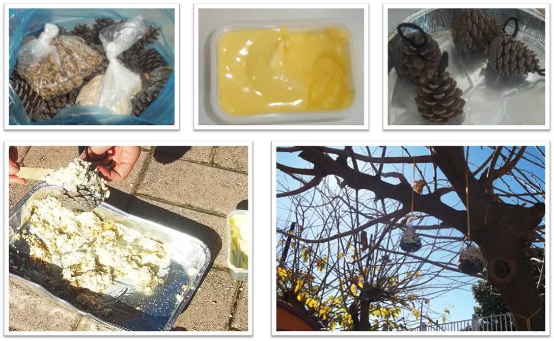 Για τα κουκουνάρια κάναμε κάτι άλλο. Φέραμε φυτικό βούτυρο από το σπίτι και αφού το αφήσαμε έξω από το ψυγείο για να μαλακώσει, το ανακατέψαμε με σποράκια και δημητριακά, αλείψαμε με αυτό τα κουκουνάρια και τα κρεμάσαμε στις μουριές της αυλή μας.