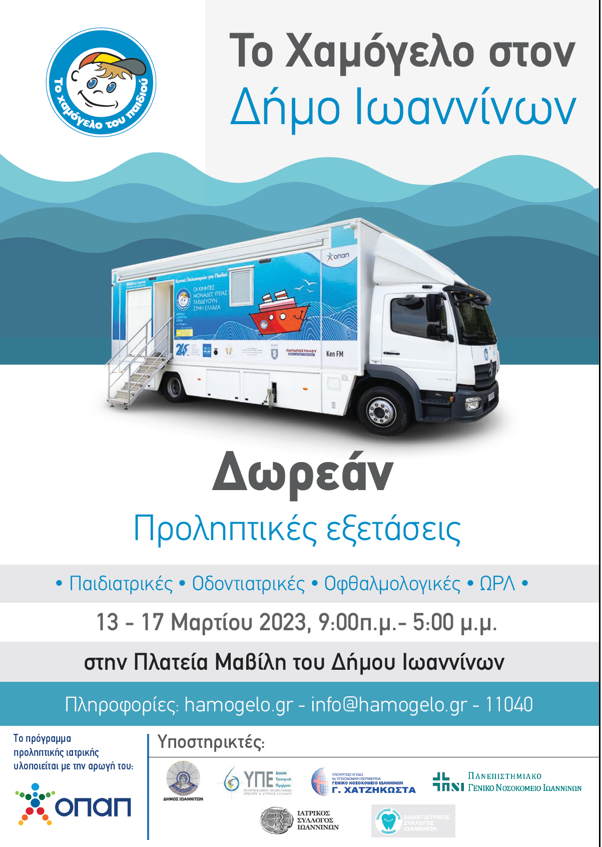 Δωρεάν Προληπτικές Οδοντιατρικές/Παιδιατρικές/Οφθαλμολογικές/ΩΡΛ Εξετάσεις για Παιδιά από «Το Χαμόγελο του Παιδιού» στον Δήμο Ιωαννιτών, 13-17 Μαρτίου 2023.