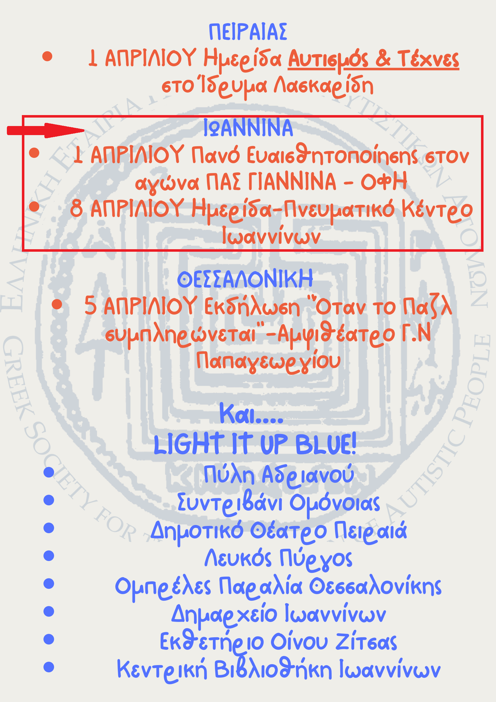 Στα πλαίσια της Παγκόσμιας Ημέρας Ενημέρωσης και Ευαισθητοποίησης για τον Αυτισμό, θα πραγματοποιηθεί πασχαλινή εορταγορά την Κυριακή 2 Απριλίου στις 17:00 στο πεζόδρομο μπροστά από το Δημαρχείο του Δήμου Ιωαννιτών.