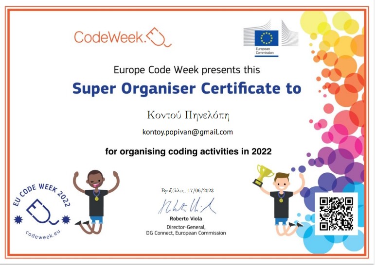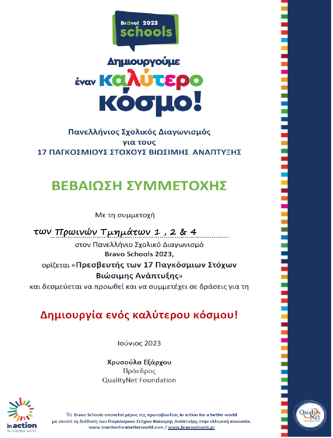 Ακολουθούν η βεβαίωση συμμετοχής στο Bravo Schools 2023, το logo του Πρεσβευτή των 17 Παγκόσμιων Στόχων που μπορούν να κατέχουν οι μαθητές/τριες που συμμετείχαν & ο έπαινος του σχολείου.