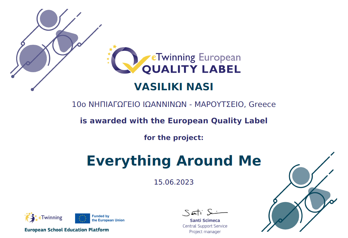 Congratulations! Your school has been awarded the European Quality Label for the work in the eTwinning project “Everything Around Me“. This means that your work, the work of your students and the collaboration with your partners met the Quality Label Framework criteria and received a high score.