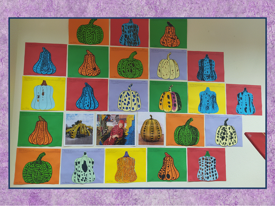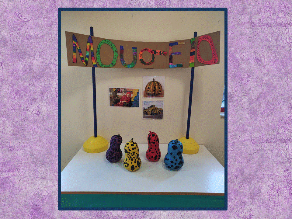 Τα παιδιά πρότειναν να δημιουργήσουμε ένα μουσείο με πραγματικές κολοκύθες διακοσμημένες με κύκλους-τελείες, όπως η Γιογιόι Κουσάμα. Εργαστήκαμε σε 4 ομάδες και η κάθε ομάδα ετοίμασε τη δική της κολοκύθα!!!