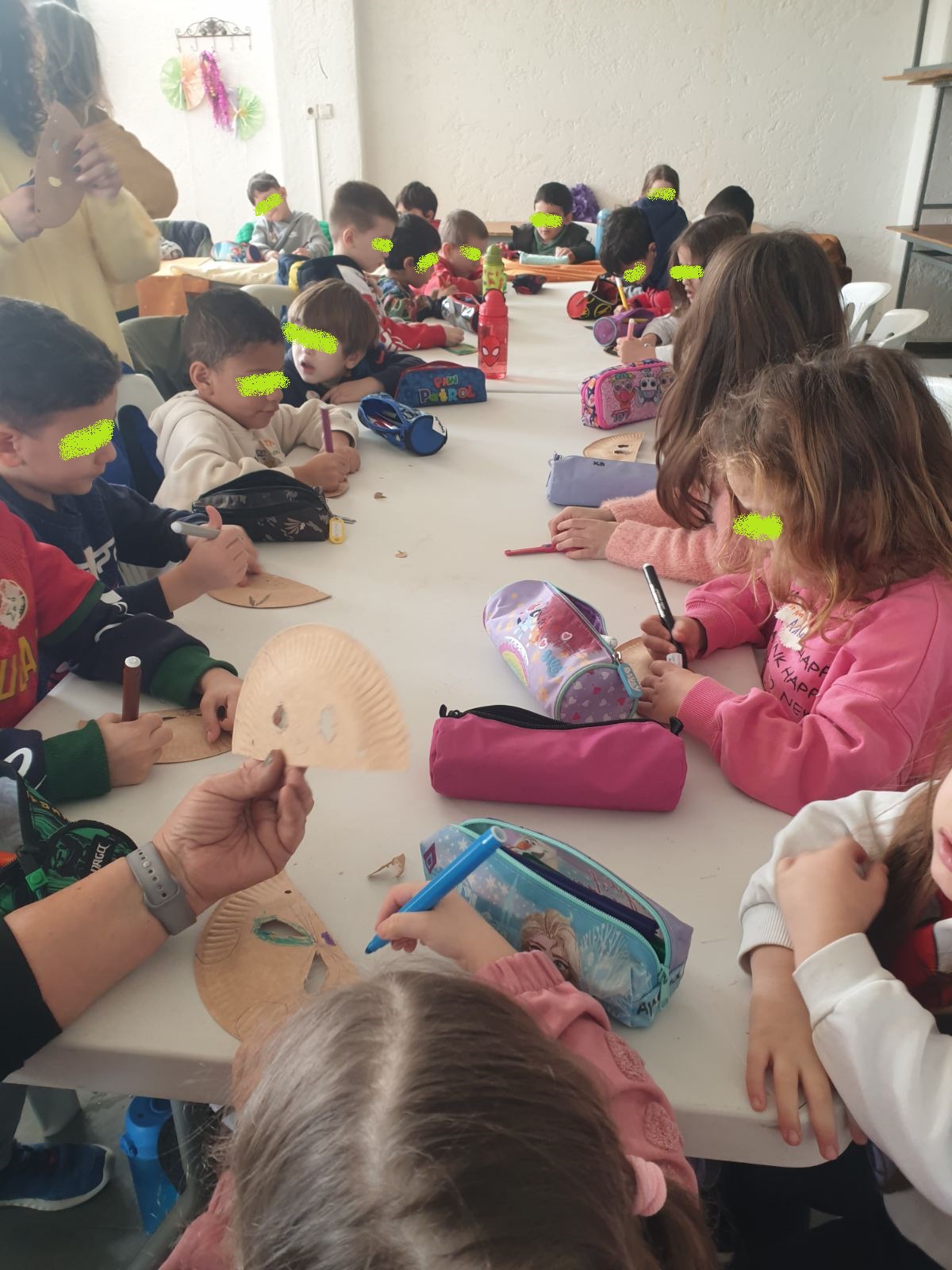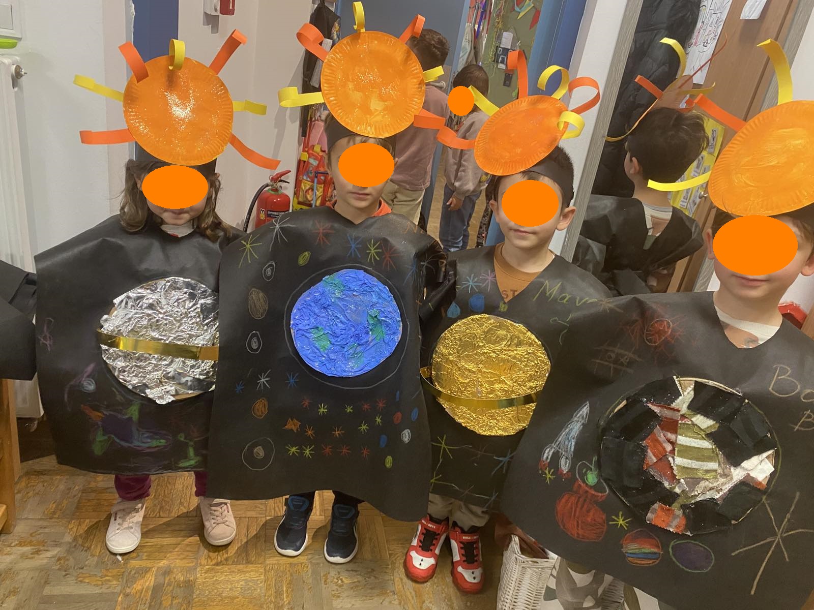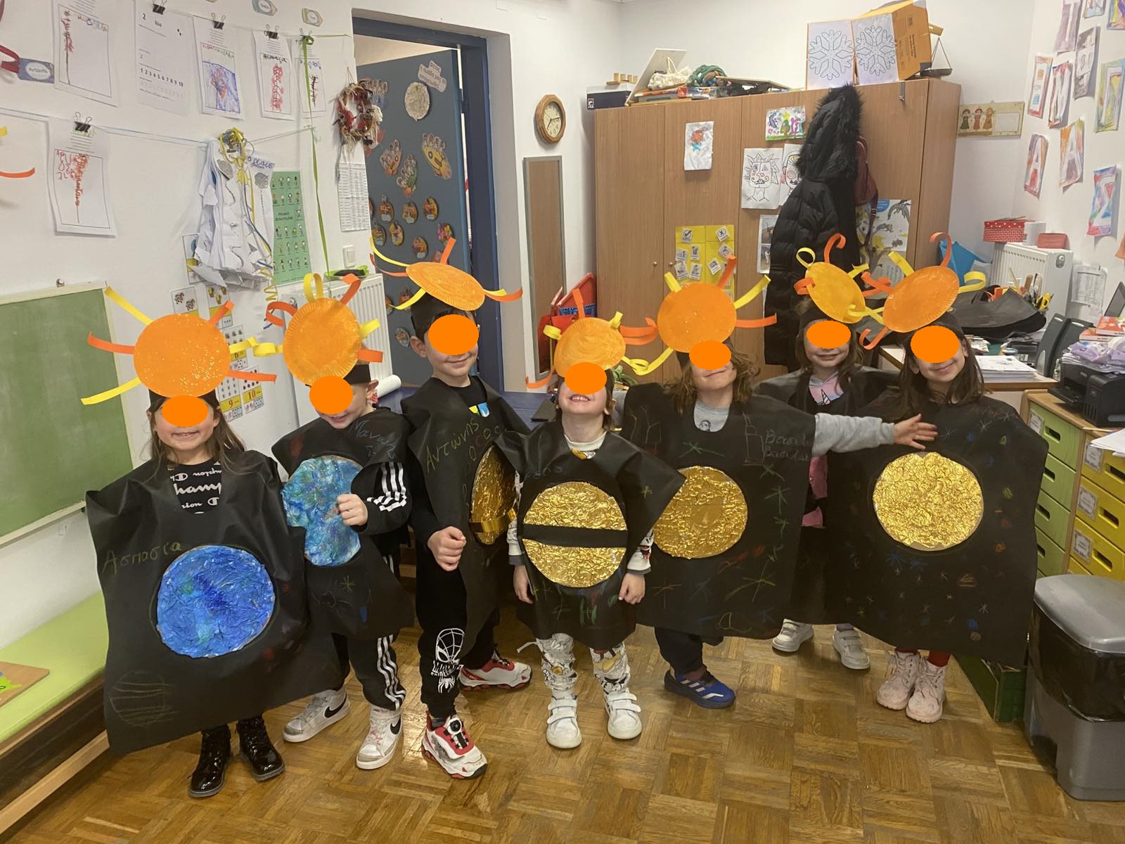 Τον καλωσορίσαμε με γιορτινή διάθεση, μιας και τιμούμε το Τριώδιο μέχρι να έρθουν οι Απόκριες ! Αφού συζητήσαμε και μάθαμε για τα ήθη και τα έθιμα των Αποκριών, ξεκινήσαμε να φτιάχνουμε κατασκευές με διαφορετικές τεχνικές, κάτι που μας ενθουσίασε! Μάσκες με φυσικά υλικά, χρώματα, ζωγραφική με κάρβουνο, στολές με πλανήτες από χαρτόπανο, χαρτοπολτό και υφάσματα, γιγάντιες αφίσες με τον Αρλεκίνο και τον Κλόουν!