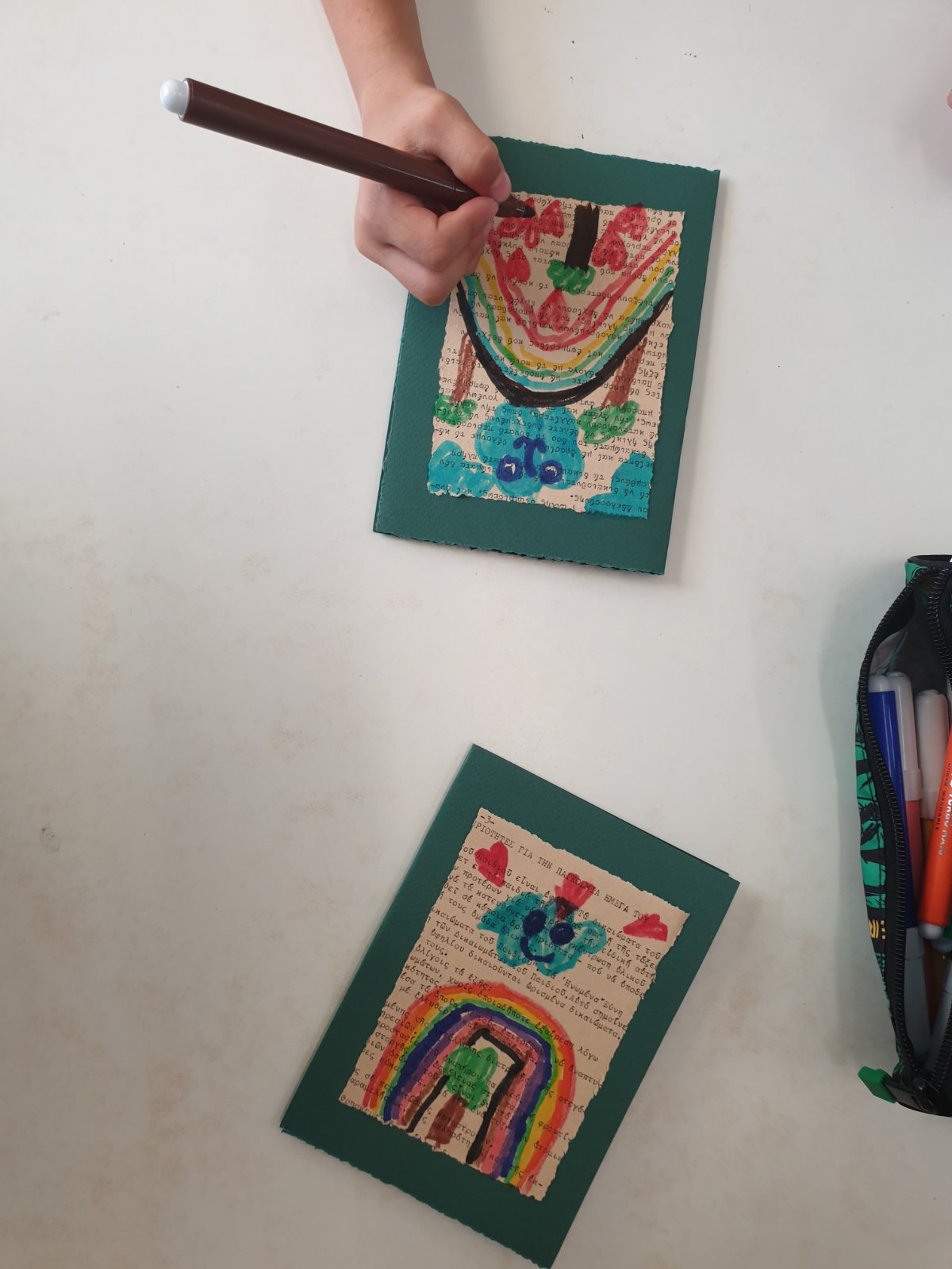 Ένας τελευταίος σταθμός ήταν ο κόσμος του landart , ένας χώρος στην αυλή μας που μετατράπηκε σε ένα φυσικό καλλιτεχνικό εργαστήρι. Εκεί χρησιμοποιήσαμε φυσικά υλικά όπως πέτρες, φύλλα, κλαδιά και δημιουργήσαμε μοναδικές εικαστικές συνθέσεις πάνω στον “καμβά του χορταριού”. Ένας σταθμός έμπνευσης και φαντασίας γεμάτος αγπάπη για το φυσικό περιβάλλον.