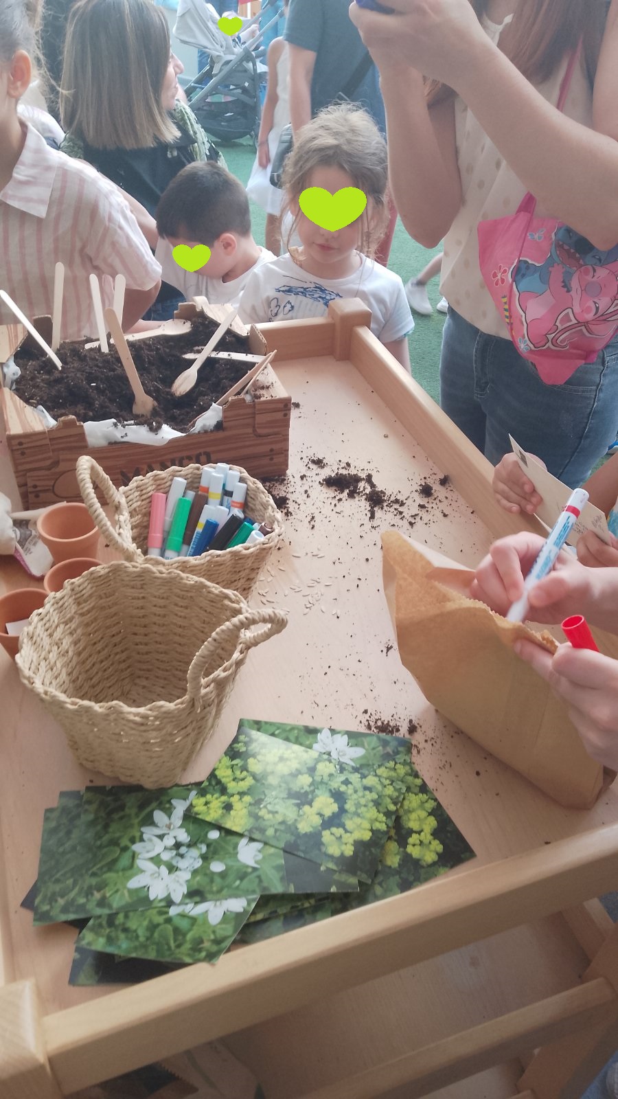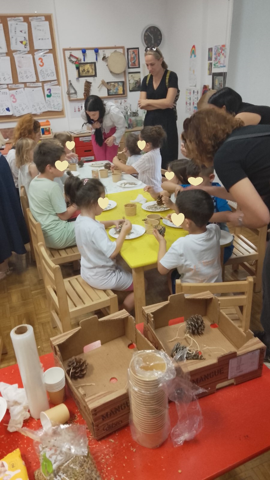 Ένας άλλος ιδιαίτερος σταθμός ήταν εκείνος με τις ταϊστρες για πουλάκια από κουκουνάρια και φυστικοβούτυρο . Με απλά φυσικά υλικά φτιάξαμε “σπιτικές” λιχουδιές για τα πουλιά. Μια τρυφερή πράξη προσφοράς και σεβασμού για τα πλάσματα του ουρανού.
