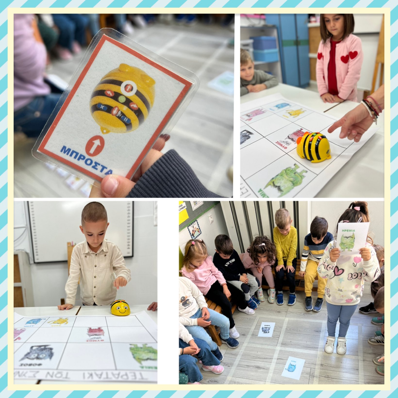 Έμαθαν έτσι την έννοια της ακολουθίας και του αλγορίθμου (μιας σειράς εντολών) με τον πιο διασκεδαστικό τρόπο. Τέλος προγραμμάτισαν και τη bee bot ώστε να μπορέσει να φτάσει στον προορισμό που επέλεξαν και πήραμε και Αριστείο για τη συμμετοχή μας.