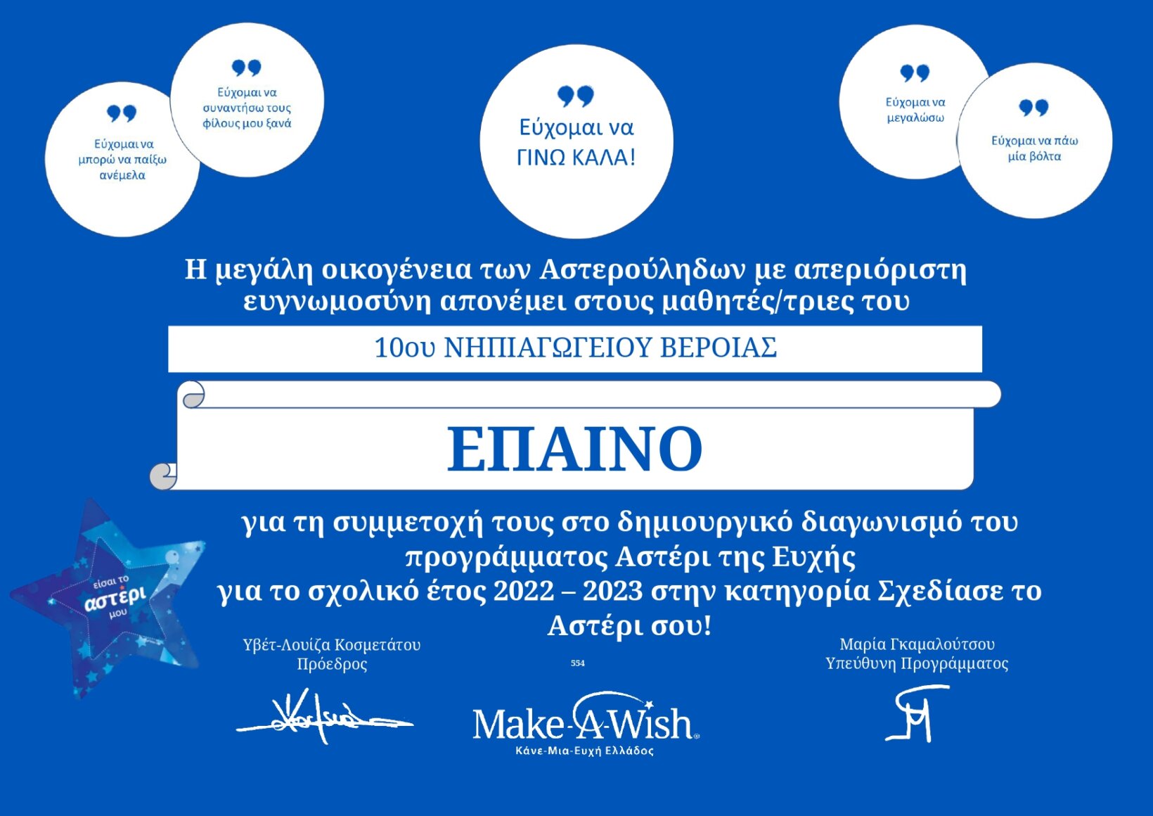 Έπαινος συμμετοχής του νηπιαγωγείου μας στον δημιουργικό διαγωνισμό του προγράμματος Αστέρι της ευχής στην κατηγορία:σχεδίασε το αστέρι σου! 10ο ΝΗΠΙΑΓΩΓΕΙΟ ΒΕΡΟΙΑΣ 9 Μαΐου 2023