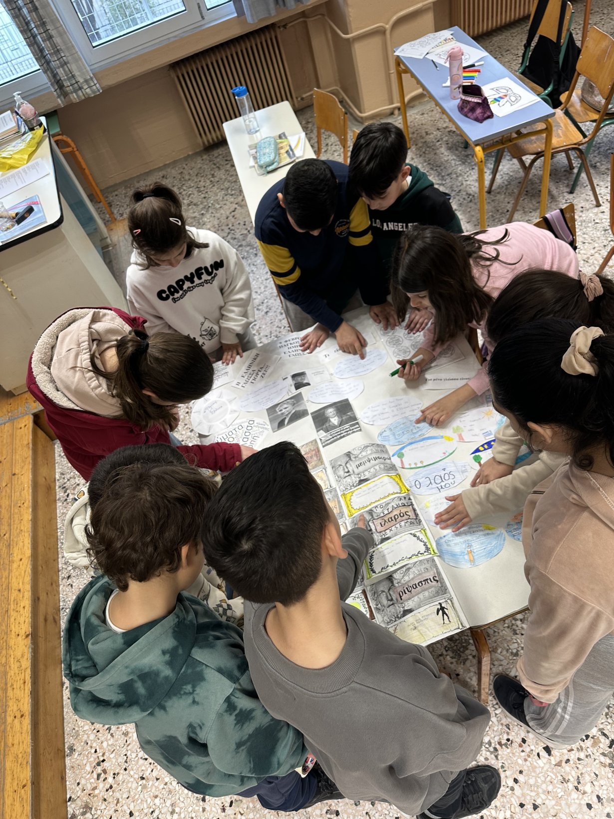 Εντός του σχολείου οι μαθητές/τριες συμμετείχαν σε εργαστήρια παρακολούθησης πολυμεσικών αρχείων και συζητήσεων επί του θέματος, δημιουργίας ποιήματος από τους μαθητές/τριες της Στ΄1 τάξης καθώς και καλλιτεχνικών έργων.