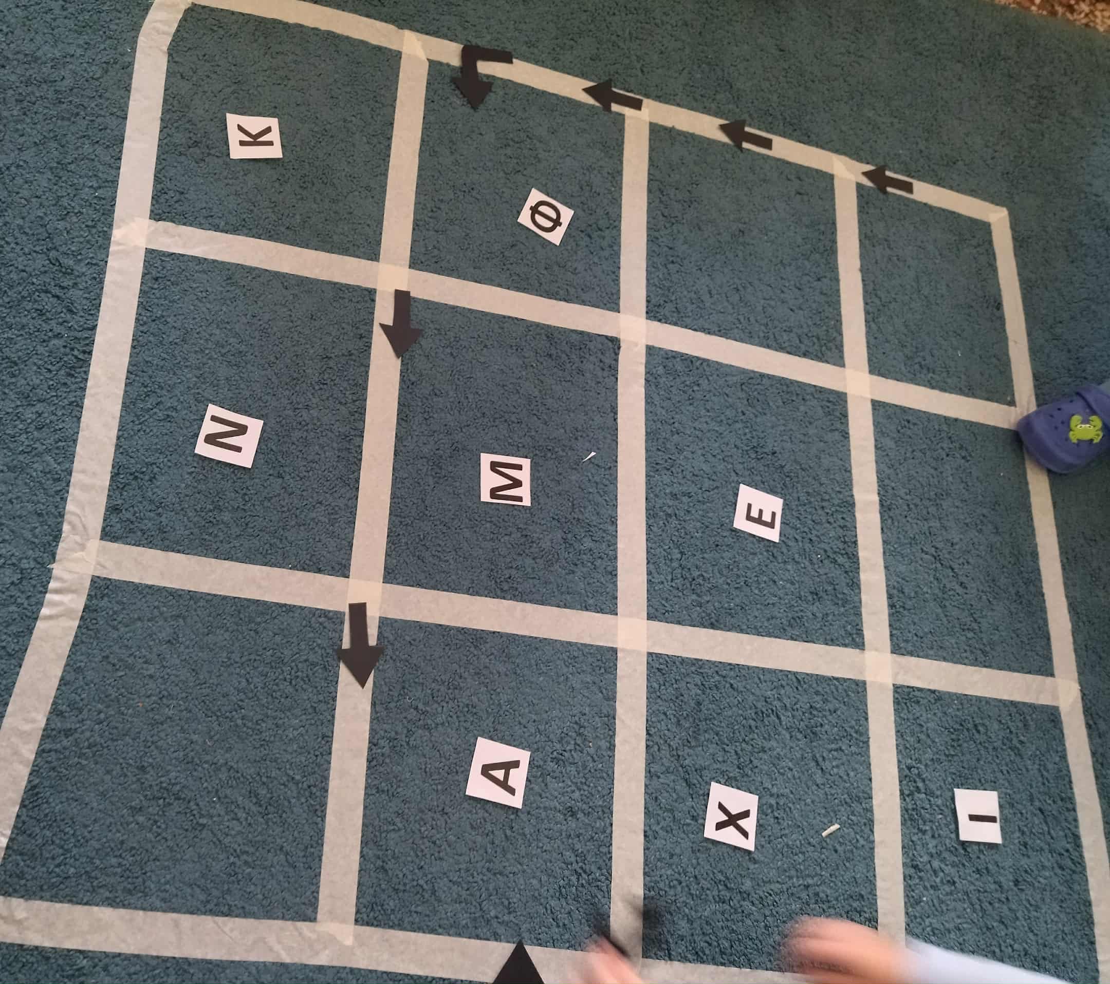 1.Σε ένα διαμορφωμένο επιδαπεδιο πλέγμα υπάρχουν τα αρχικά γράμματα από τα ονόματα των παιδιών.Το κάθε παιδί γίνεται ρομποτακι και καλείται να αναγνωρίσει το αρχικό του,να τοποθετήσει τα βελάκια με τη σωστή σειρά,να εκτελέσει την διαδρομή και να φτάσει στο αρχικό γράμμα.