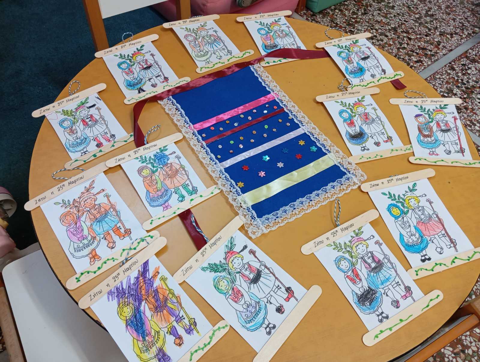 Την προηγούμενη βδομάδα μιλήσαμε και μάθαμε για τους ήρωες του 1821 και κατασκευάσαμε παραδοσιακές ποδιές και φέσια. Φυσικά ζωγραφίσαμε την αγαπημένη μας Ελλάδα, με καράβια , θάλασσα και γαλάζιο ουρανό!