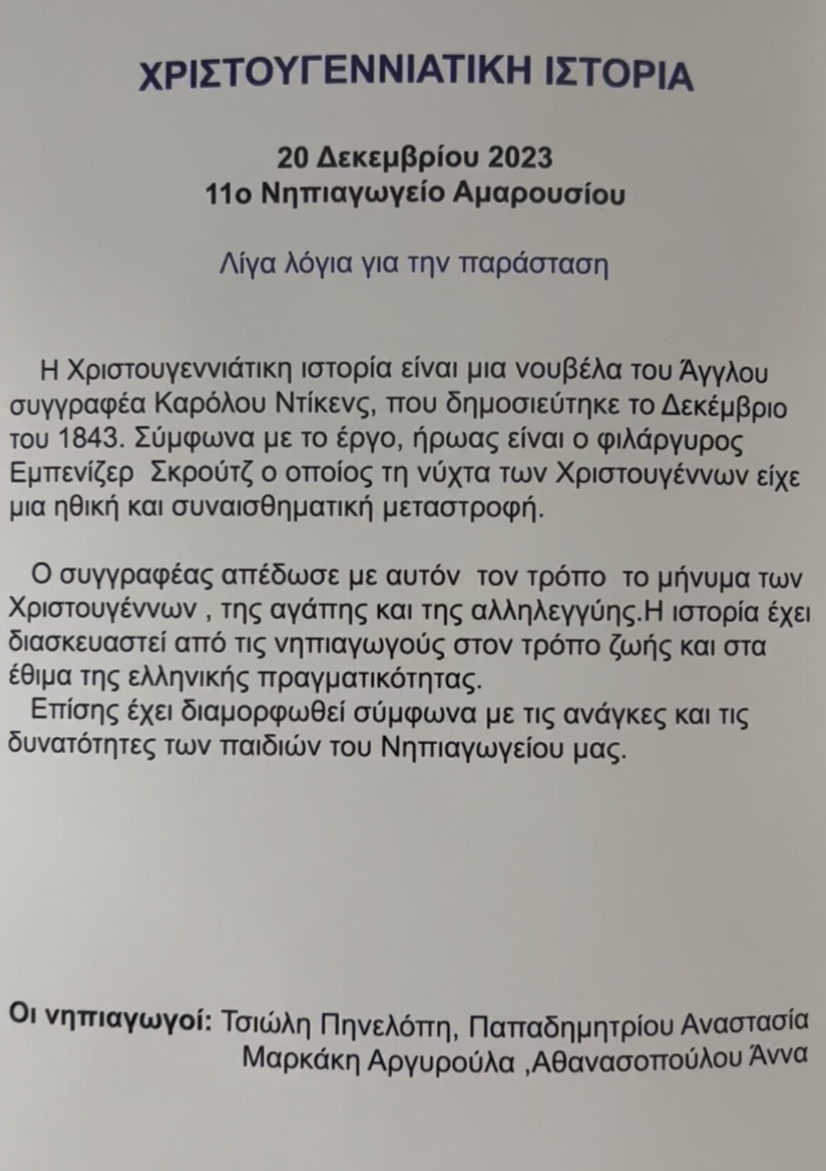 Τετάρτη,20 Δεκεμβρίου 2023.Η ημέρα της παράστασης ήρθε και το σκηνικό της είναι έτοιμο για να υποδεχθεί τα παιδιά το απόγευμα και να το αναδείξουν με τη χαρά, τον αυθορμητισμό και τη δημιουργικότητά τους! Τα παιδιά γνωρίστηκαν πριν τρεις μήνες, καλλιεργήθηκε η εμπιστοσύνη ,ο σεβασμός, η αυτοπεποίθηση και η ανάγκη για ένα ομαδικό αποτέλεσμα. Αυτό μας το προσφέρει μια θεατρική παράσταση που είναι συλλογική προσπάθεια, όπου όλοι είναι απαραίτητοι και κανείς δεν περισσεύει. Επίσης τα παιδιά εκφράζονται μέσα από τη θεατρική τέχνη με ανεκτίμητα για εκείνα παιδαγωγικά οφέλη.