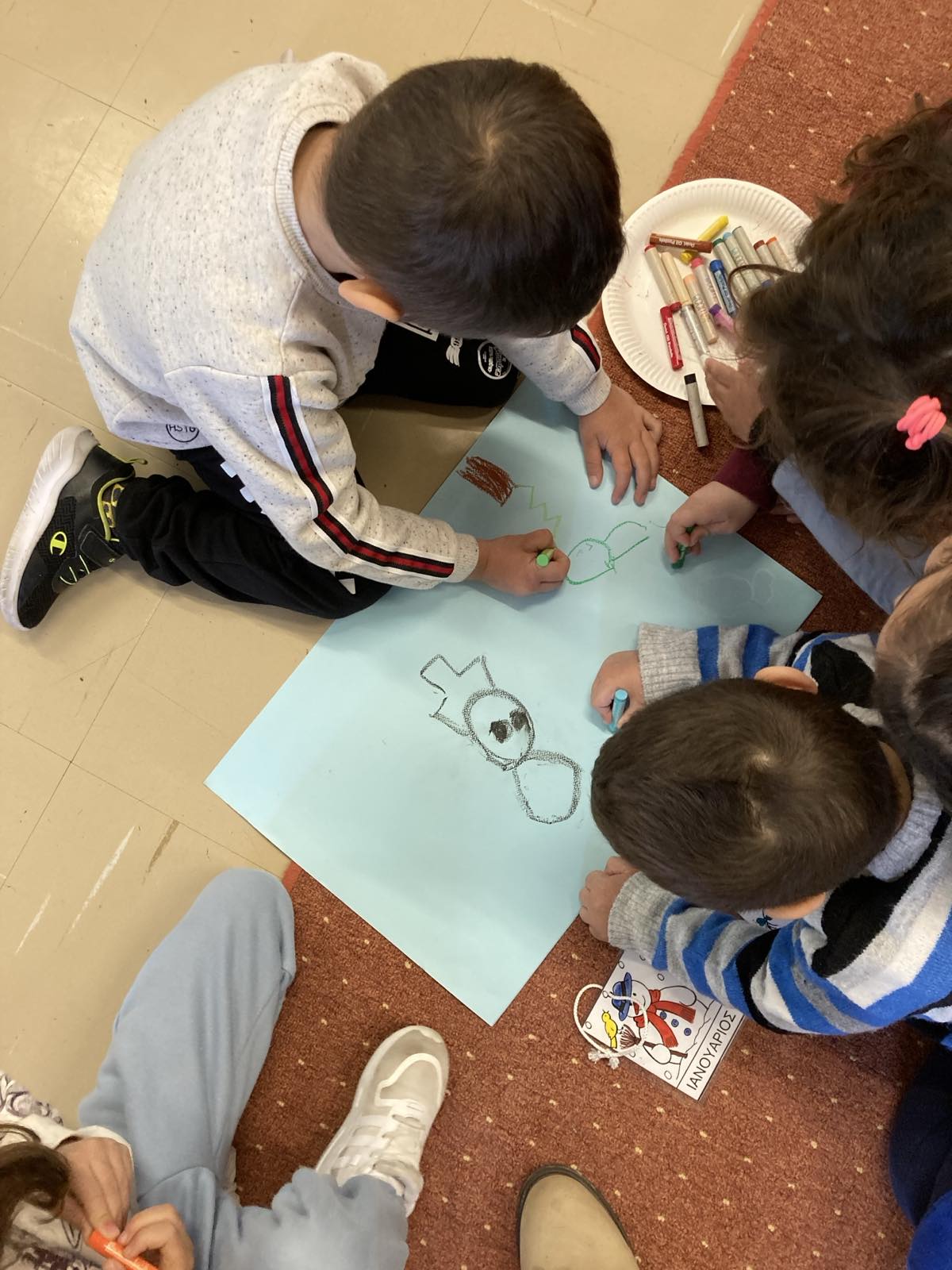 Χωριστήκαμε σε 4 ομάδες και η κάθε ομάδα συνεργάστηκε και ζωγράφισε με φαντασία και κηρομπογιές στοιχεία, αντικείμενα και σύμβολα που σχετίζονται με την κάθε εποχή. Στη συνέχεια η κάθε ομάδα/εποχή παρουσίασε το έργο της στις υπόλοιπες. Τέλος, κατασκευάσαμε και τον “κύκλο των εποχών”.