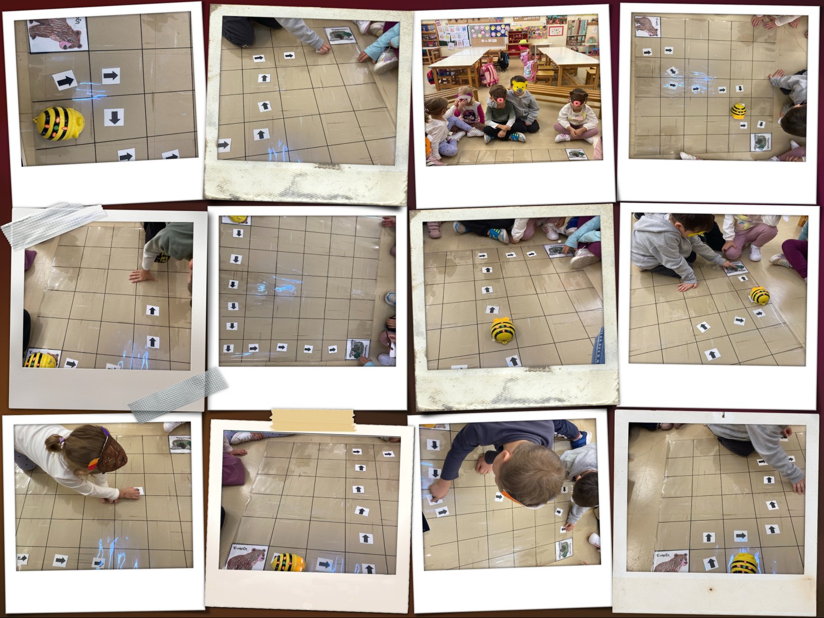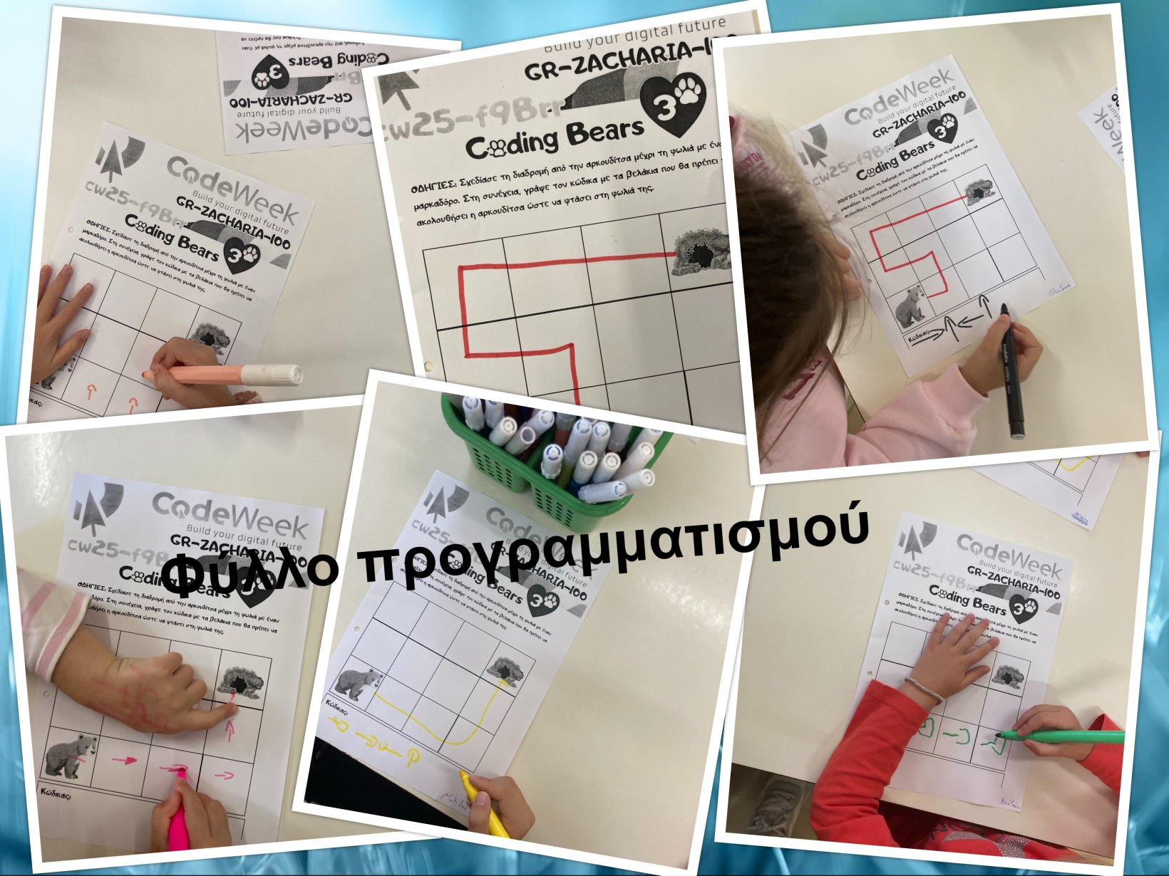 …Αξιοποιήσαμε το αγαπημένο μας ρομποτάκι beebot, το ειδικό δάπεδο με τα τετραγωνάκια και καρτέλες και σύμφωνα με το σενάριο τα παιδιά έπρεπε να προγραμματίσουν το beebot ώστε να φτάσει από την αφετηρία στη φωλιά. Στο τέλος συμπληρώσαμε και το φύλλο εργασίας προγραμματισμού όπου τα παιδιά σκεπτόμενα αναπαραστατικά έπρεπε να σχεδιάσουν μια διαδρομή από την αρκουδίτσα στη φωλιά και στη συνέχεια να την γράψουν χρησιμοποιώντας βελάκια κατεύθυνσης.