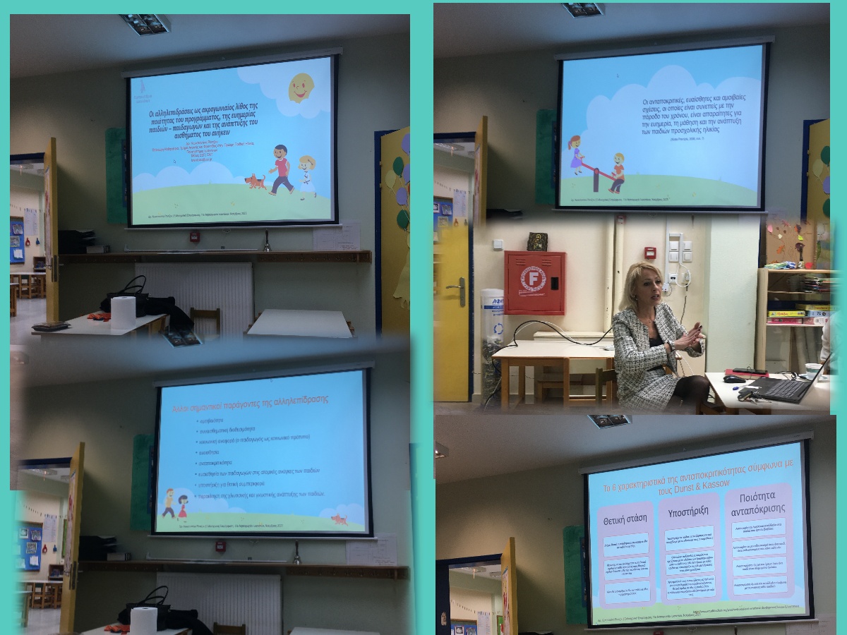 Η διεύθυνση και το διδακτικό προσωπικό του 11ου Νηπιαγωγείου Ιωαννίνων ευχαριστεί την κα. Κωνσταντίνα Ρέντζου, επίκουρη καθηγήτρια του Τμήματος Αγωγής και Φροντίδας στην Πρώιμη Παιδική Ηλικία, του Πανεπιστημίου Ιωαννίνων που συμμετείχε με δια ζώσης εισήγηση στην ενδοσχολική επιμόρφωσης του διδακτικού προσωπικού του σχολείου μας. Η επιμορφωτική δράση πραγματοποιήθηκε στις 29 Νοέμβριου 2023, στο κεντρικό κτίριο του σχολείου και είχε ως θέμα : « Οι αλληλεπιδράσεις ως ακρογωνιαίος λίθος της ποιότητας του προγράμματος, της ευημερίας παιδιών – παιδαγωγών και της ανάπτυξης του αισθήματος του ανήκειν».
