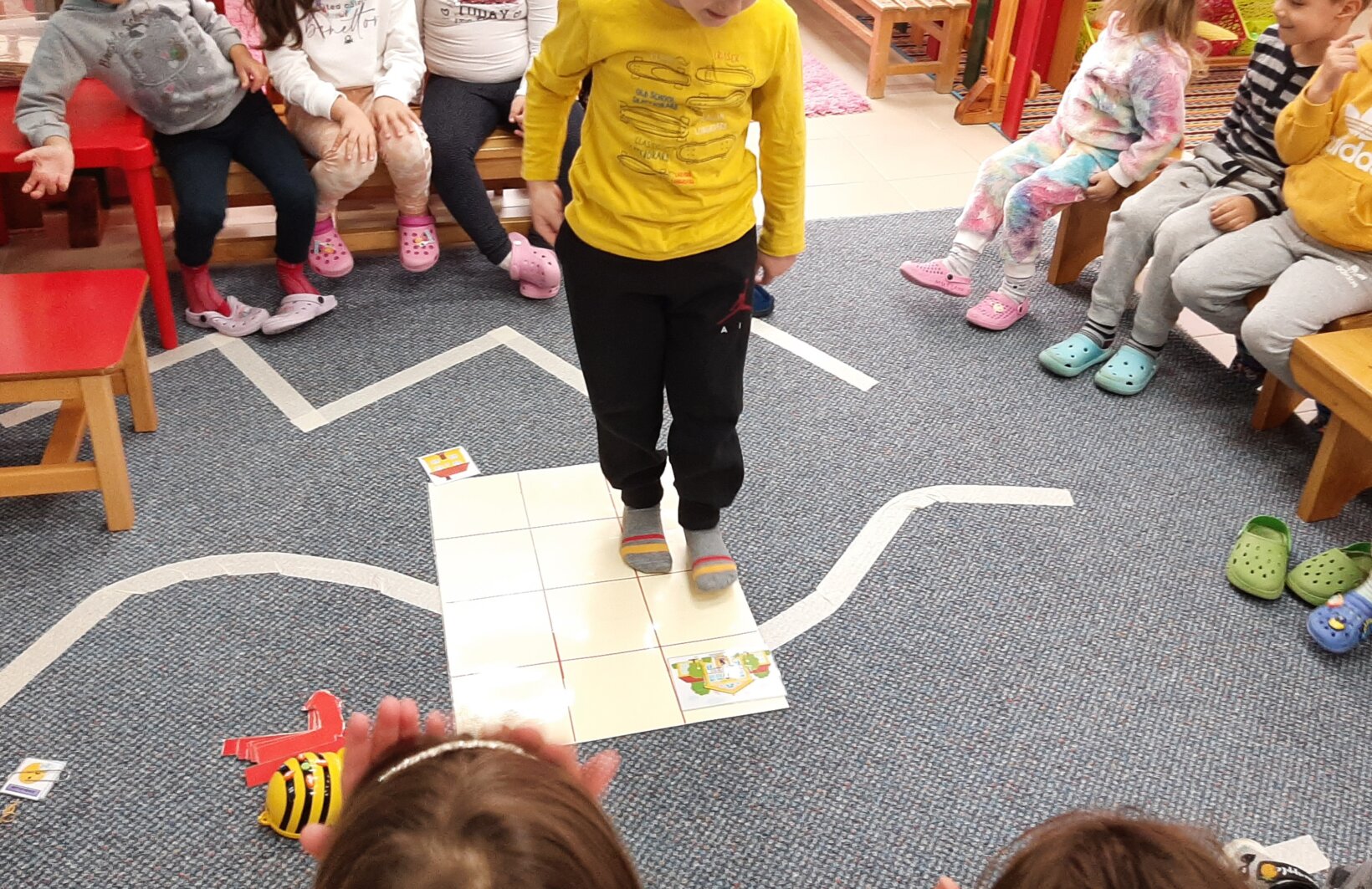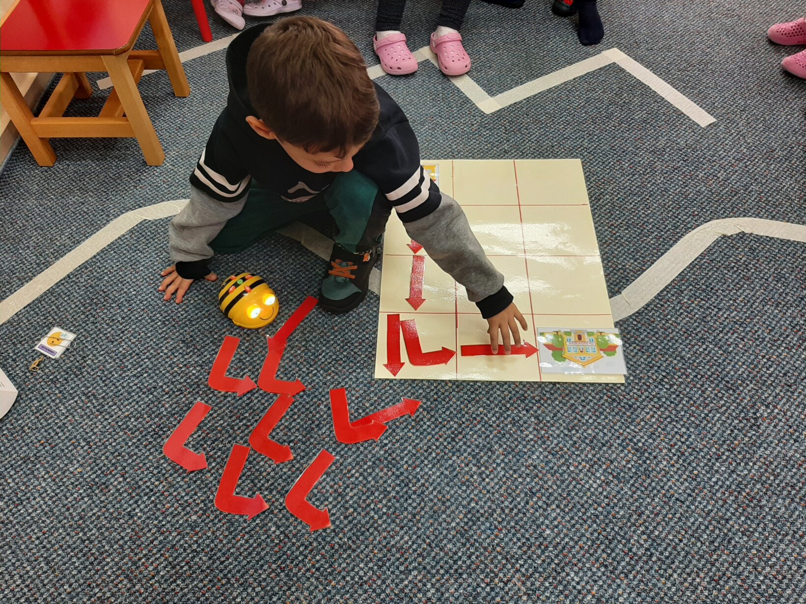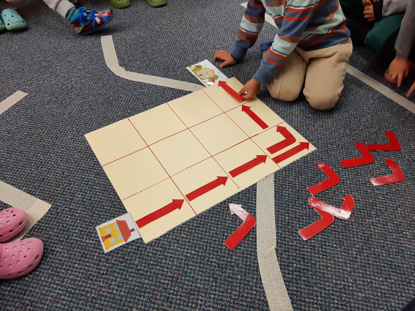 Τοποθετούμε σε ένα τετράγωνο το σπίτι και σε ένα άλλο το σχολείο. Κάνουμε πρώτα εμείς την διαδρομή της BeeBot…