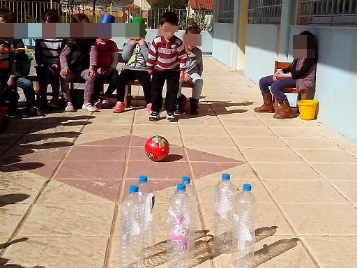 «Μπόουλινγκ με μπουκαλολαγουδάκια». Κυρίως χρειάζεστε έξι μεγάλα άδεια μπουκάλια νερού και μία μπάλα. Αρχικά δώστε στα παιδιά χαρτί και μαρκαδόρους να ζωγραφίσουν διάφορα λαγουδάκια και πολύ προσεκτικά να τα κόψουν με ένα ψαλίδι και να τα κολλήσουν στα άδεια μπουκάλια νερού, (μπορούμε να τα αφήσουμε ελεύθερα και να ζωγραφίσουν ότι θέλουν). Στήνουμε τα μπουκάλια και με μία μπάλα προσπαθούμε να ρίξουμε όσα μπορούμε περισσότερα, όπως δείχνει η φωτογραφία. Μπορούμε να μετράμε πόσα έριξαν και πόσα έμειναν όρθια.