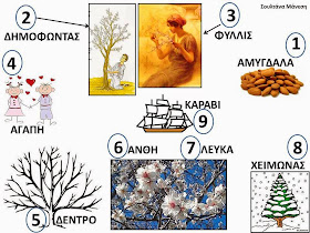 Μια φορά και ένα καιρό ζούσε μια όμορφη κοπέλα, η Φυλλίς, που αγαπούσε ένα παλικάρι που το όνομά του ήταν Δημοφώντας. Ζούσαν με αγάπη πολλή, όταν ξαφνικά μια μέρα ο Δημοφώντας ταξίδι έπρεπε να κάνει μακρινό. Υπόσχεση έδωσε πως σύντομα θα επιστρέψει…Με καράβι έφυγε ένα πρωί και η Φυλλίς έμεινε μόνη να τον περιμένει…Τα χρόνια περνούσαν μα ο Δημοφώντας δεν επέστρεφε. Οι θεοί του Ολύμπου λυπήθηκαν την όμορφη κοπέλα που από την θλίψη της κόντευε να πεθάνει και την μεταμόρφωσαν σε ένα δέντρο, που καθώς ήταν χειμώνας, γυμνό στεκόταν χωρίς φύλλα και άνθη. Ξάφνου, μια μέρα γυρίζει ο Δημοφώντας και αντικρίζει την αγαπημένη του μεταμορφωμένη σε δέντρο. Απελπισμένος τρέχει να την αγκαλιάσει και τότε το δέντρο γέμιζει άνθη λευκά, τα άνθη της όμορφης αμυγδαλιάς που μας δίνουν τα αμύγδαλα τα νόστιμα και τόσο δυναμωτικά…