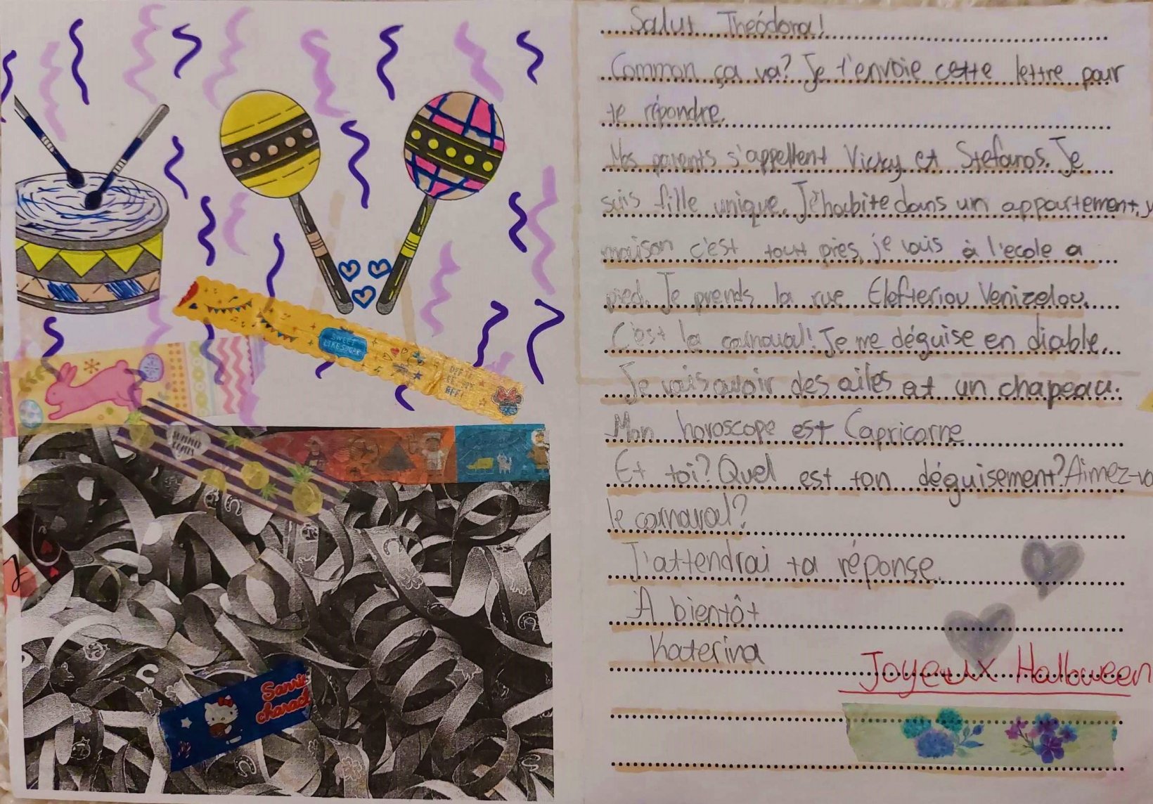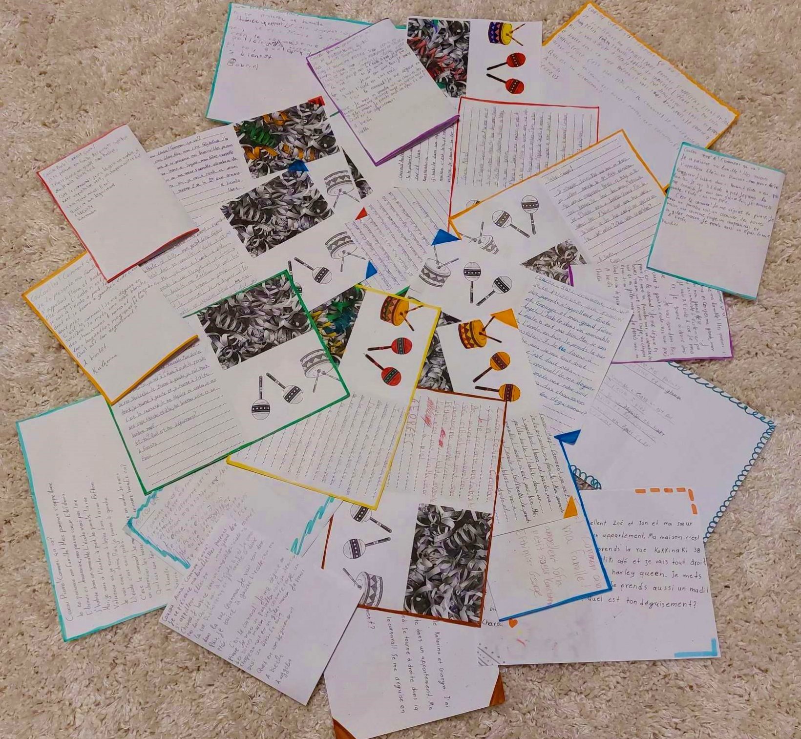 Οι μαθητές των Γαλλικών της Ε’ και της ΣΤ’ τάξης είχαν την ευκαιρία να αλληλογραφήσουν με μαθητές των γειτονικών Δημοτικών Σχολείων του Δήμου μας (4ο & 5ο ΔΣ). Στόχος της παρούσας δράσης ήταν να αναπτύξουν οι μαθητές τον γραπτό λόγο στα Γαλλικά, να εξοικειωθούν με έθιμα και παραδόσεις και να καλλιεργήσουν έναν προσωπικό τρόπο έκφρασης μέσα από ευχάριστες βιωματικες εμπειριες.