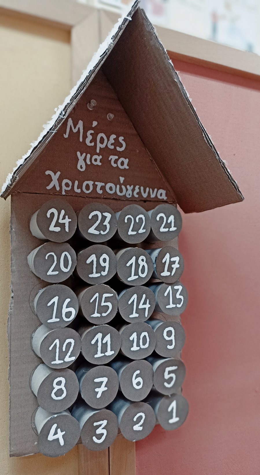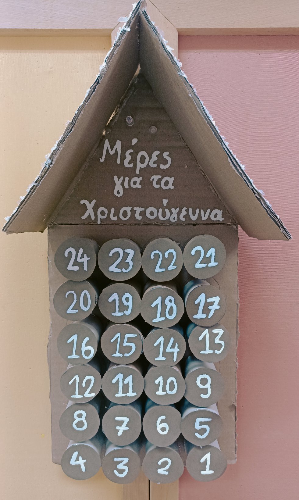 Με αυτό το ημερολόγιο θα μετράμε φέτος στην τάξη μας αντίστροφα τις ημέρες μέχρι τα Χριστούγεννα. Κάθε μέρα θα τραβάμε έναν αριθμό και θα ανοίγουμε το χαρτάκι που κρύβεται μέσα στο ρολό.