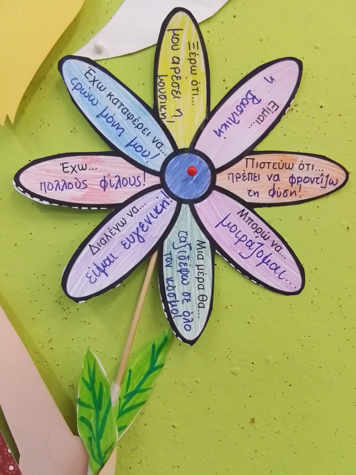 Το λουλούδι της αυτοπεποίθησης: Τα παιδιά με τη βοήθεια της νηπιαγωγού συμπληρώνουν φράσεις πάνω στα πέταλα ενός λουλουδιού, όπως κάτι για το οποίο είναι περήφανα, τις ικανότητές τους, τι τους αρέσει στον εαυτό τους ή πράγματα για τα οποία είναι ευγνώμονα. Μέσα από την συγκεκριμένη δραστηριότητα το παιδί μαθαίνει μόνο του να μπαίνει στη διαδικασία να σκέφτεται πράγματα για τα οποία θαυμάζει, υπενθυμίζει στον εαυτό του ότι έχει πάντοτε δίπλα του ανθρώπους που το υποστηρίζουν στις επιλογές του και αναγνωρίζει εκείνα τα πρόσωπα/καταστάσεις/γεγονότα που το βοηθούν να γίνει η καλύτερη εκδοχή του εαυτού του.