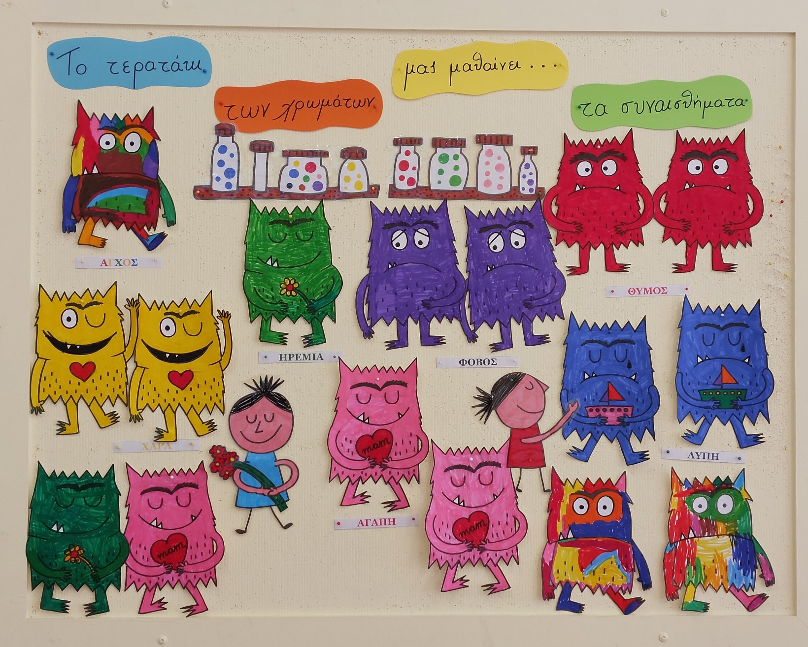 Στο τέλος του εργαστηρίου τα παιδιά πήραν ως αναμνηστικό τα παράσημα και τα τερατάκια που φτιάξαμε και κατάλαβαν ότι πρέπει να εκφράζουμε τα συναισθήματά μας ,έτσι θα γίνουμε ευτυχισμένοι άνθρωποι και θα μπορούμε να συμμετέχουμε στην ομάδα μας, γιατί το σύνθημά μας είναι: ΟΛΟΙ ΜΑΖΙ,ΟΛΟΙ ΜΑΖΙ ΕΙΜΑΣΤΕ ΠΑΝΤΑ ΠΙΟ ΔΥΝΑΤΟΙ.