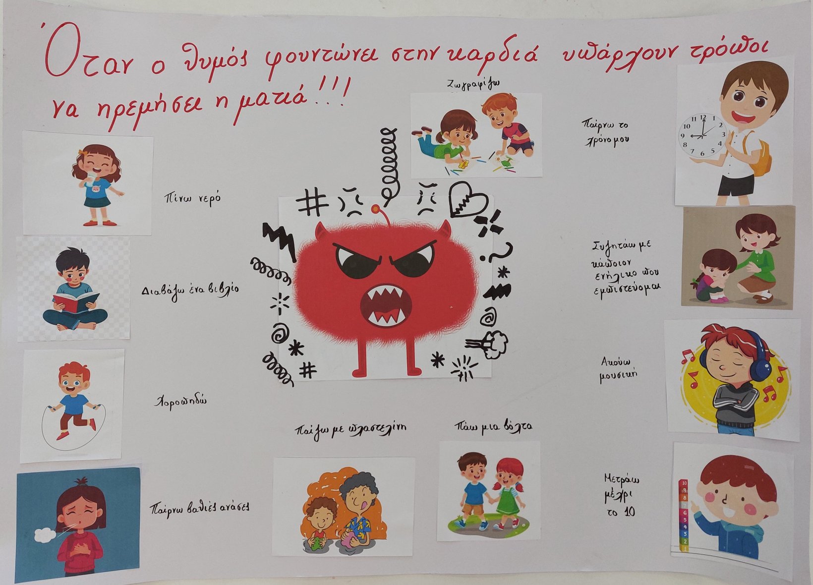 Τι είναι ο θυμός; Τι συμβαίνει στο σώμα μας; Πώς αντιμετωπίζουμε τον θυμό μας; Παράδειγμα με ένα μπαλόνι. Φανταστείτε το θυμό μας σας ένα μπαλόνι. Κάθε τι που μας θυμώνει είναι σαν να φουσκώνουμε ένα μπαλόνι. Τι θα συμβεί αν συνεχώς θυμώνουμε, φουσκώνουμε το μπαλόνι; Θα εκραγούμε όπως η εικόνα του θυμού που πετάει φωτιές ( ο ήρωας της ταινίας τα μυαλά που κουβαλάς) Αν αφήσουμε το μπαλόνι απότομα τι θα συμβεί; Υπάρχει πιθανότητα να χτυπήσουμε κανέναν έτσι πως κουτουλάει το μπαλόνι εδώ κι εκεί; Αν αφήναμε τον αέρα λίγο λίγο; Μήπως το μπαλόνι θα μπορούσε να ξαναγίνει όπως και πριν; Τα παιδιά προτείνουν λύσεις αντιμετώπισης του θυμού. Προτείνεται να φτιάξουμε μία γωνιά χαλάρωσης. Μπορούμε να μετράμε μέχρι το 10. Μπορούμε να παίρνουμε βαθιές ανάσες. Eτοιμάσαμε ένα κουτί και βάλαμε μέσα διάφορα αντικείμενα που θα βοηθούσαν κάποιον να χαλαρώσει όταν είναι θυμωμένος ή λυπημένος. Έτσι μπορούμε να διαβάσουμε ένα βιβλίο, να χαϊδέψουμε ένα λούτρινο, να ξαπλώσουμε σε ένα μαξιλάρι για να χαλαρώσουμε ή να παίξουμε με ένα μπαλάκι ή ένα pop it bubbles.