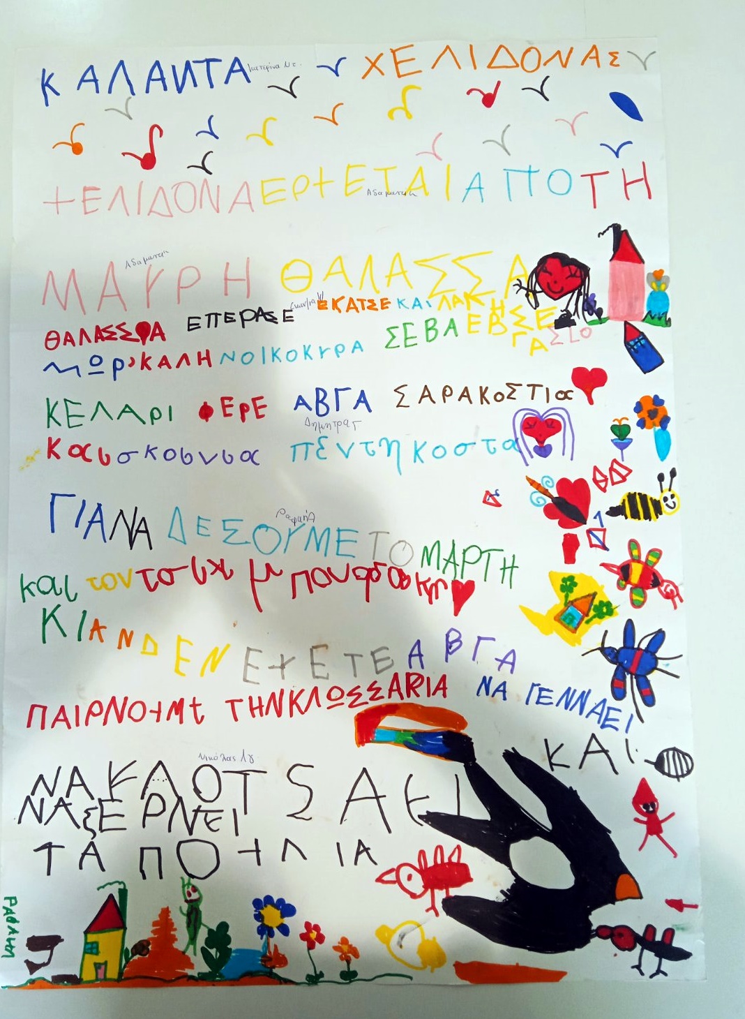 Ομοίωμα χελιδονιού κατασκευή και βάψαμε τα πουλάκια από πηλό που είχαμε πλάσει την περασμένη βδομάδα , Πήραμε σπίτι τα πήλινα πουλάκια μας, και γράψαμε σε κάνσον χαρτόνι τα κάλαντα της χελιδόνας (ομαδοσυνεργατικό έργο), κάθε λέξη με διαφορετικό χρώμα.