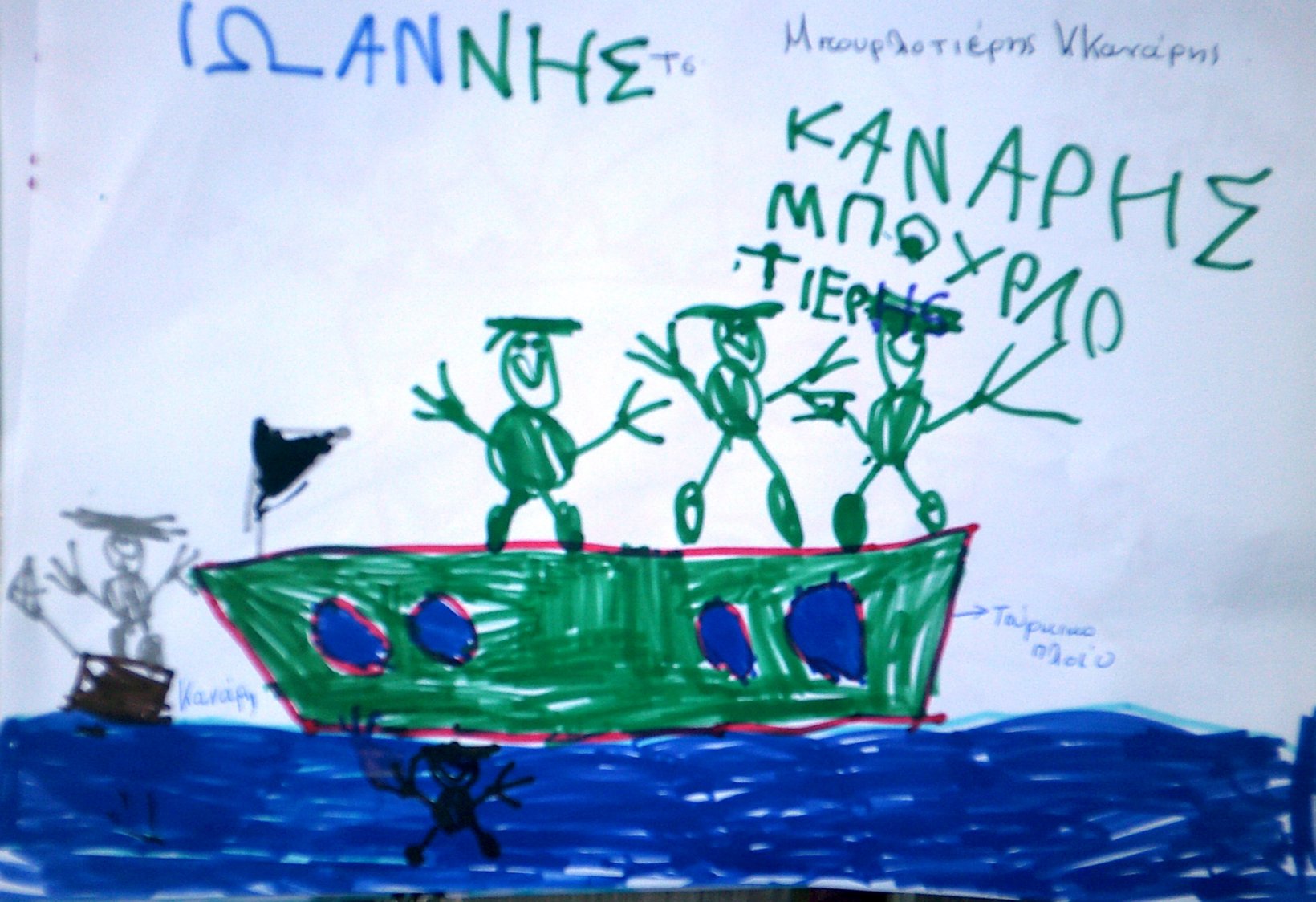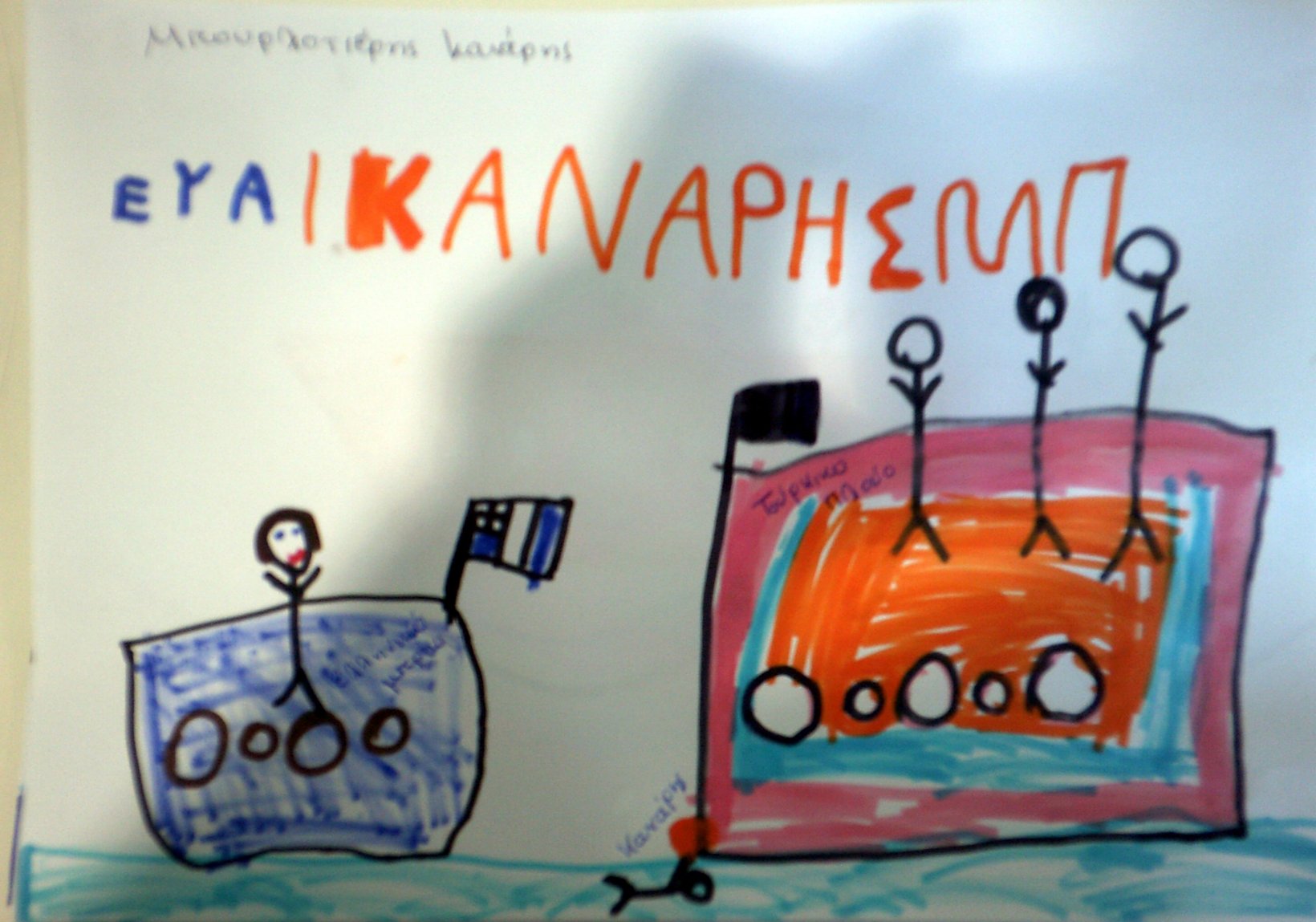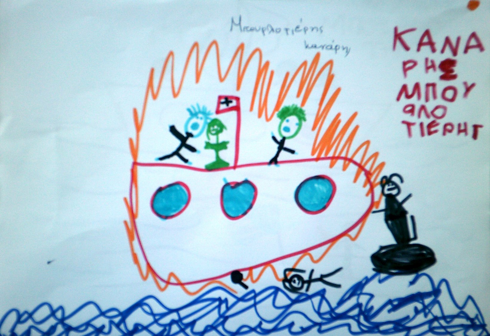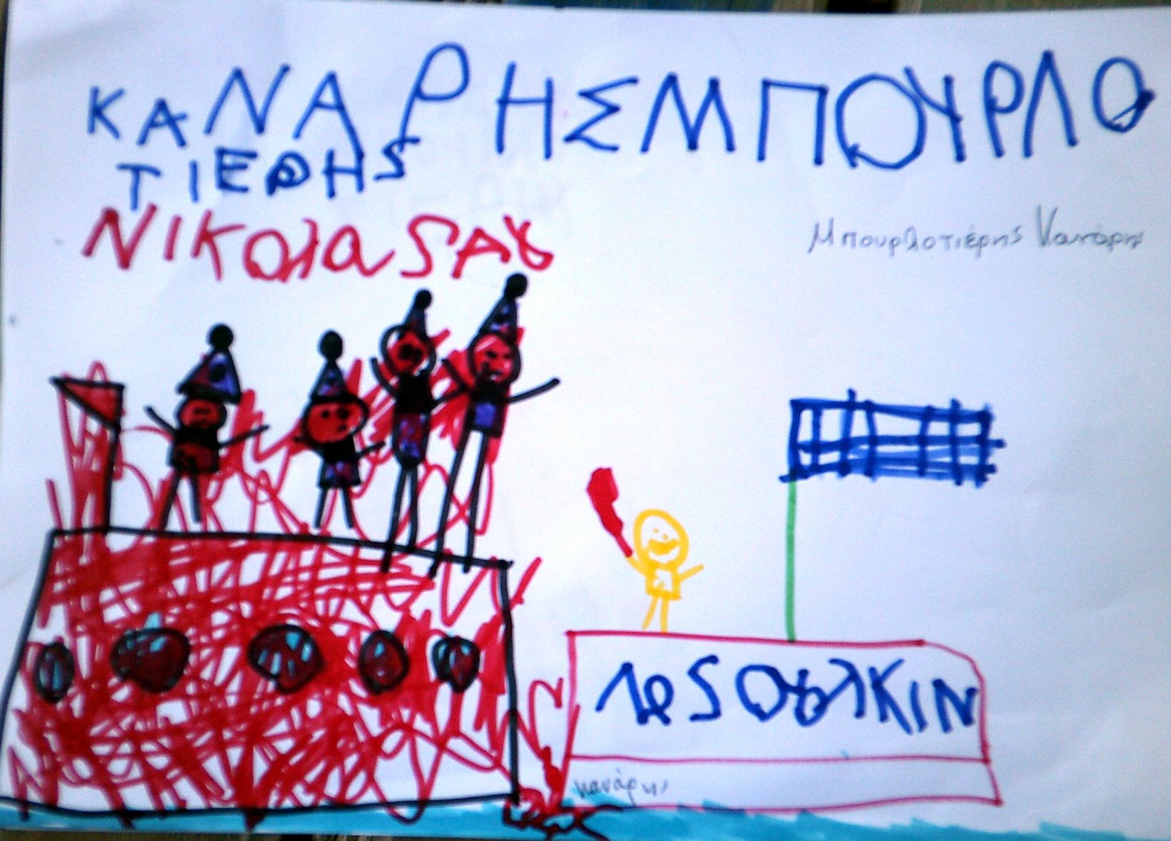 Τα παιδιά ζωγράφισαν τον Κανάρη που βάζει μπουρλότο στην Τουρκική ναυαρχίδα κι έγραψαν όπως μπορούν ΜΠΟΥΡΛΟΤΙΕΡΗΣ ΚΑΝΑΡΗΣ