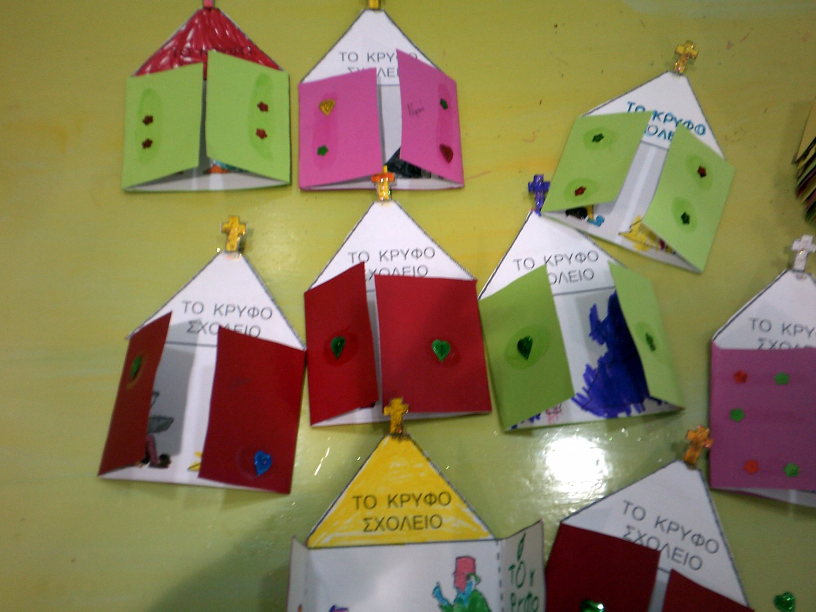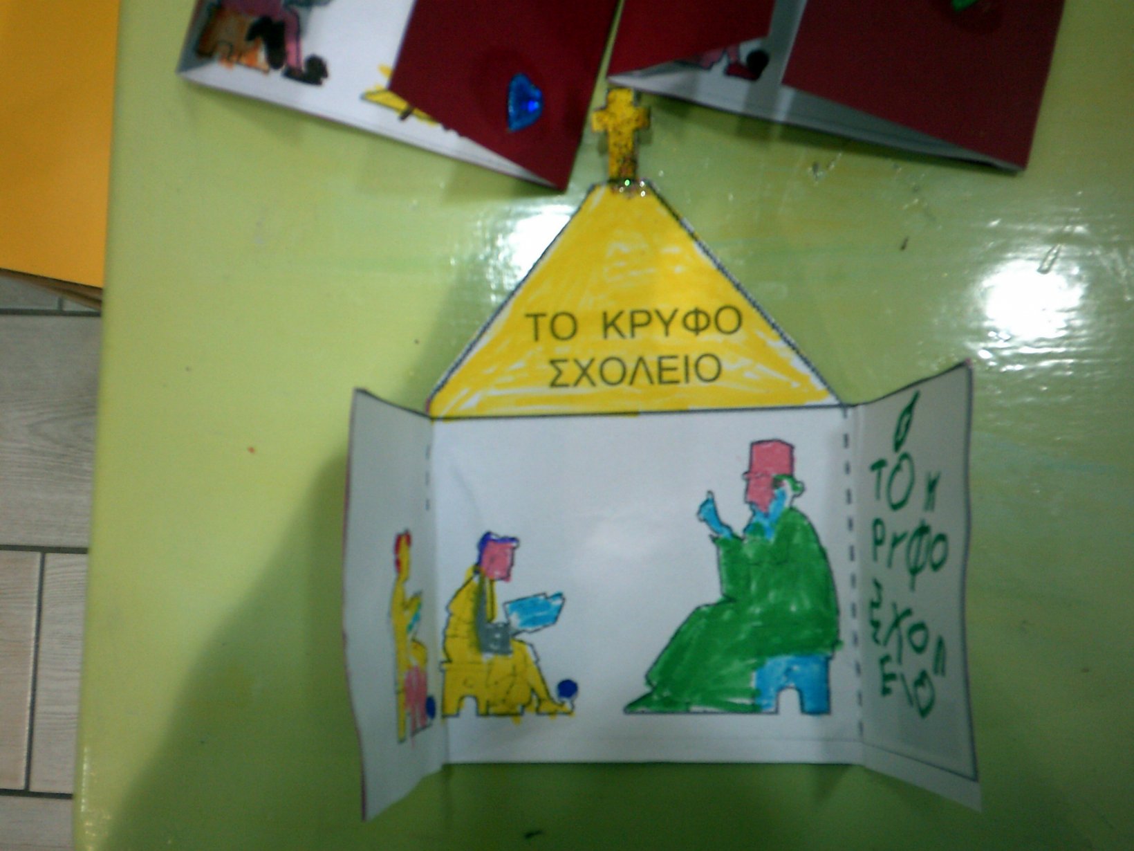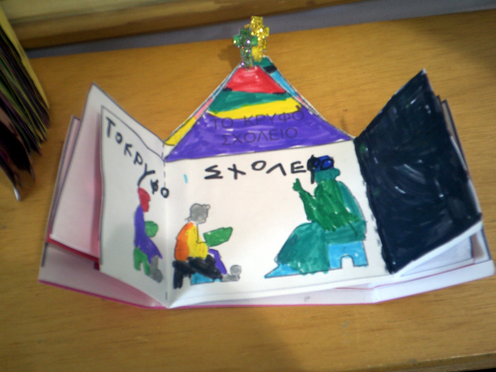 Γνωρίσαμε την ιστορία του κρυφού σκολειού , τραγουδήσαμε το παραδοσιακό τραγουδάκι φεγγαράκι μου λαμπρό και δημιουργήσαμε χειροτεχνία ζωγραφική κολλάζ το κρυφό σκολειό . Γράψαμε όπως μπορούμε ΤΟ ΚΡΥΦΟ ΣΚΟΛΕΙΟ