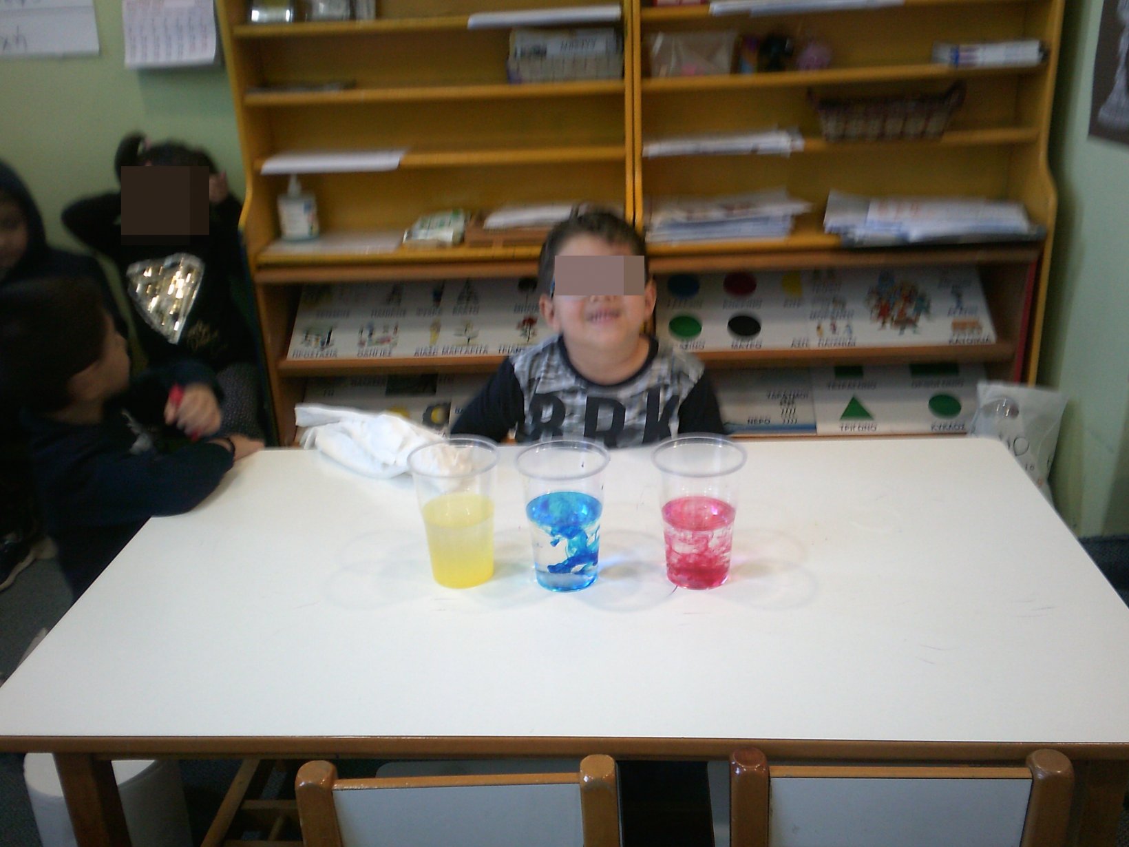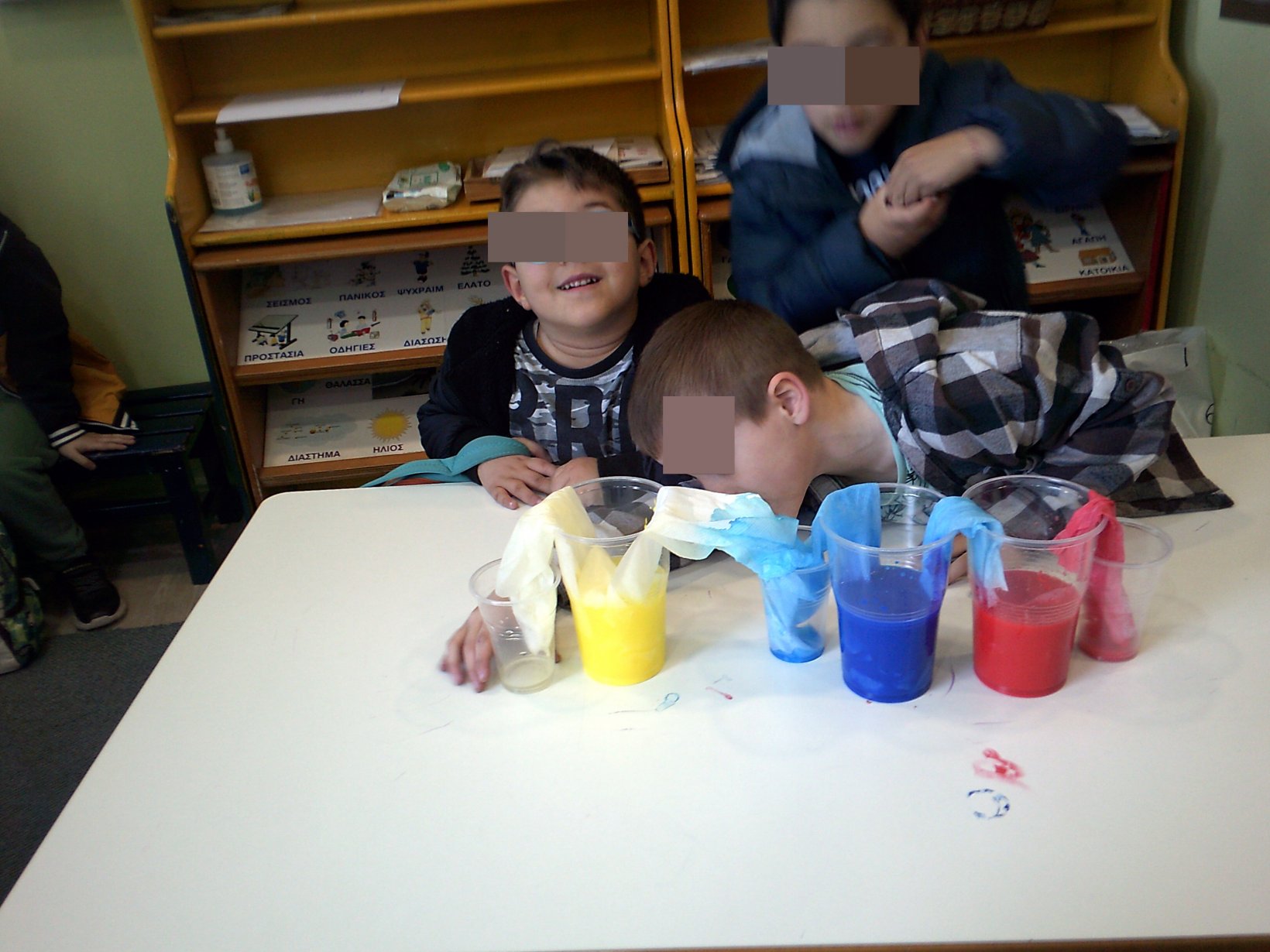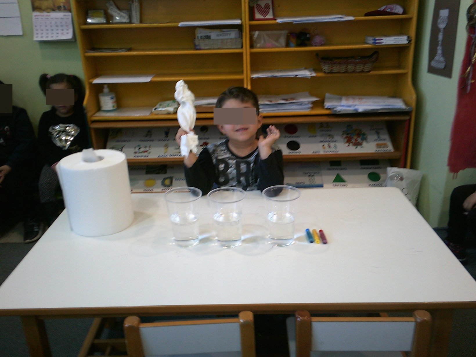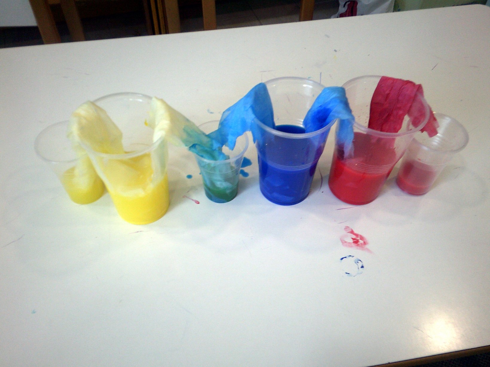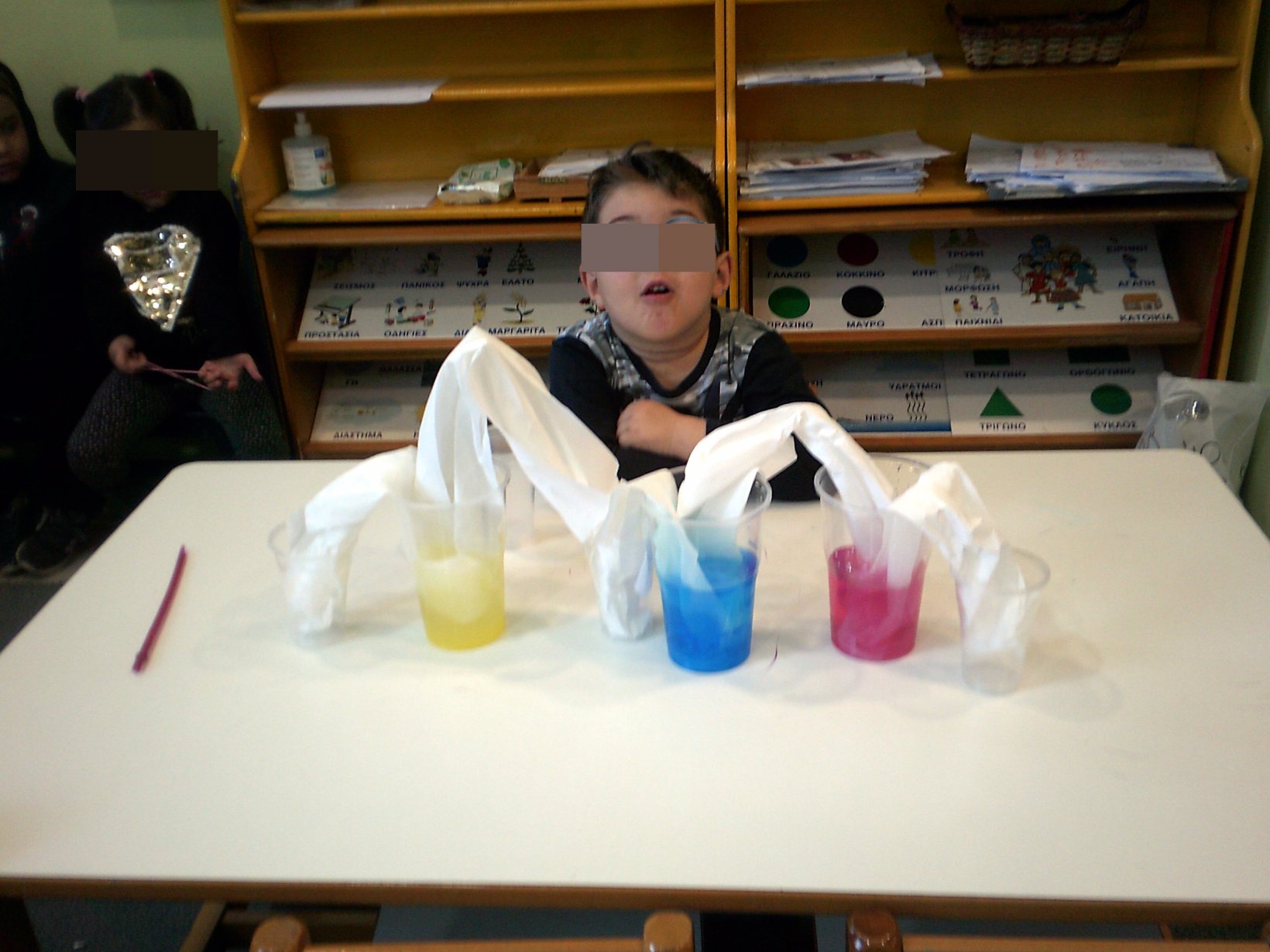 βάζουμε ένα κομμάτι απορροφητικό χαρτί κουζίνας σε κάθε ποτηράκι και..περιμένουμε . Άραγε τι θα συμβεί? Τα παιδιά αμέσως διατύπωσαν την ιδέα πως θα μουσκευτεί το χαρτί, θα βαφτεί με το χρώμα της ζαχαροπλαστικής και το νερό σιγά σιγά θα περάσει στο διπλανό ποτήρι. Μπράβο σε όλα μας τα παιδιά .