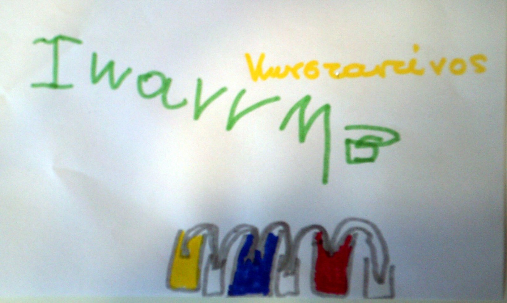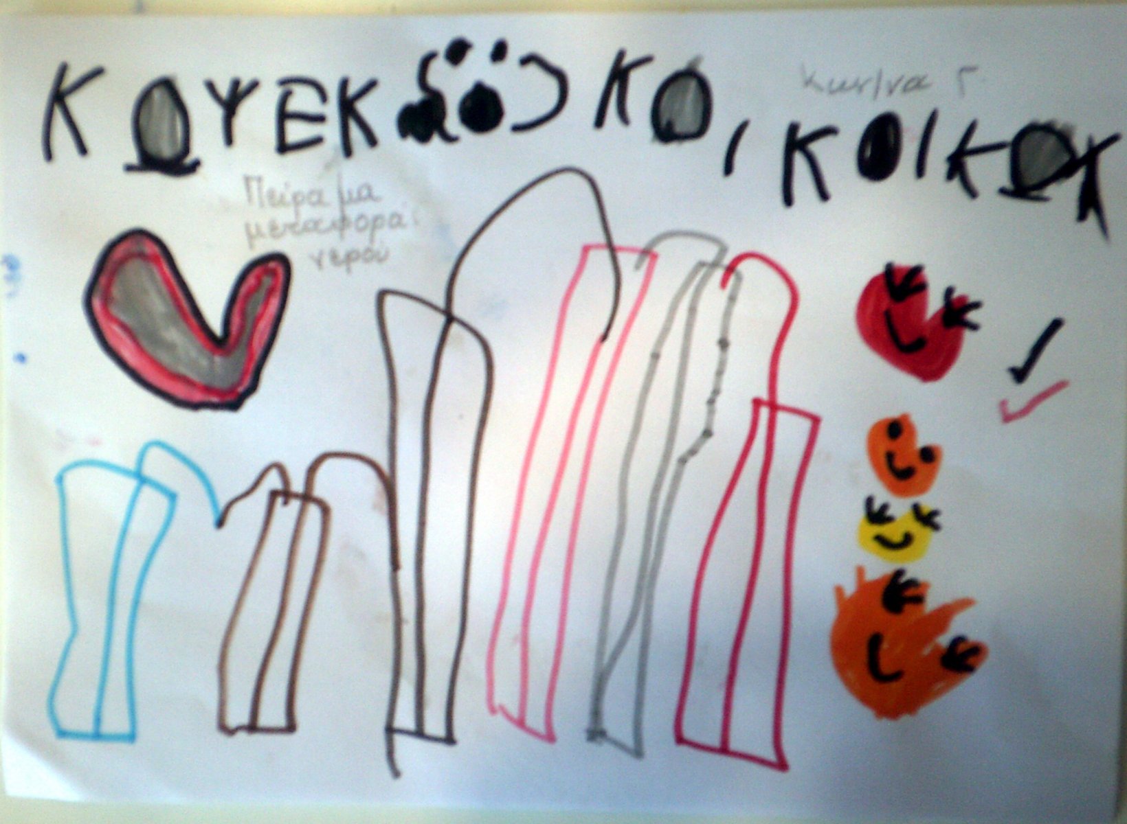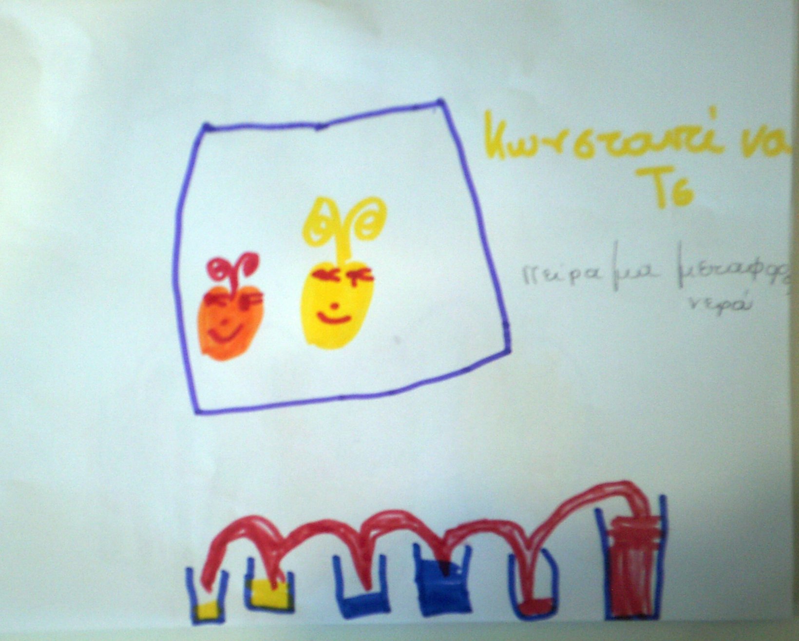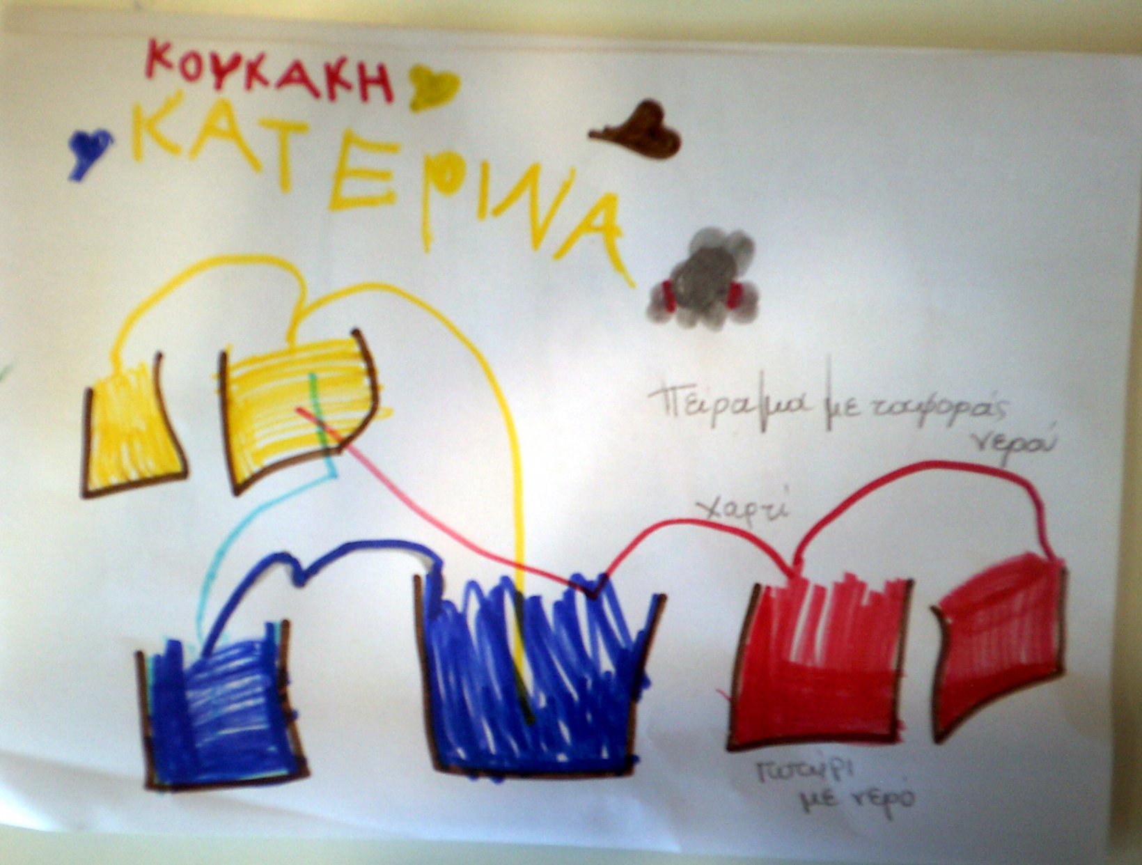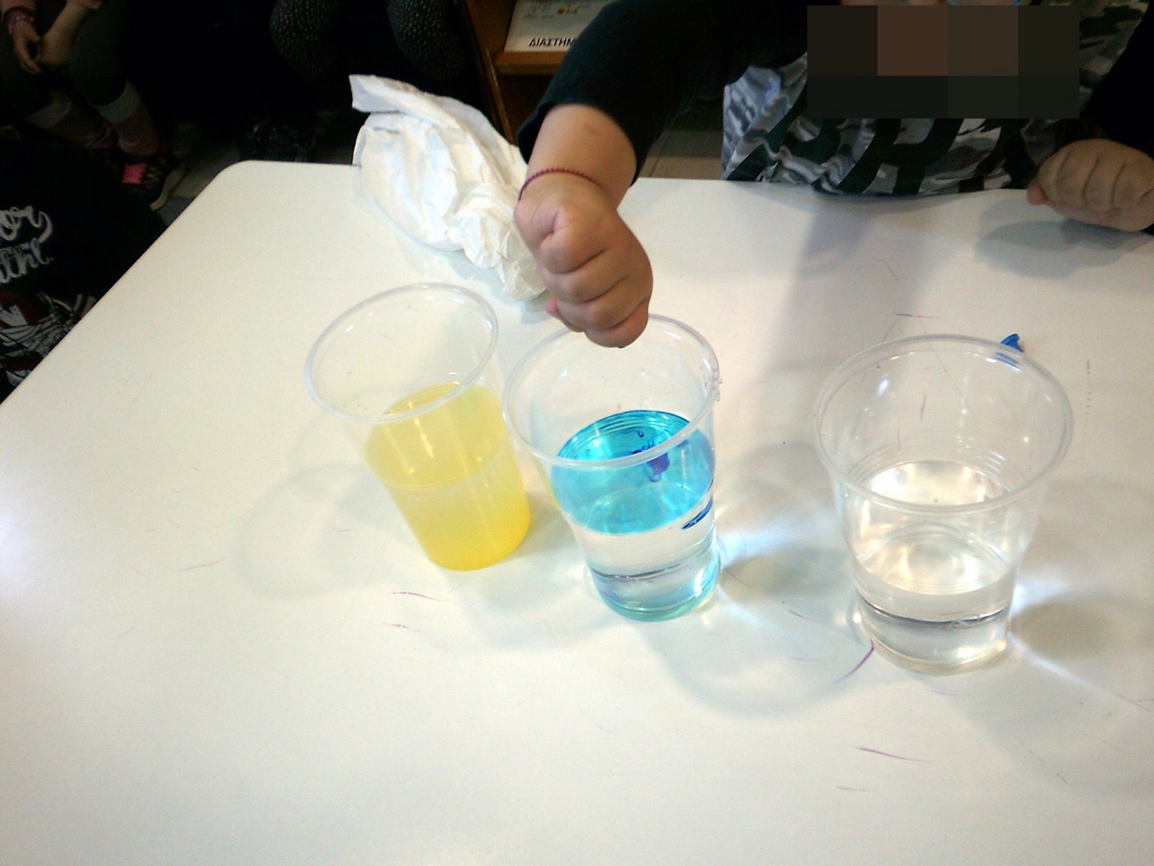 βάζουμε ένα κομμάτι απορροφητικό χαρτί κουζίνας σε κάθε ποτηράκι και..περιμένουμε . Άραγε τι θα συμβεί? Τα παιδιά αμέσως διατύπωσαν την ιδέα πως θα μουσκευτεί το χαρτί, θα βαφτεί με το χρώμα της ζαχαροπλαστικής και το νερό σιγά σιγά θα περάσει στο διπλανό ποτήρι. Μπράβο σε όλα μας τα παιδιά .