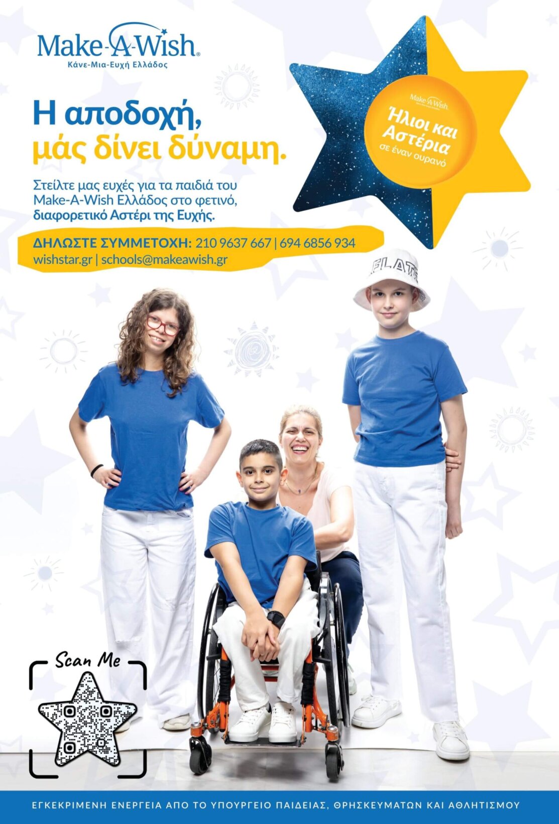 Το Make-A-Wish (Κάνε-Μια-Ευχή Ελλάδος) εκπληρώνει ευχές παιδιών 3 – 18 ετών που νοσούν από σοβαρές ασθένειες. Το εκπαιδευτικό πρόγραμμα Αστέρι της Ευχής φέτος γιορτάζει τα 25 του χρόνια και όλοι μαζί έχουμε καταφέρει να δώσουμε δύναμη σε εκατοντάδες παιδιά που έχουν ανάγκη, για να συνεχίσουν να αγωνίζονται.