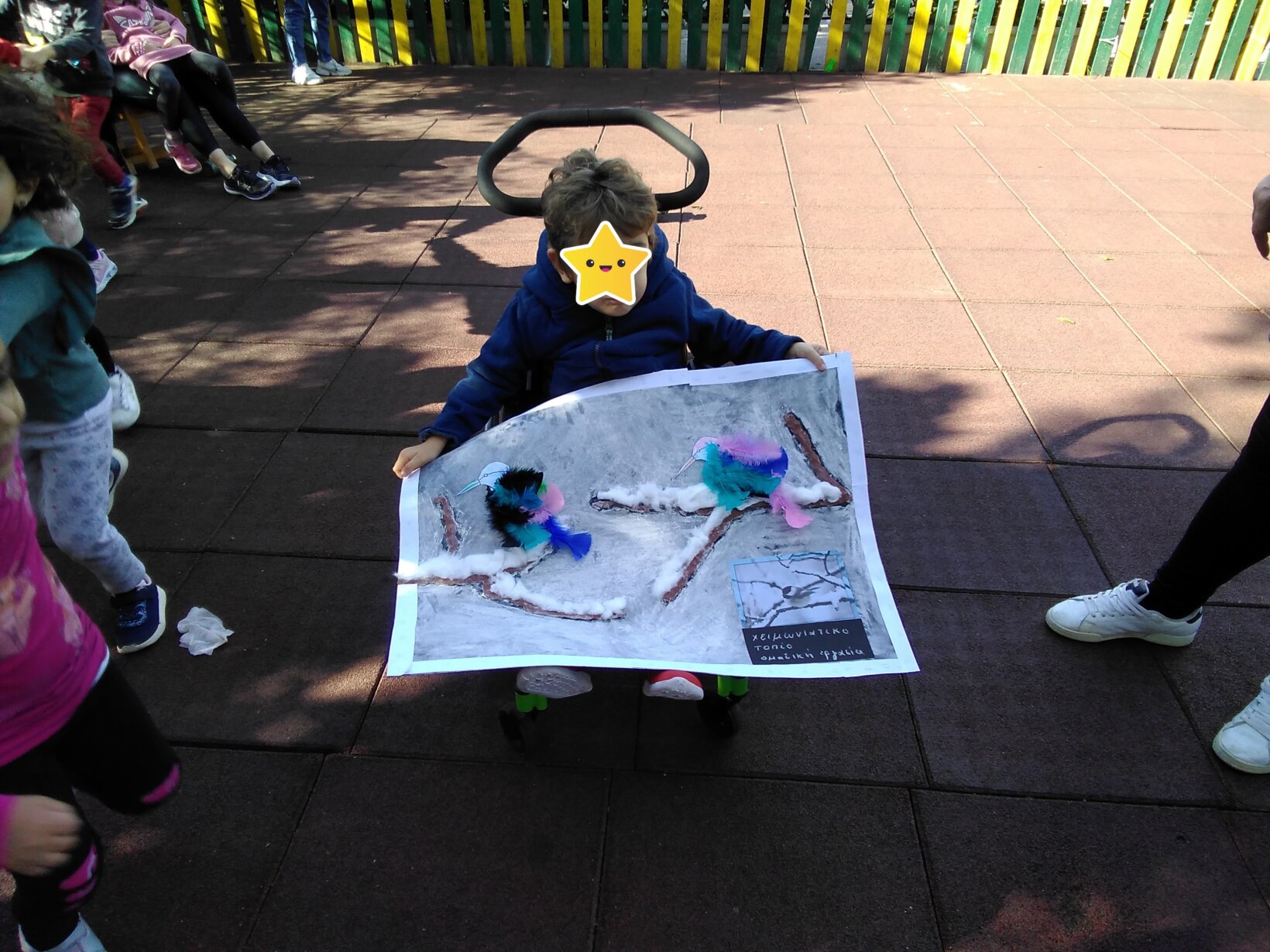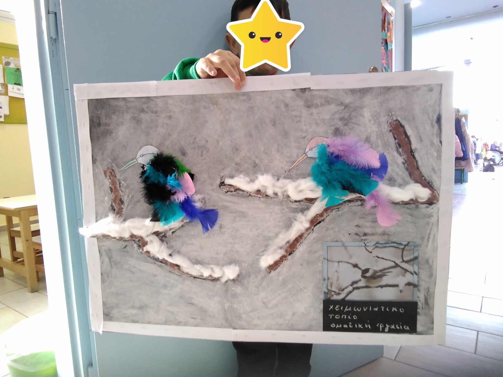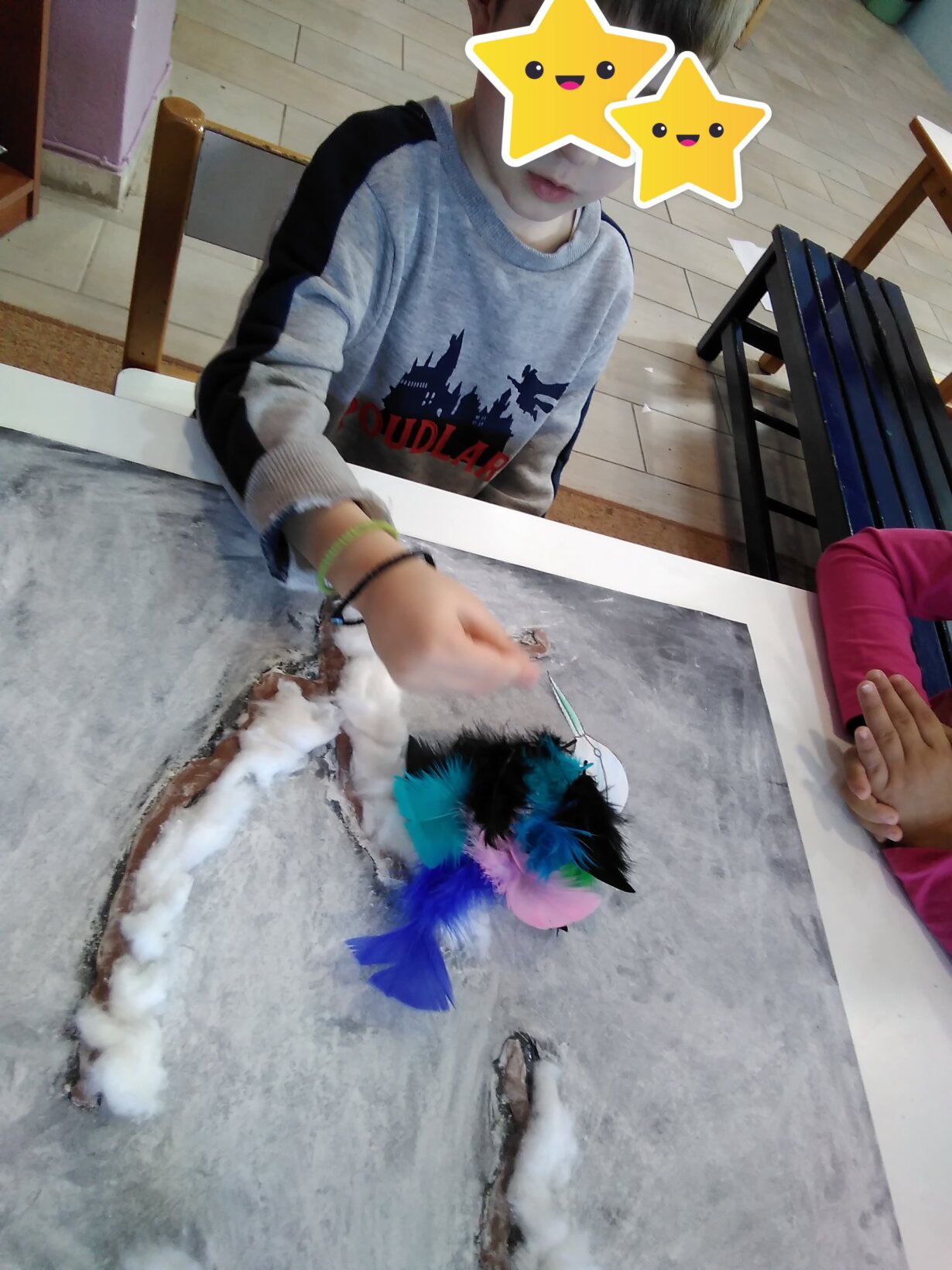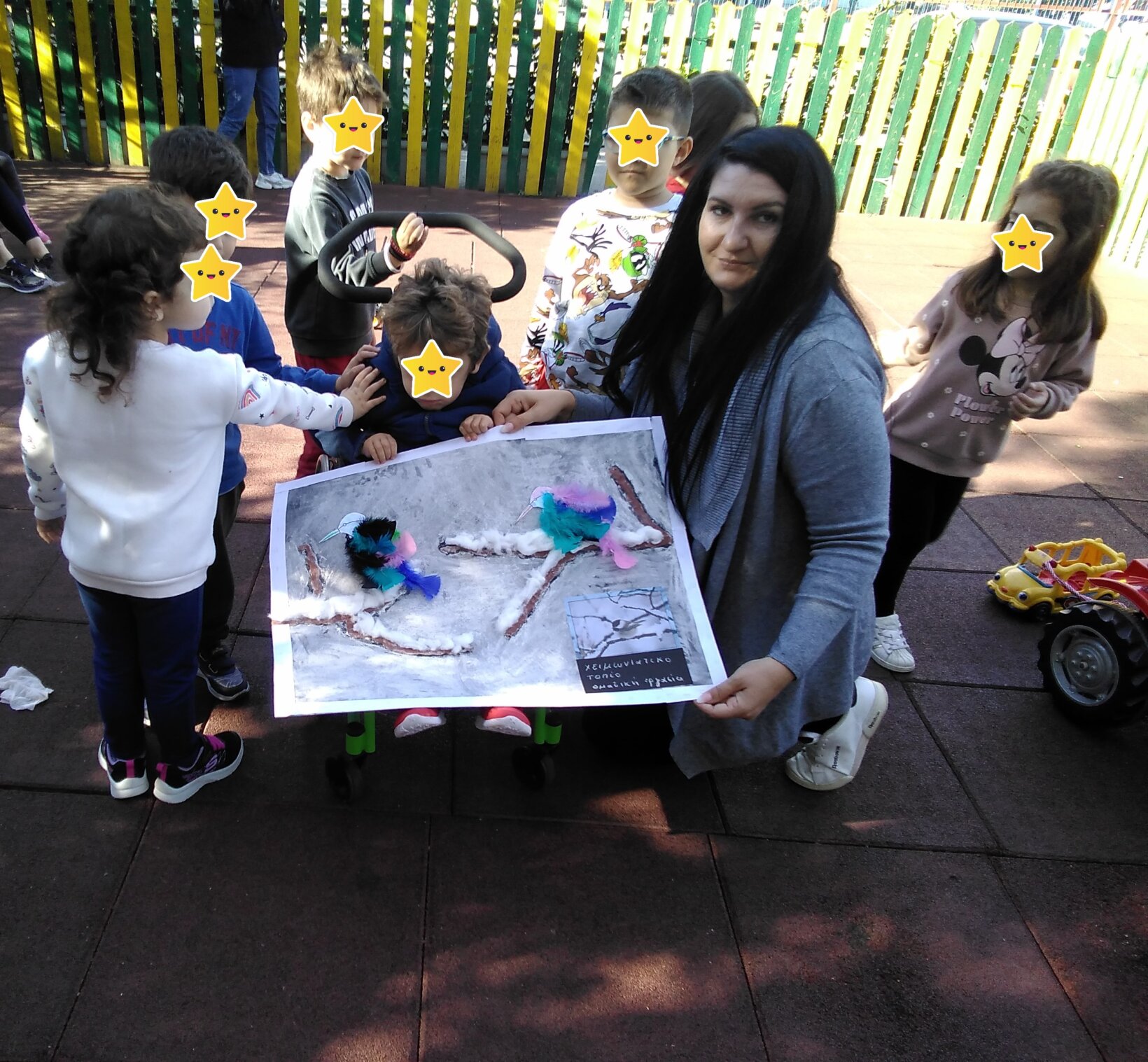 με πλαστελίνη για τα κλαδιά, κιμωλίες και βαμβάκι για το χιόνι , φτερά που κόλλησαν στα πουλάκια , βγήκε ένας υπέροχος ομαδοσυνεργατικός πίνακας που απόλαυσαν τα παιδιά. Συγχαρητήρια σε όλα μας τα παιδιά!
