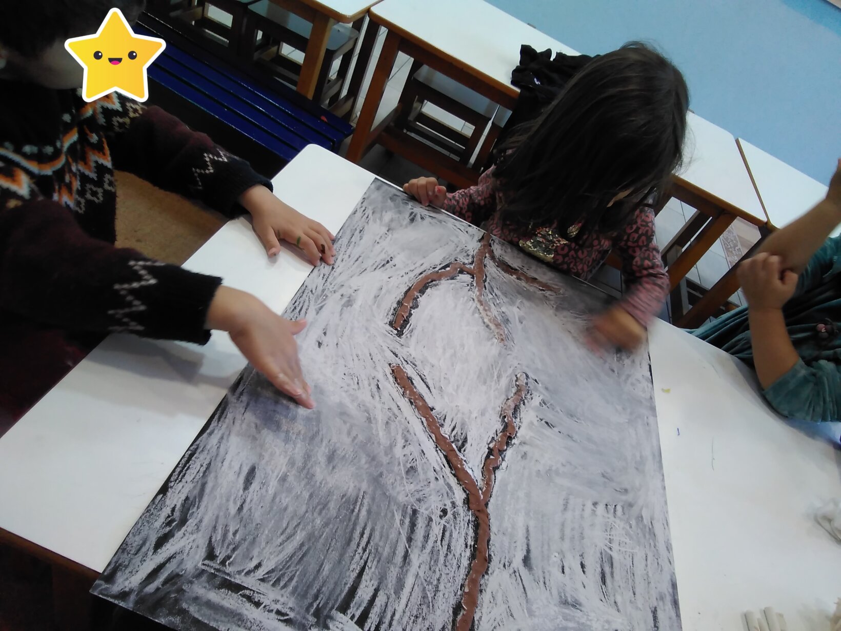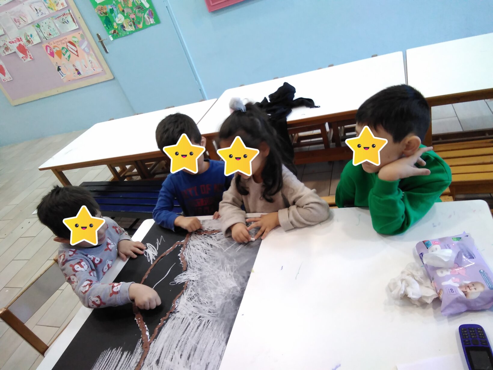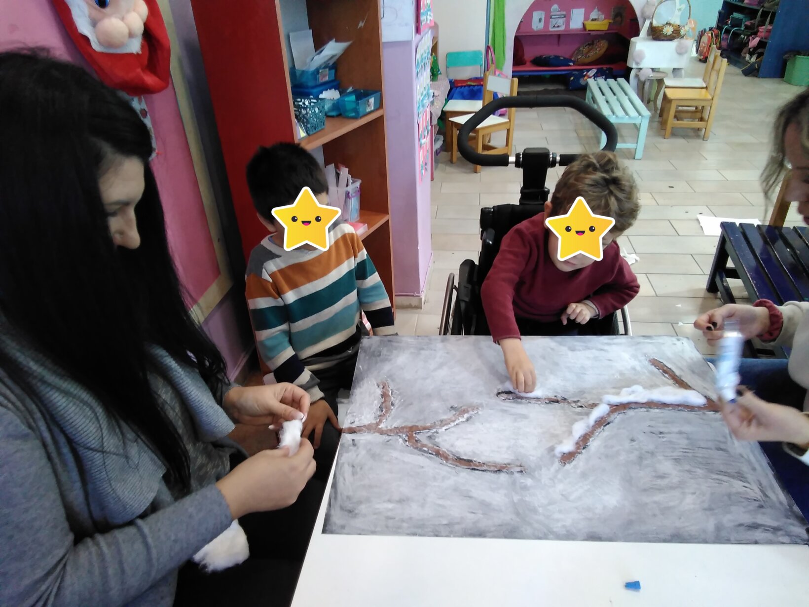 η ομάδα της στήλης της τέχνης με όλα τα παιδιά ανά ομάδες δημιούργησαν σύνθεση εικαστική με τίτλο χειμερινό τοπίο εμπνευσμένη από το πουλάκι του χειμώνα.