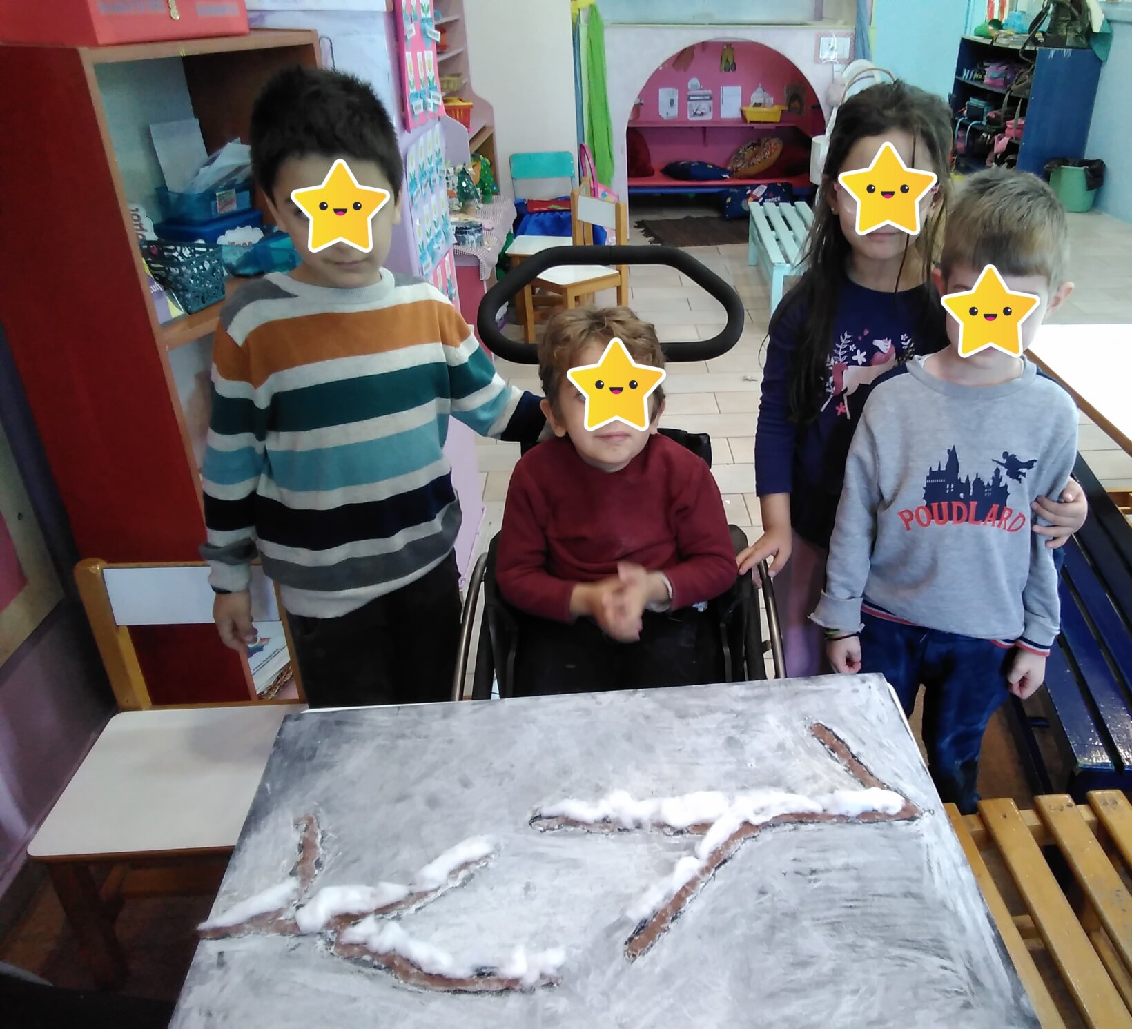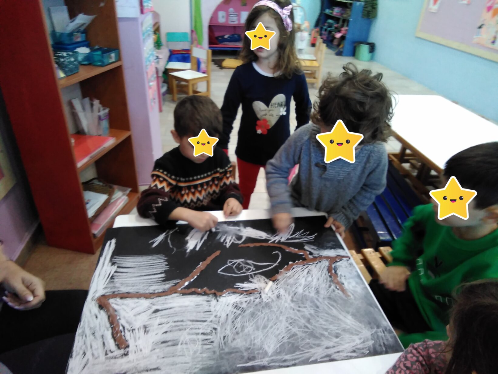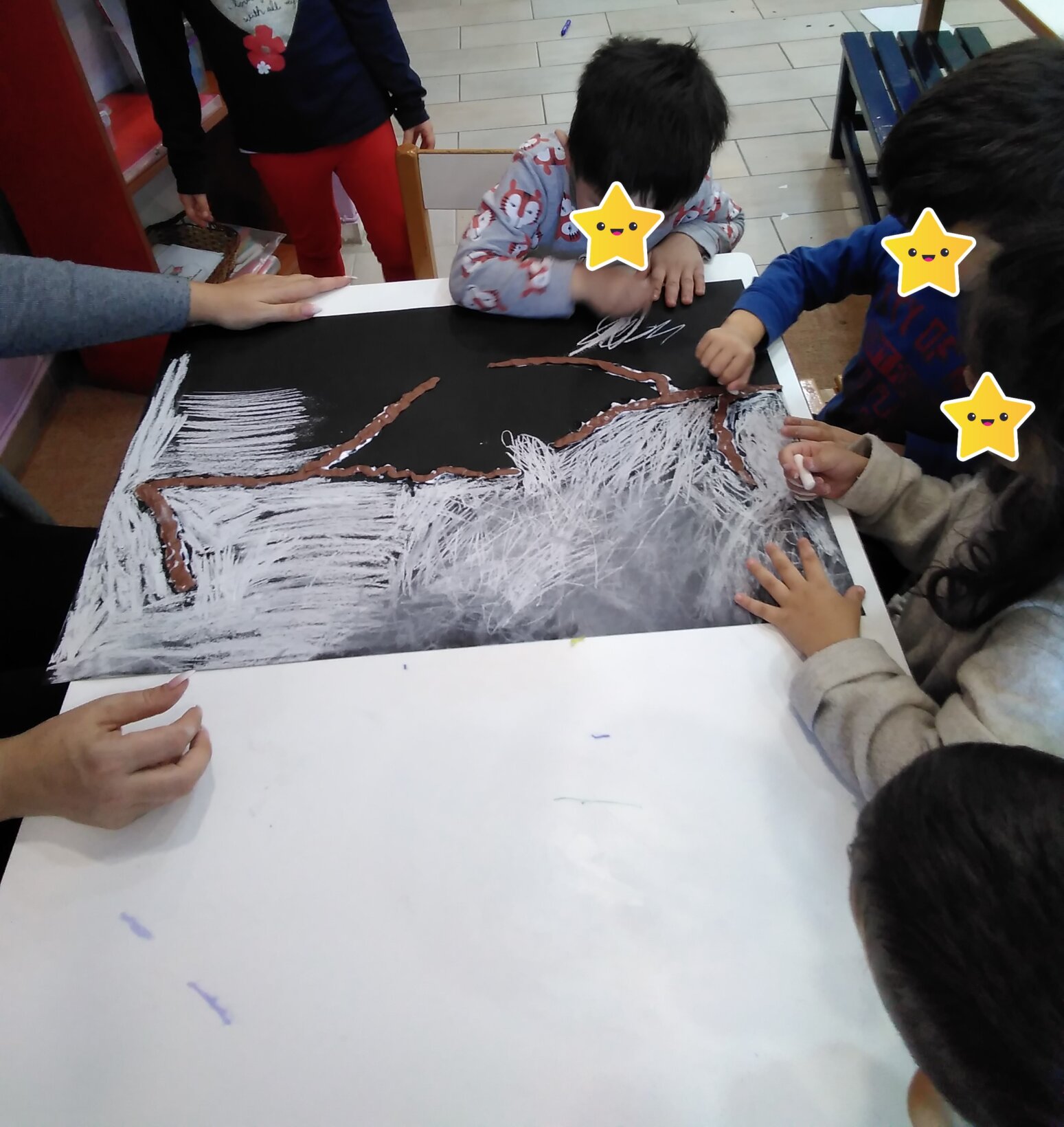 η ομάδα της στήλης της τέχνης με όλα τα παιδιά ανά ομάδες δημιούργησαν σύνθεση εικαστική με τίτλο χειμερινό τοπίο εμπνευσμένη από το πουλάκι του χειμώνα.