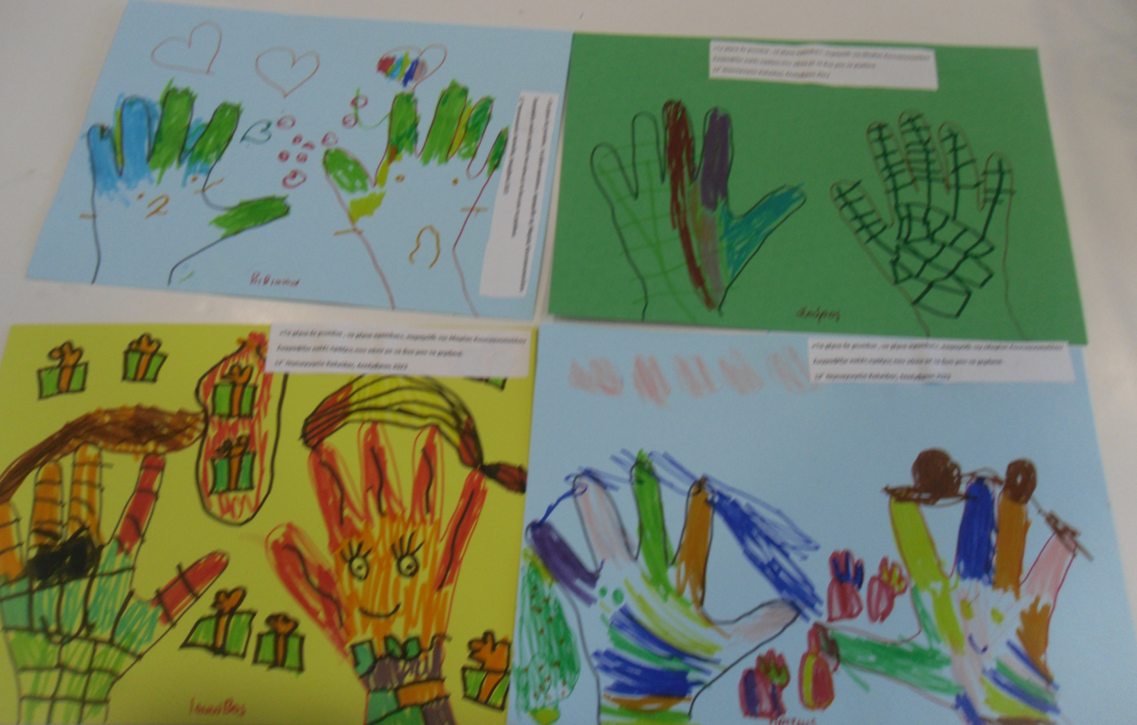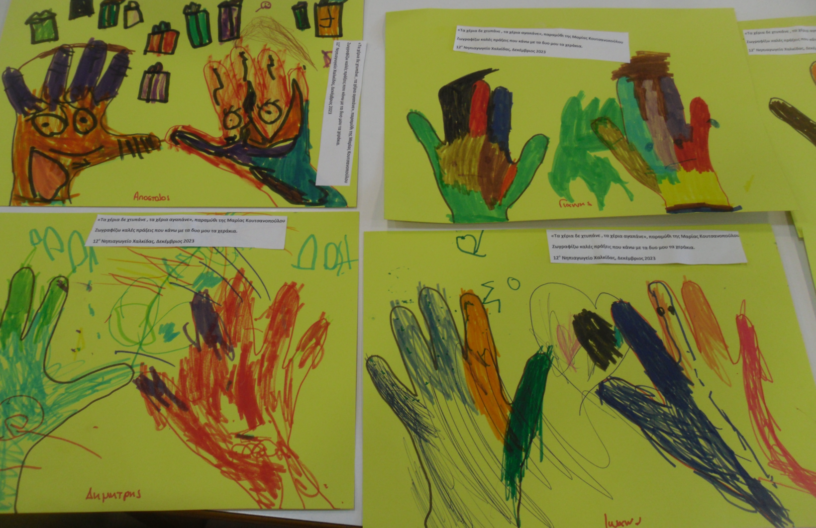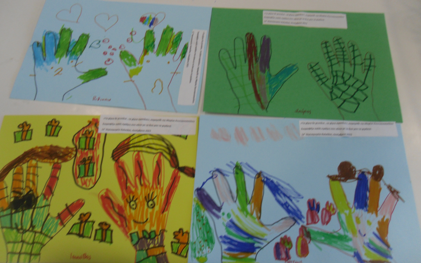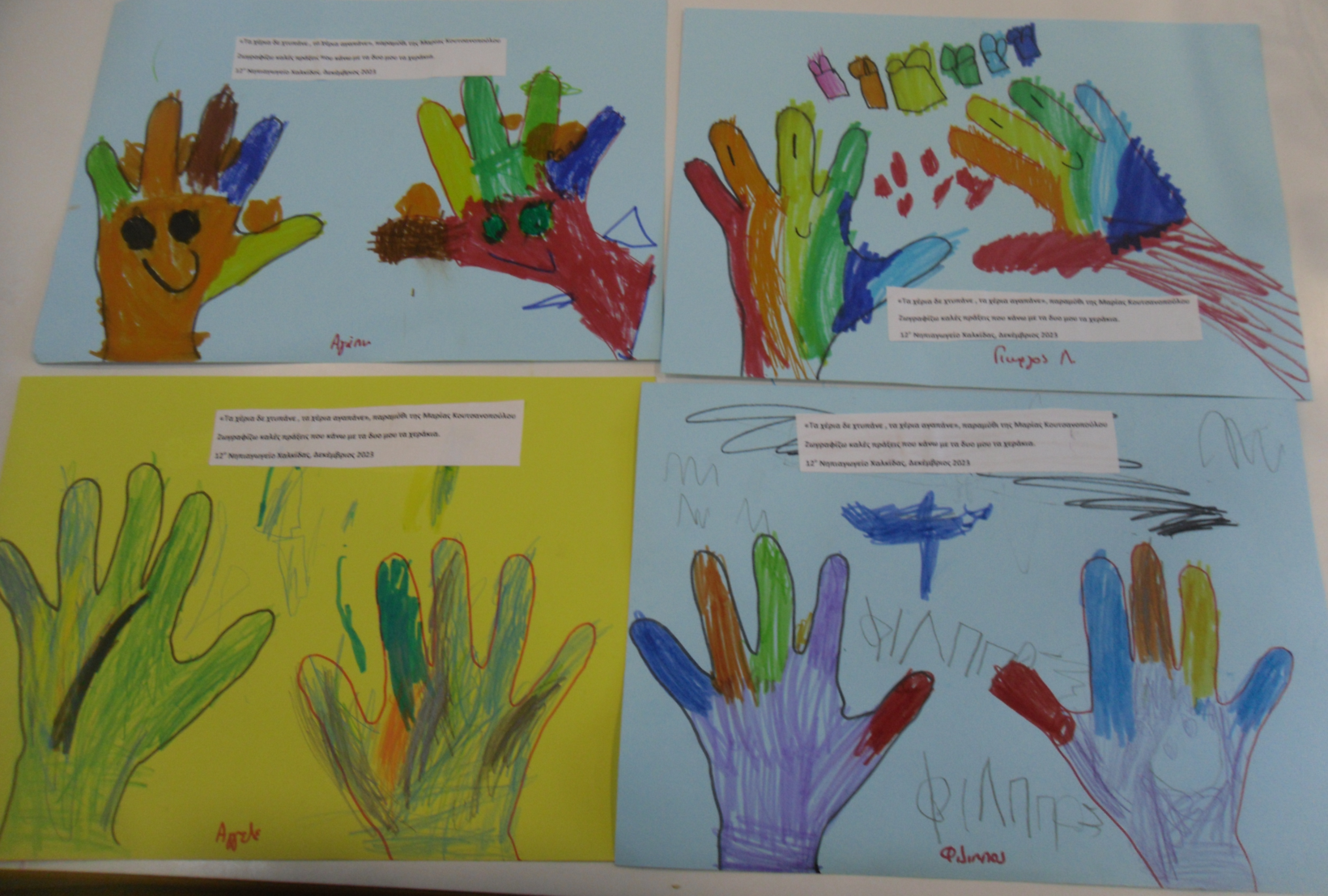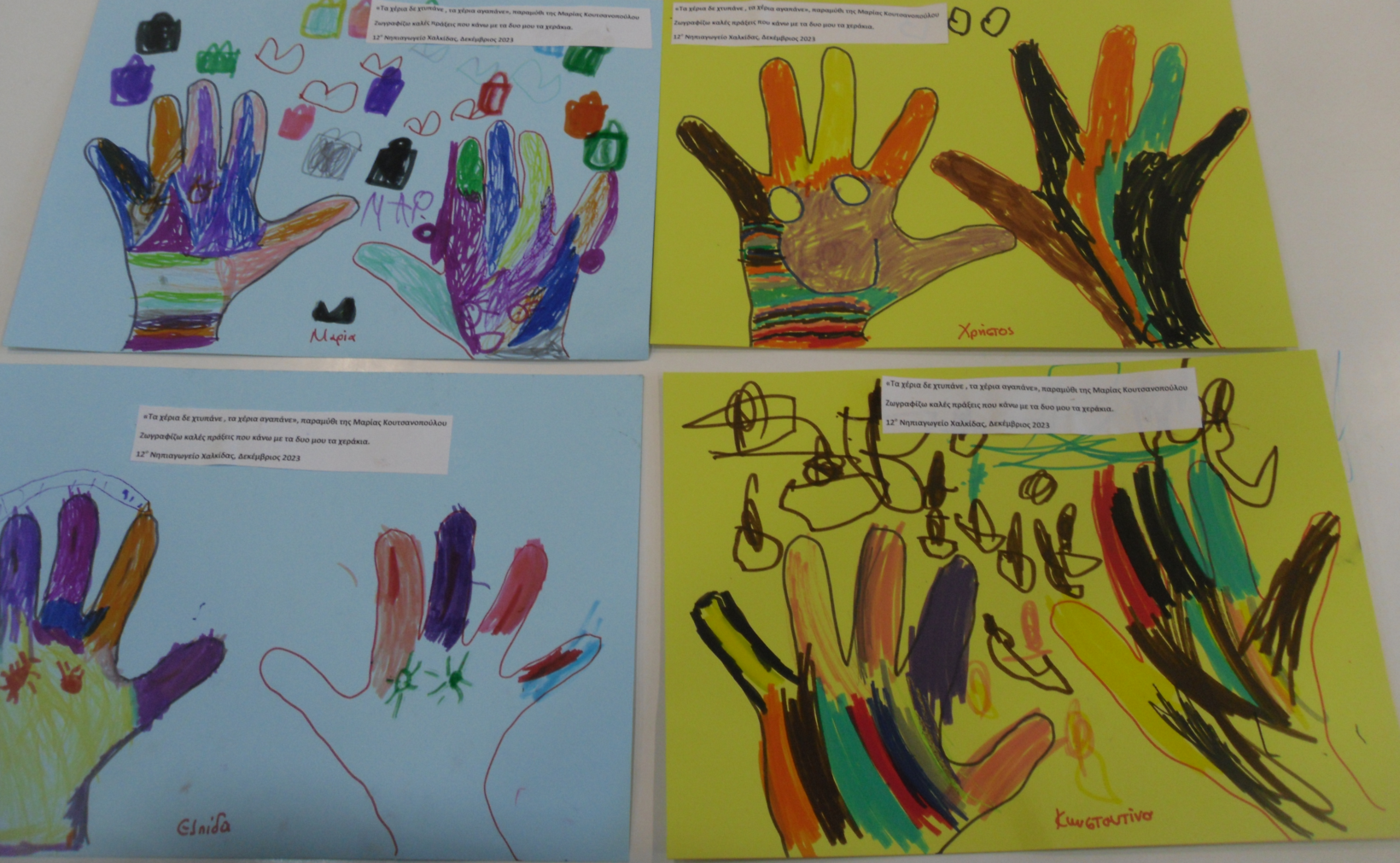Έγινε αγορά ενός νέου Χριστουγεννιάτικου βιβλίου που θα εμπλουτίζει τη βιβλιοθήκη μας με τίτλο “τα χέρια δεν είναι να χτυπάνε τα χάρια αγαπάνε τα Χριστούγεννα “. Τα παιδιά ζωγράφισαν τις καλές πράξεις που μπορούν να κάνουν με τα δυο τους χεράκια.
