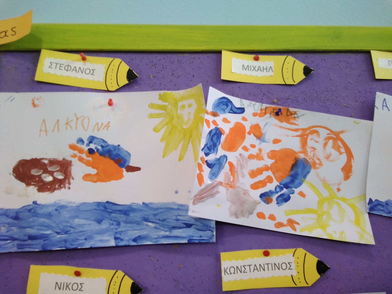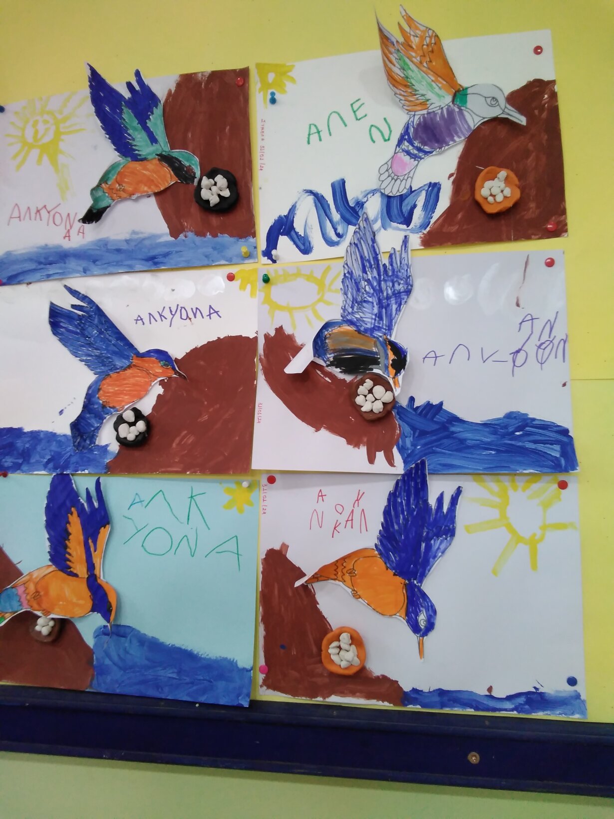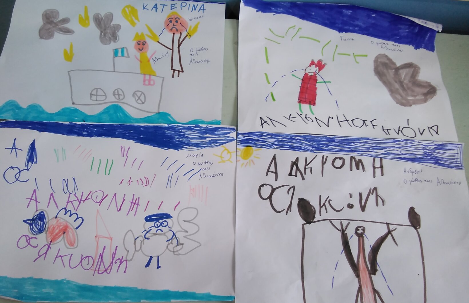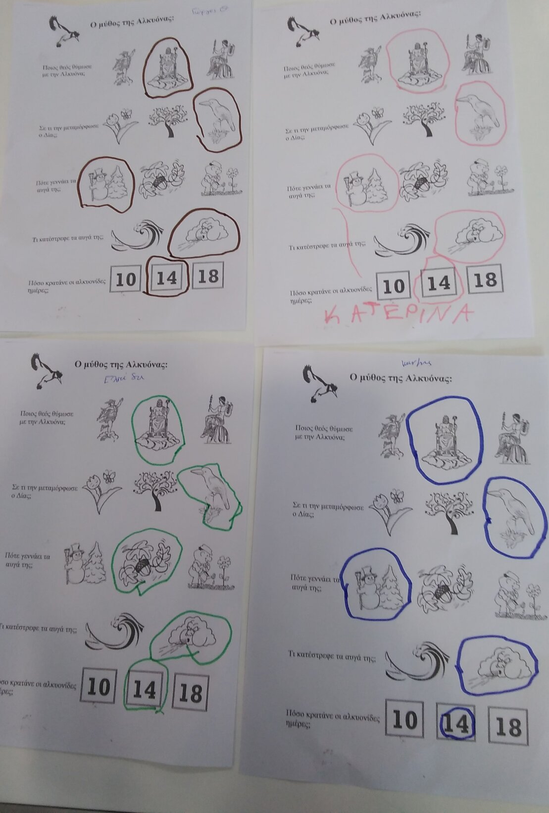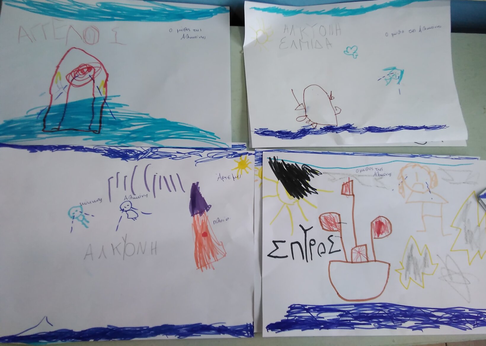 Τα παιδιά ζωγράφισαν τον μύθο, ζωγράφισαν την αλκυόνη πουλί σε έτοιμο φύλλο εργασίας έγραψαν όπως μπορούν την λέξη αλκυόνη, συμπλήρωσαν φύλλα εργασίας γλώσσας και μαθηματικών και δημιούργησαν πίνακα ζωγραφικής σχετικές με το θέμα.